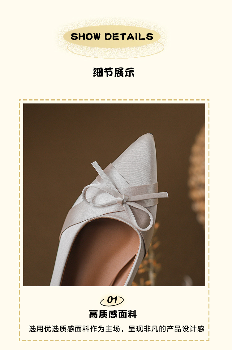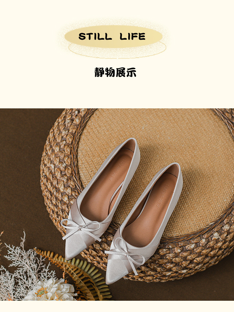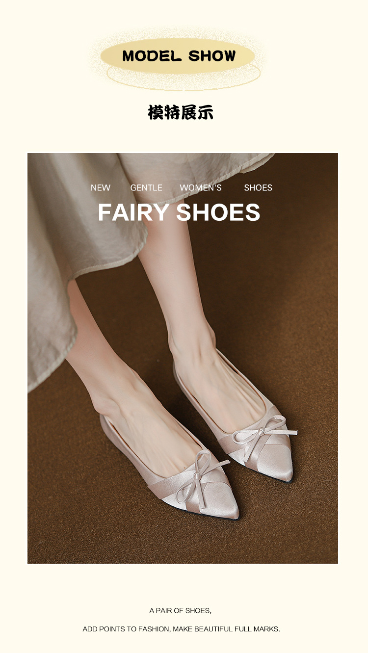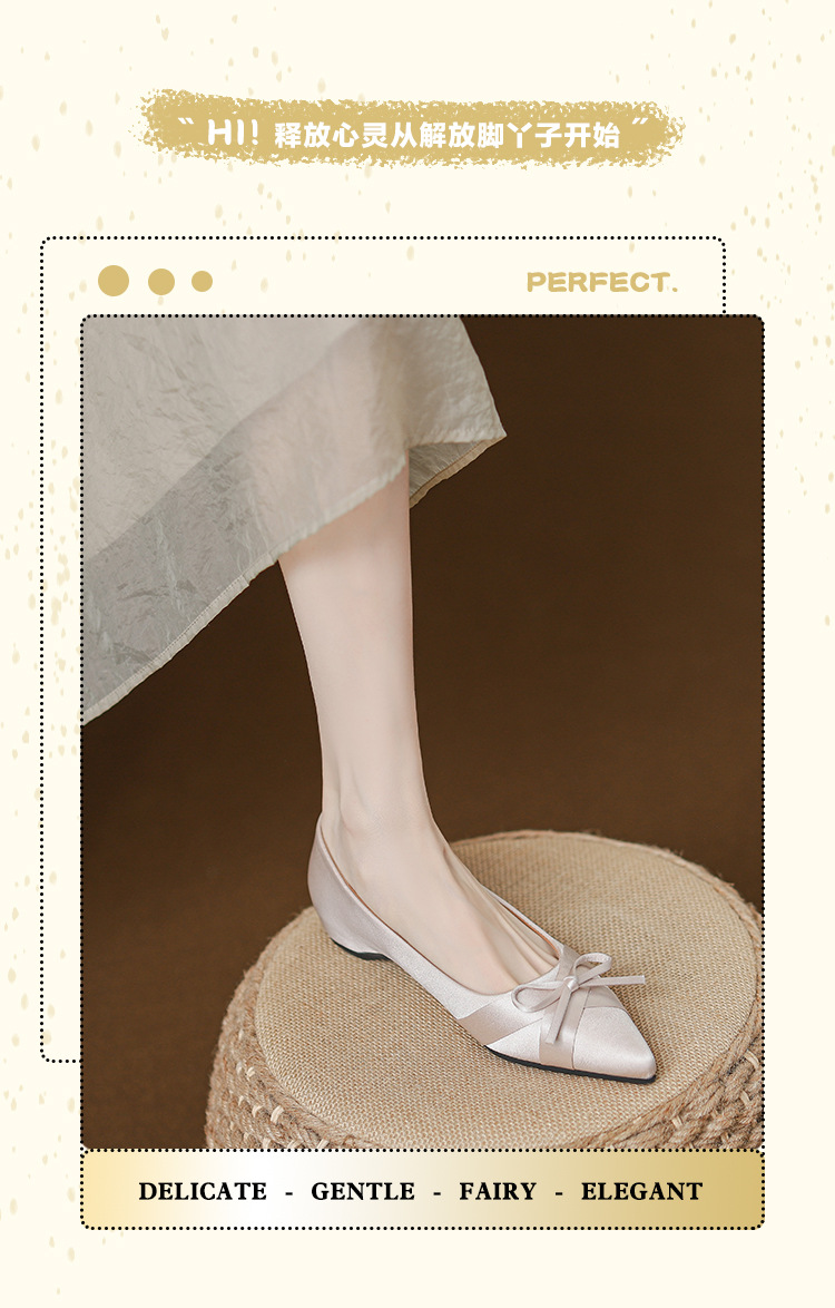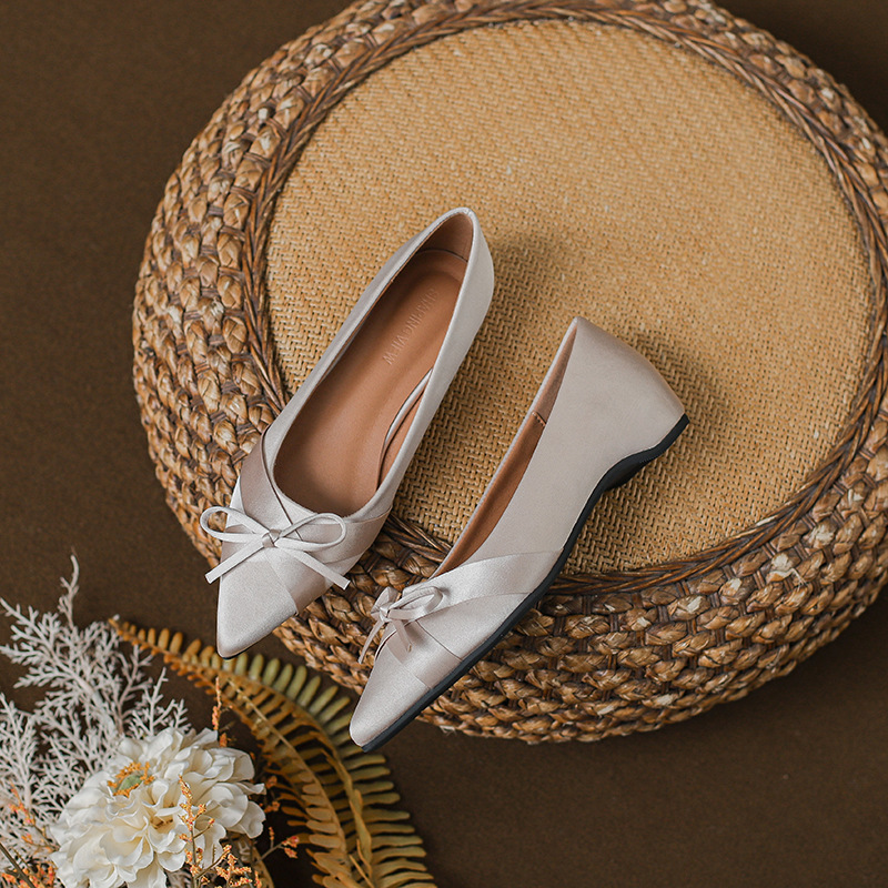프랑스 스타일의 부드러운 신부 웨딩 슈즈, 여성용 플랫 새틴 포인티드 토 싱글 슈즈, 2026년 신상, 우아한 리본 장식의 작은 굽 슈즈