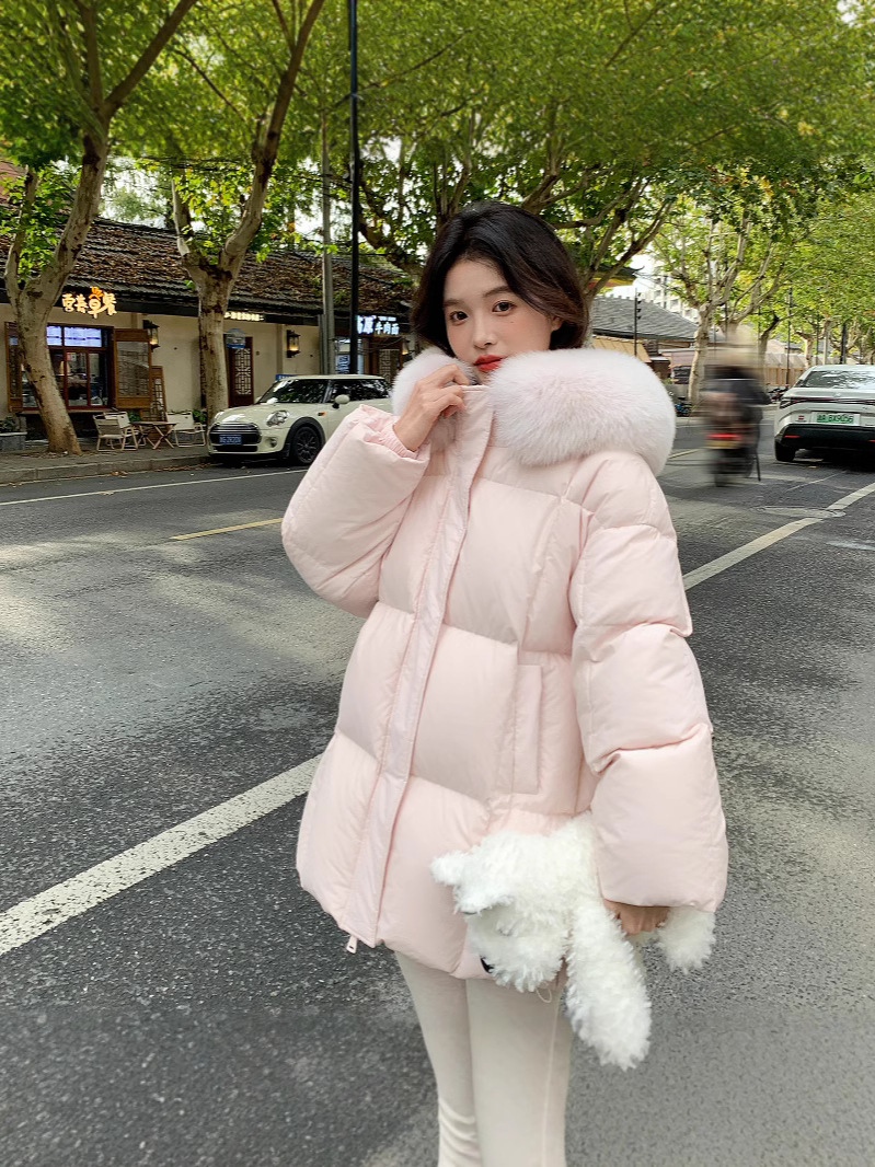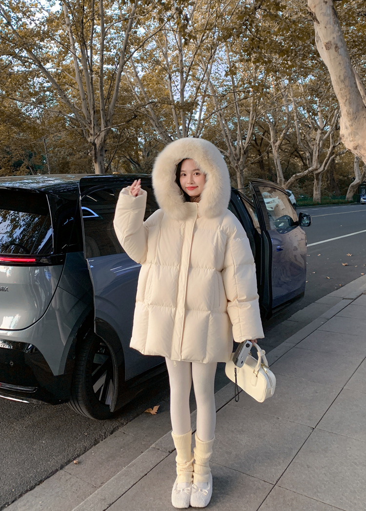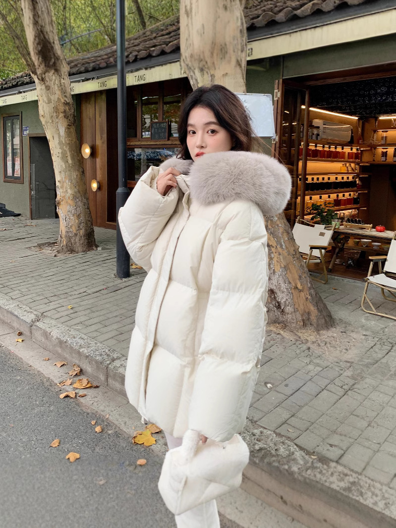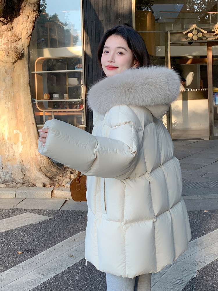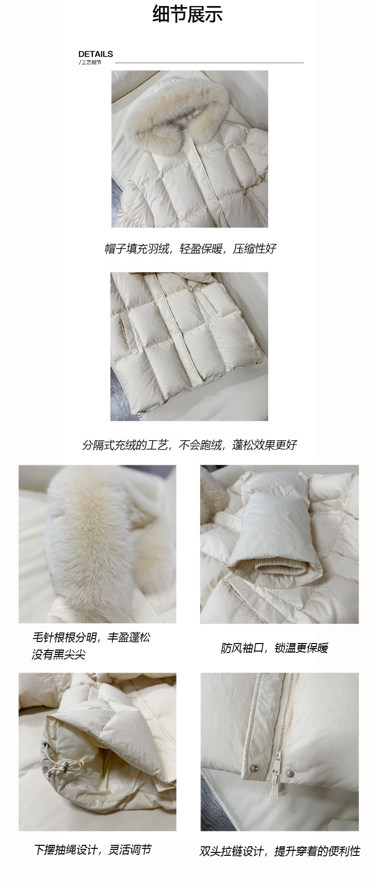 모스크바의 겨울 신상품, 작은 사이즈의 후드가 달린 큰 모피 칼라 다운 재킷, 여성용 중간 길이 2025년 화이트 덕다운 코트