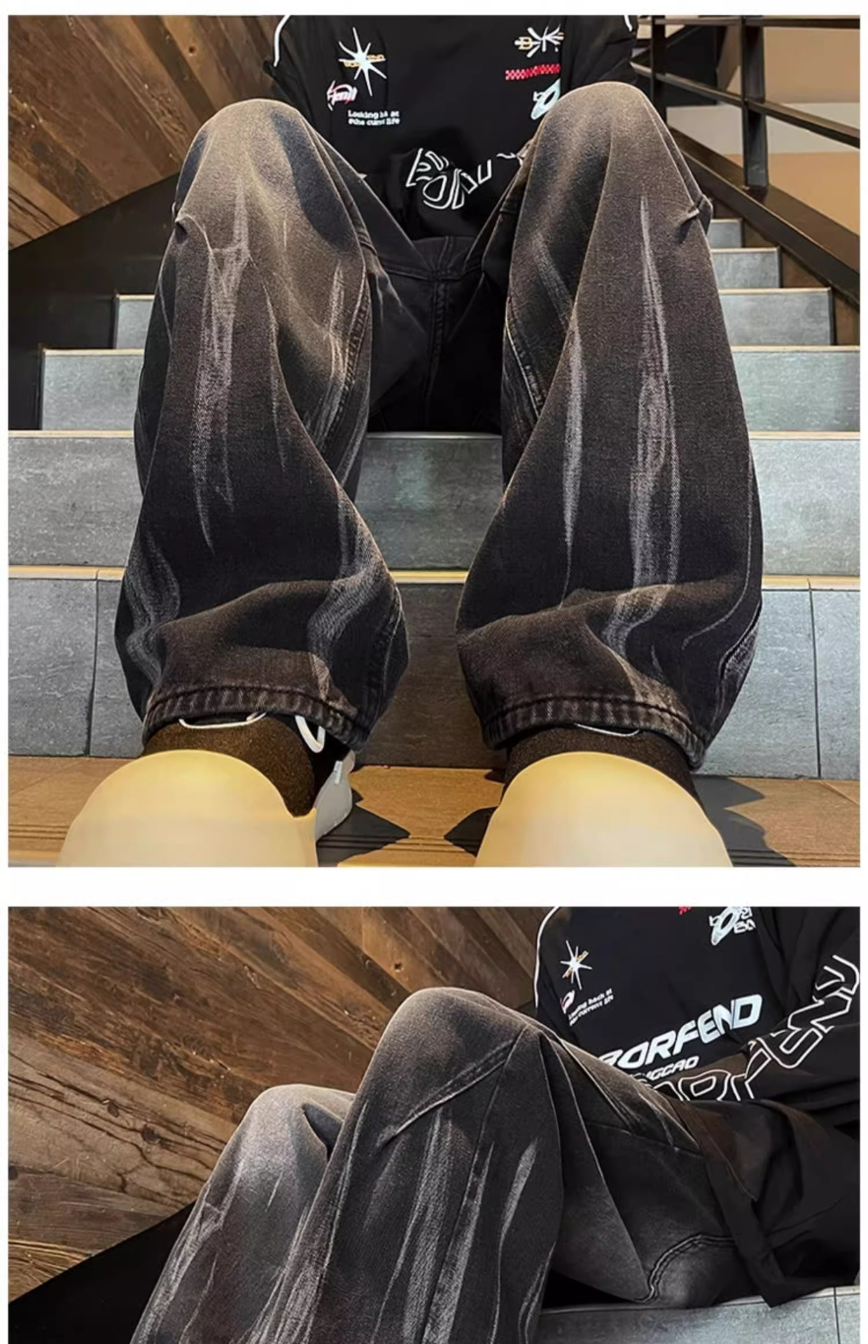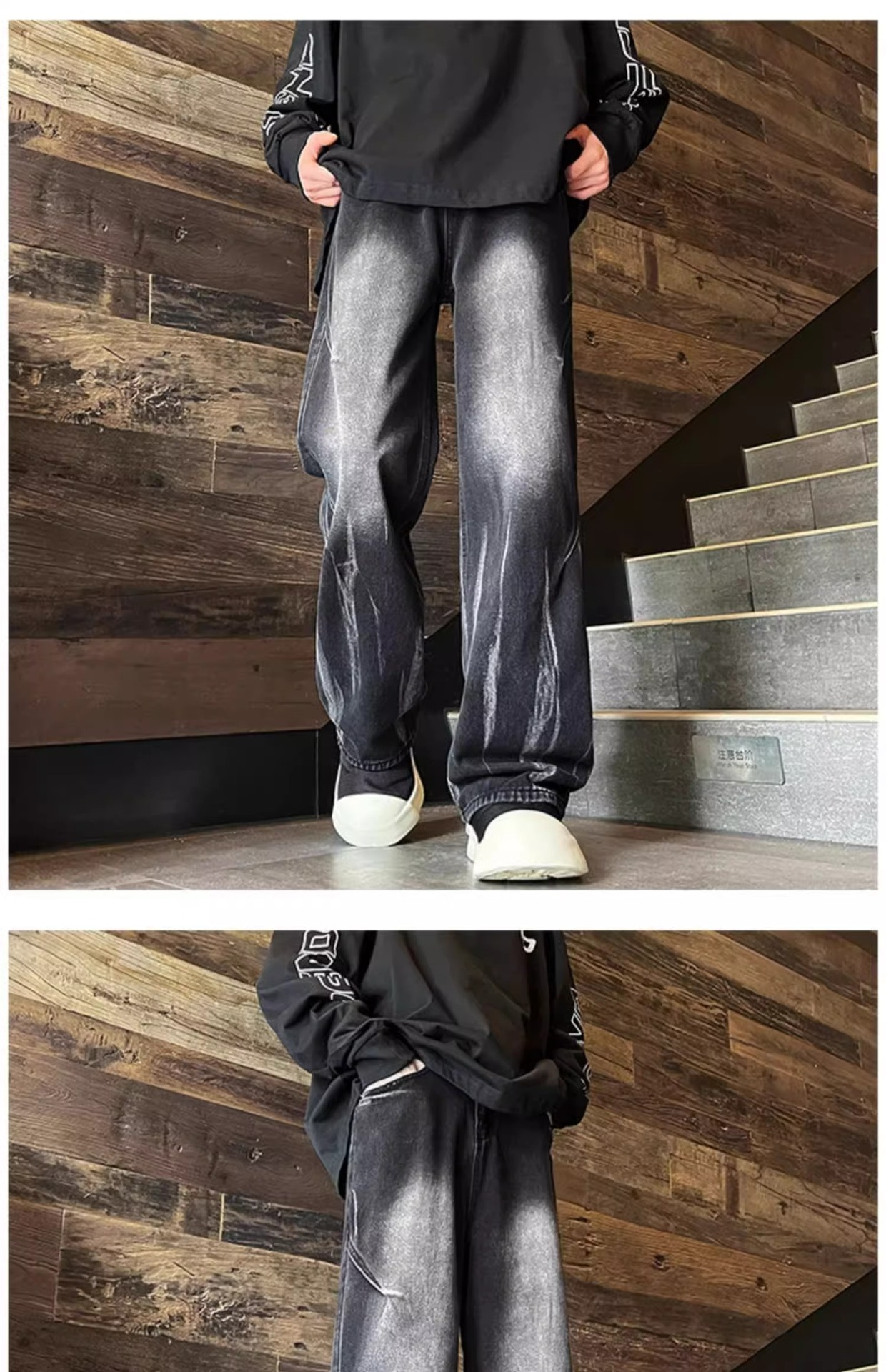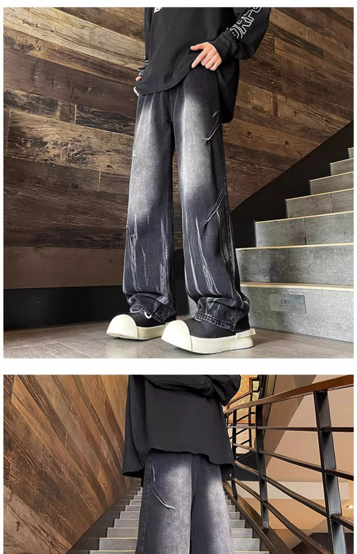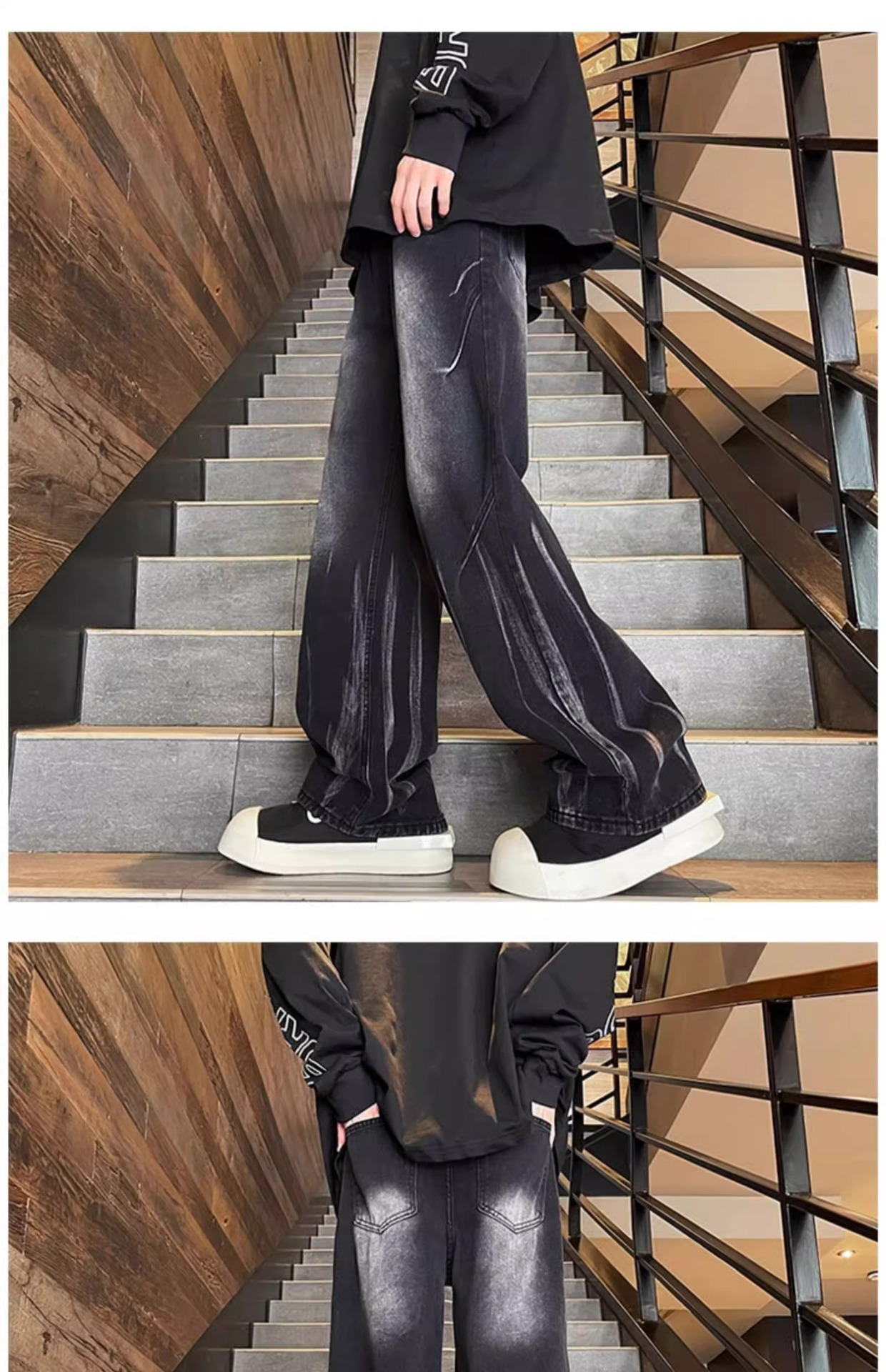 아메리칸 스타일 레트로 타이-다이 청바지 남성 봄과 가을 세척 그라디언트 하이 스트리트 바이브 스타일 느슨한 직선 다리 넓은 다리 바지