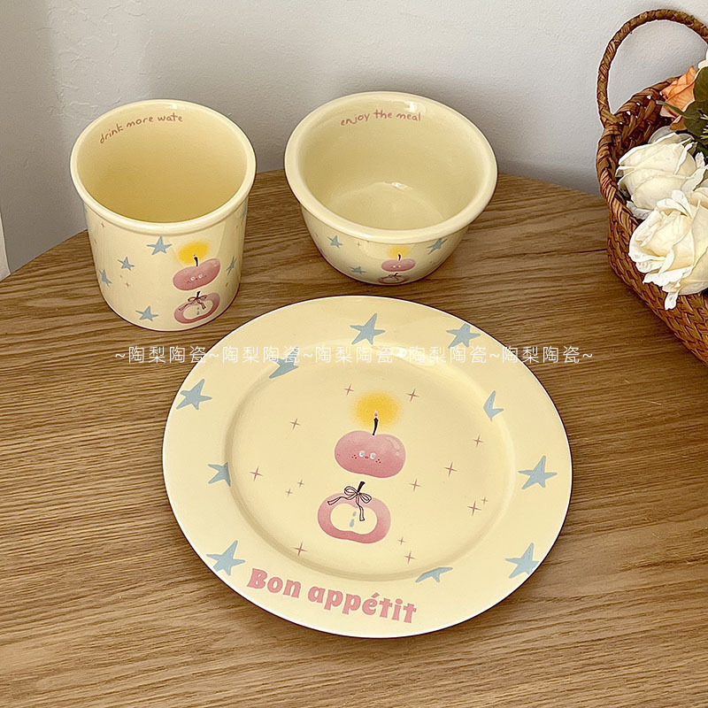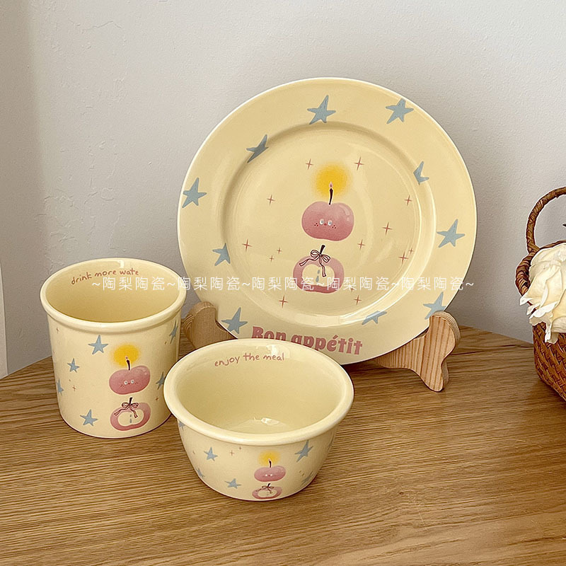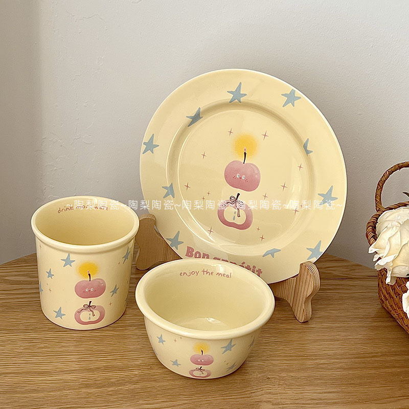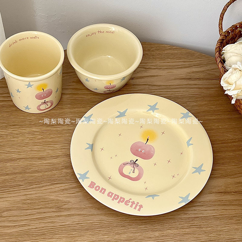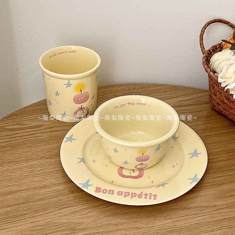 인스 스타일 크림 스타 애플 식기 가정용 세라믹 밥 그릇 휴대용 컵 접시 고급스러운 1인 식사 세트
