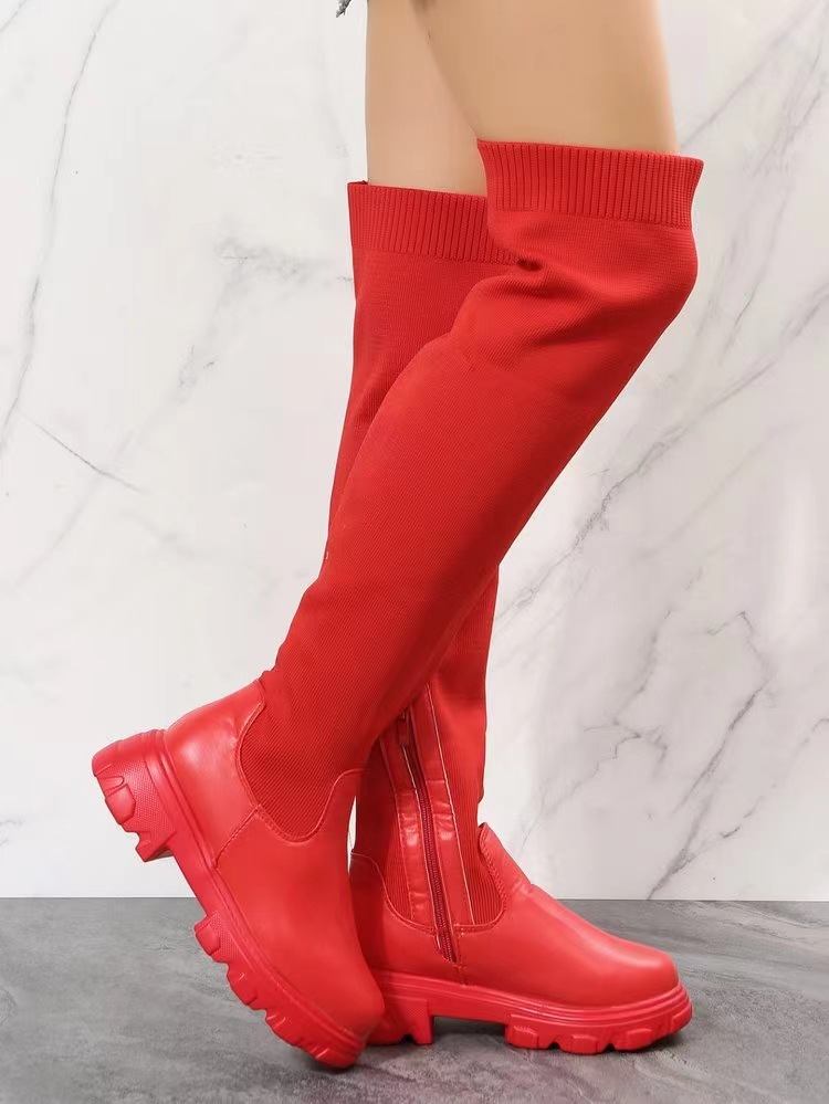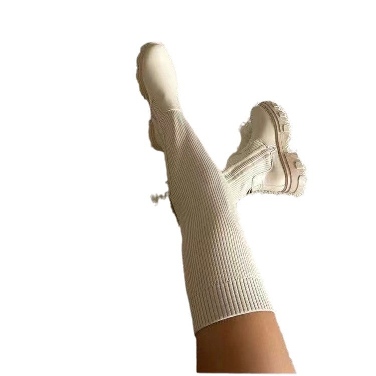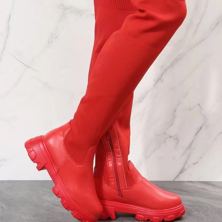 국경을 넘나 드는 유럽과 미국 가을과 겨울 두꺼운 바닥 둥근 머리 니트 스티칭 무릎 위 여성용 부츠 2021 플러스 사이즈 탄성 플라이 짠 양모 부츠
