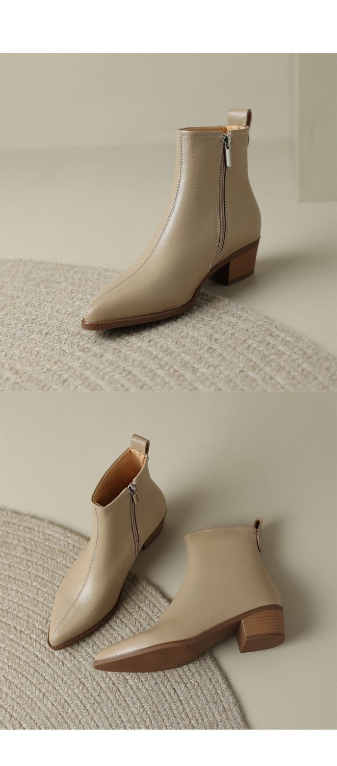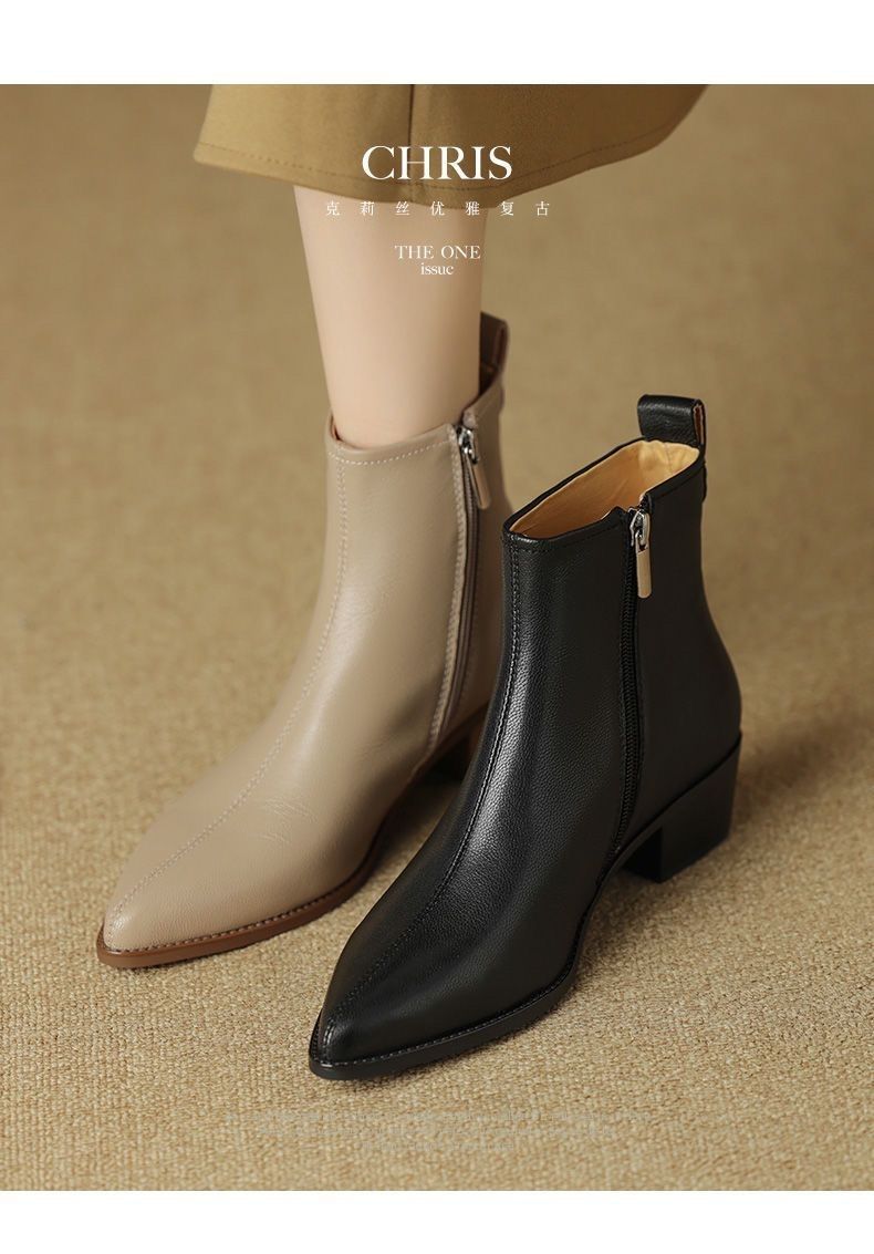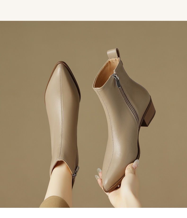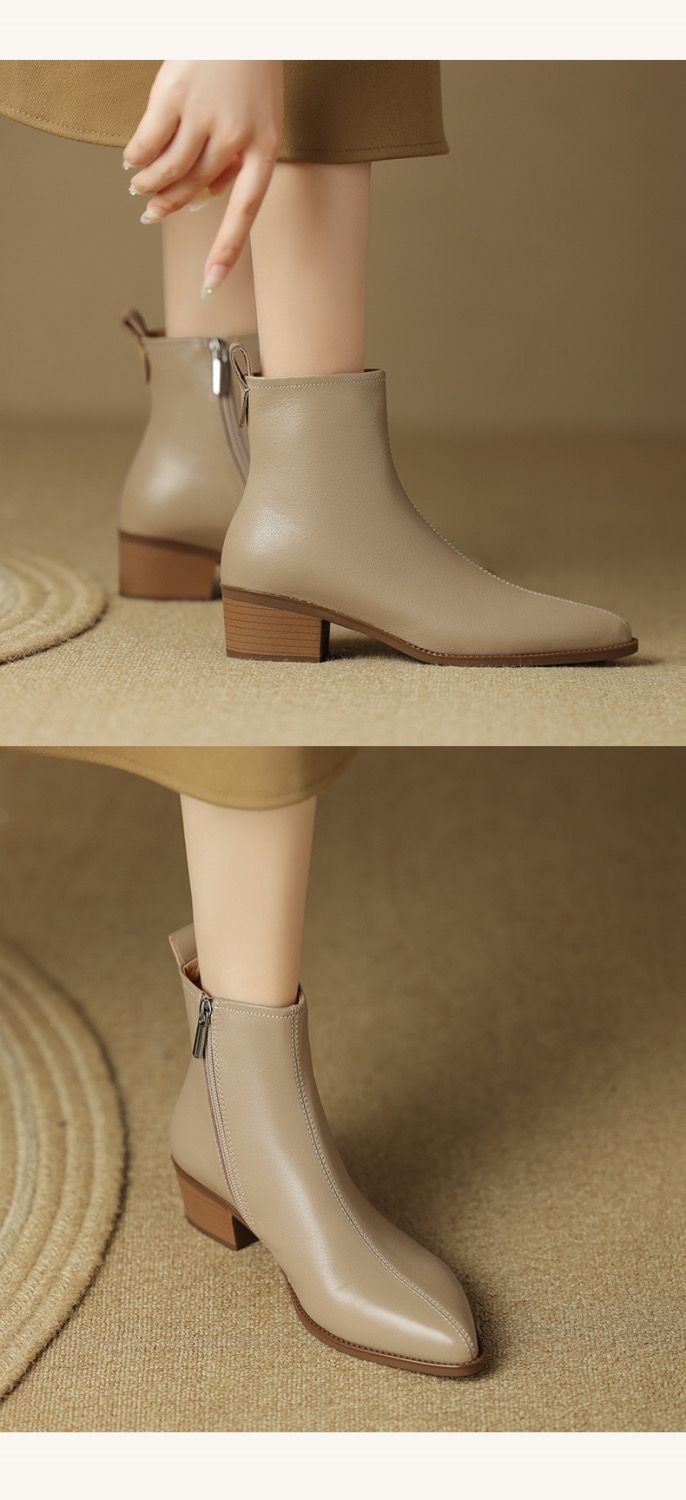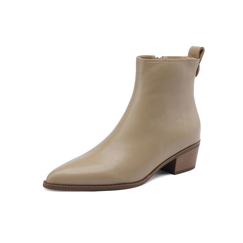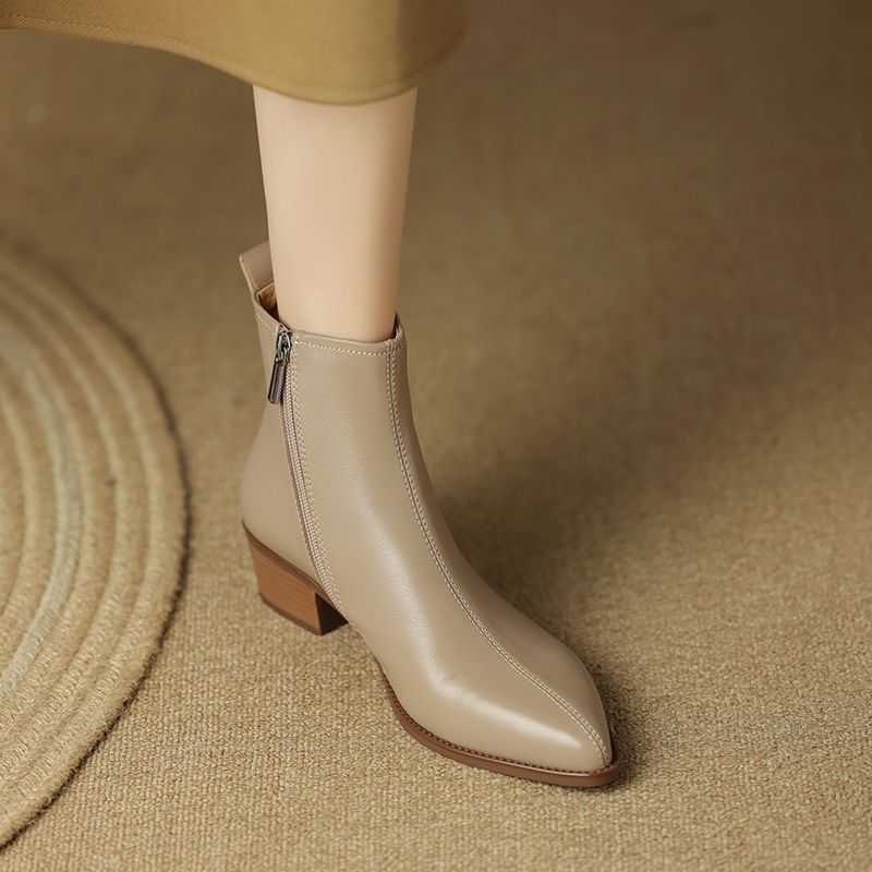프렌치 스타일 부드러운 가죽 가을 겨울 여성용 뾰족코 숏부츠, 살구색 미들힐, 슬림하고 패셔너블하며 다재다능한 마틴부츠, 굵은 굽과 안감이 있는 앵클부츠