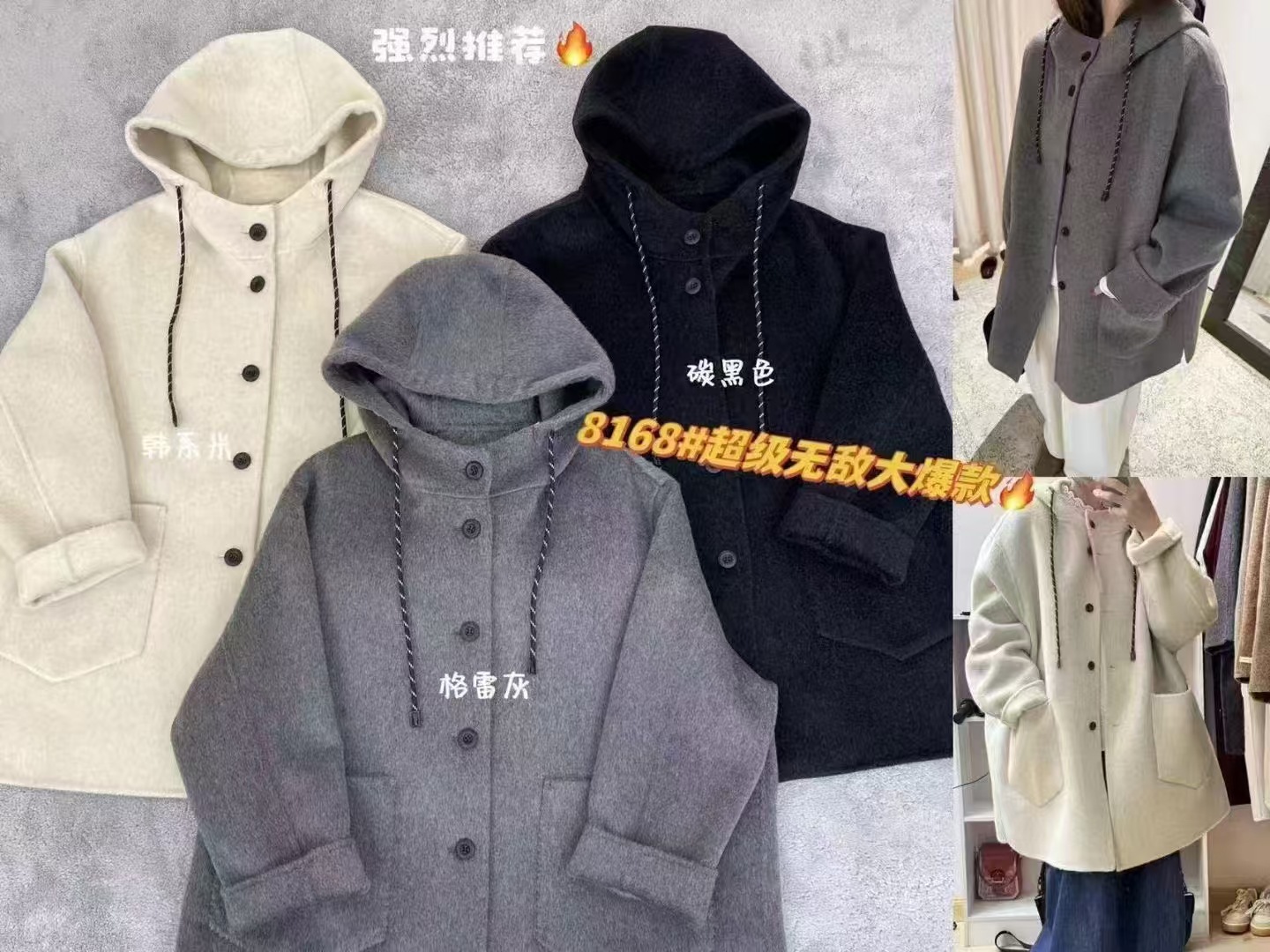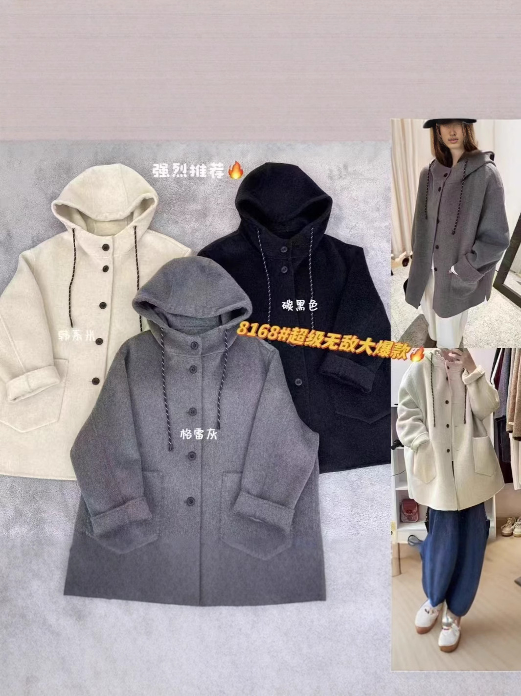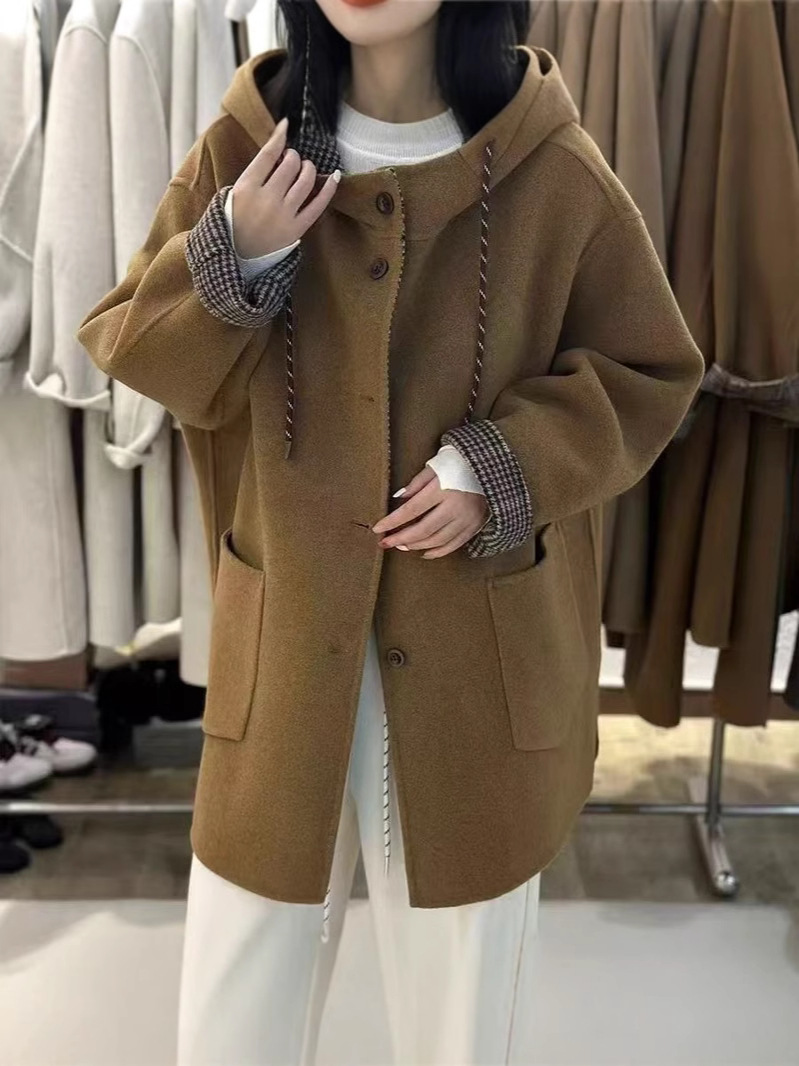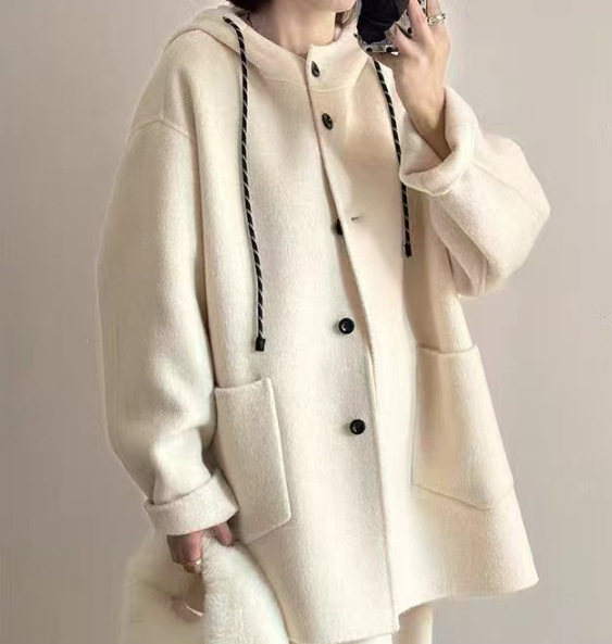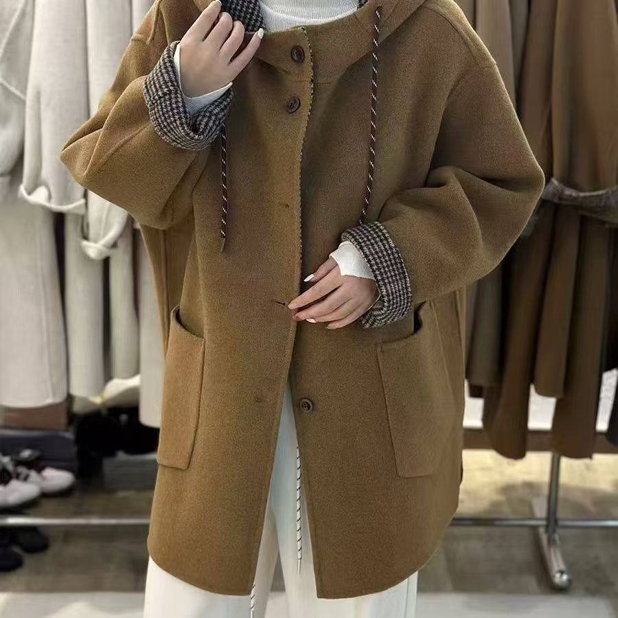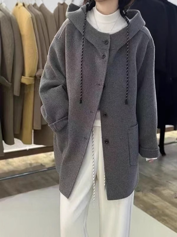 《특가》신상품 드로스트링 후드 양면 울 코트 중간 길이 루즈핏 슬리밍 울 코트