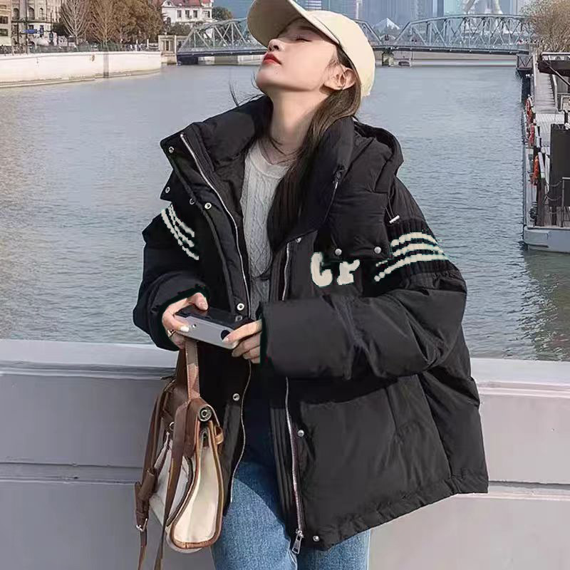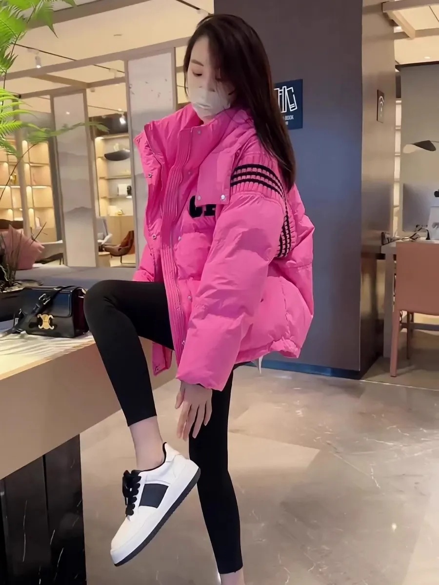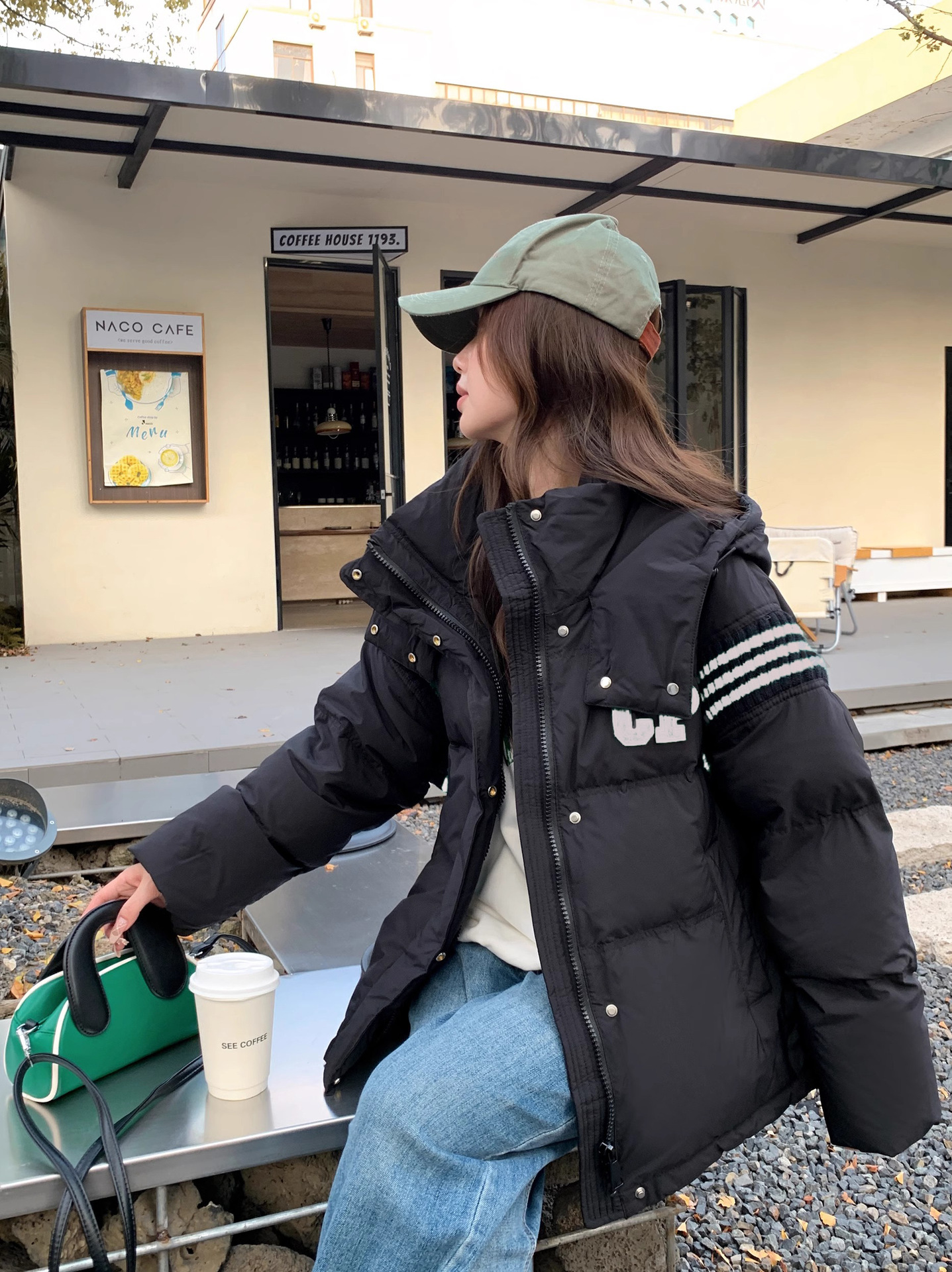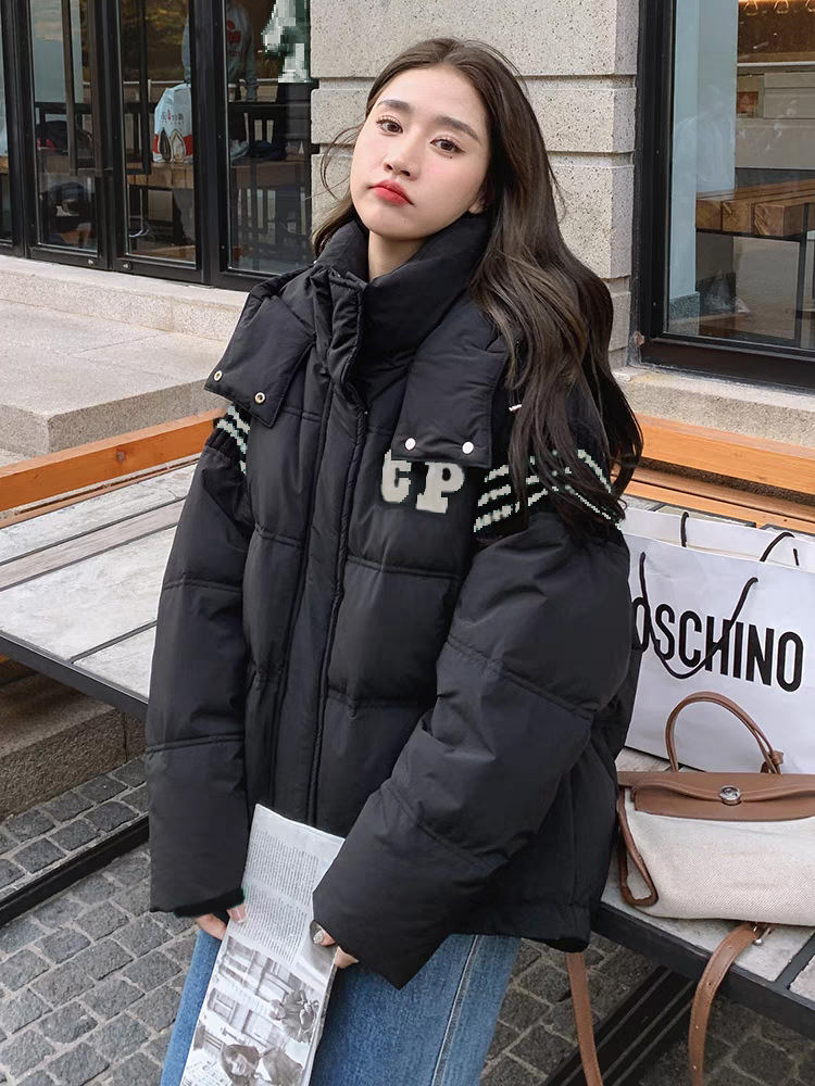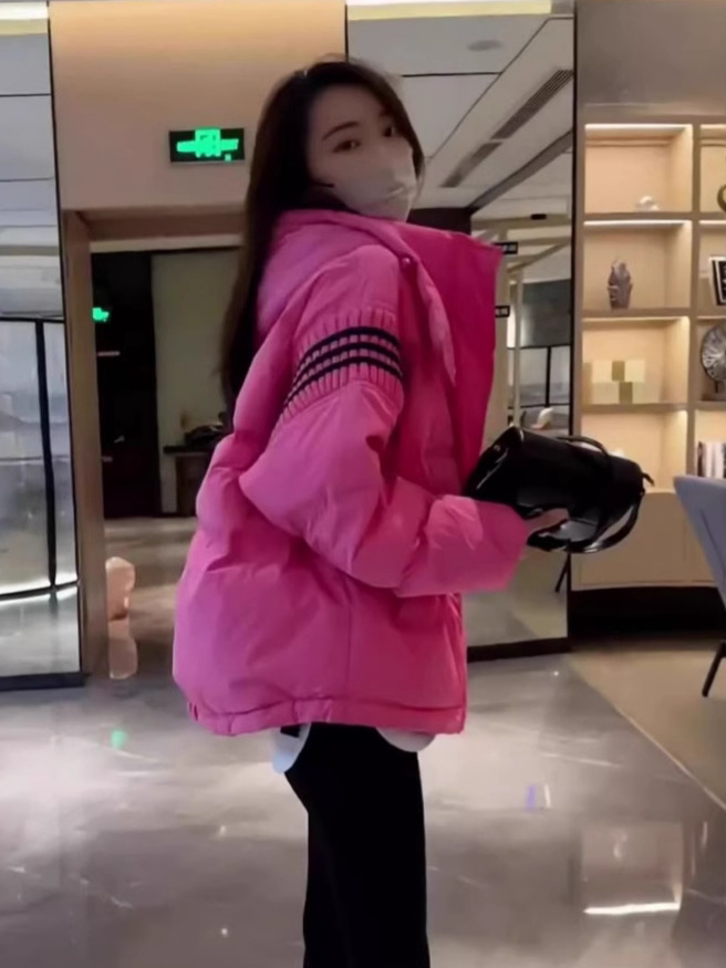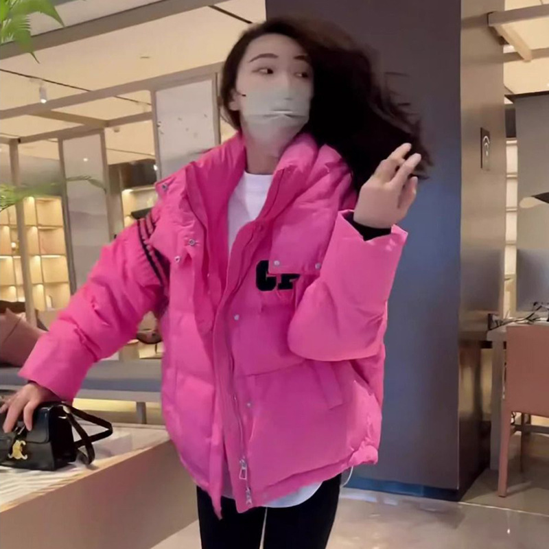 로즈 레드 후드 칼라 다운 코튼 패딩 재킷 여성의 겨울 새로운 니트 스티칭 코튼 패딩 재킷 루즈 코튼 패딩 재킷 캐주얼 빈티지 재킷