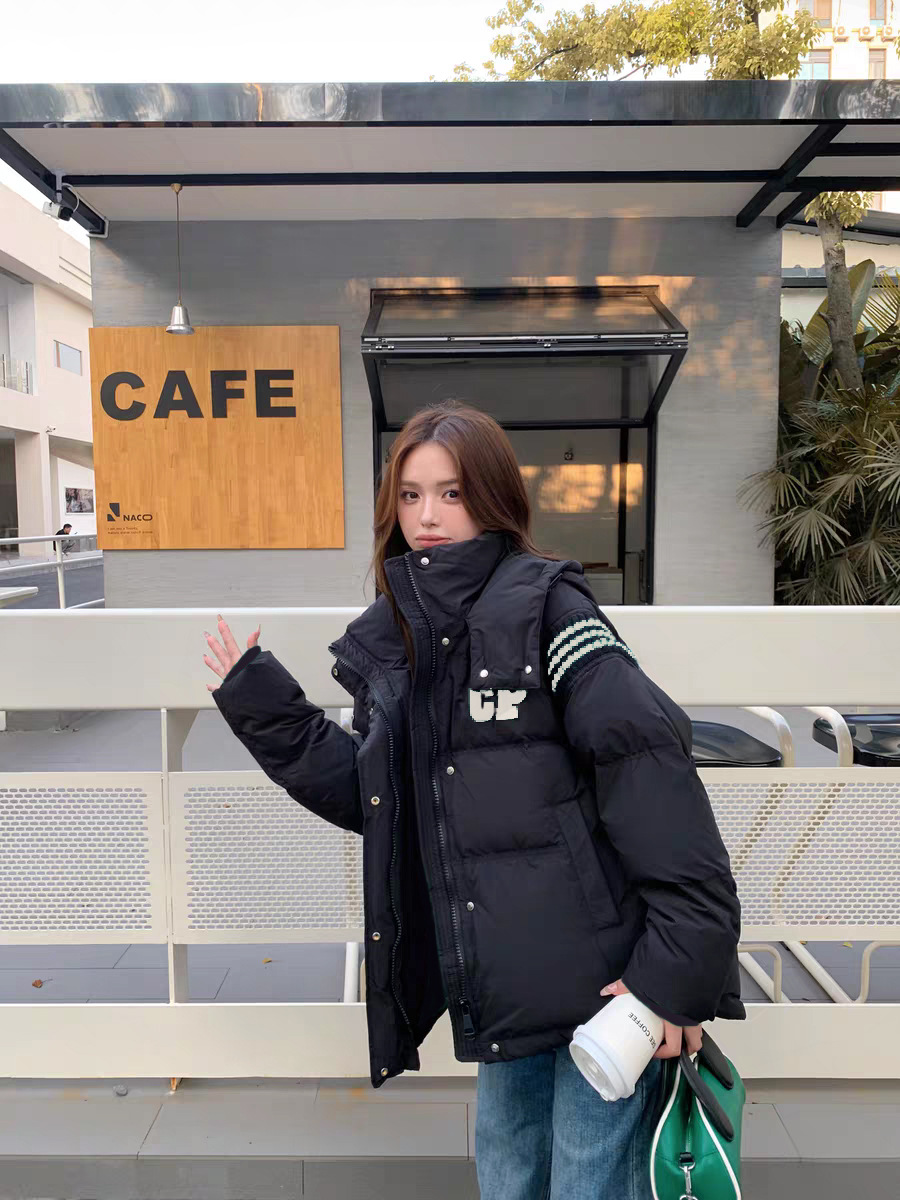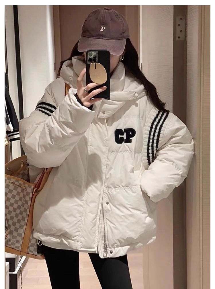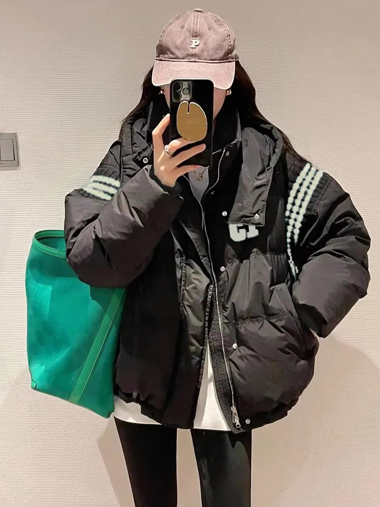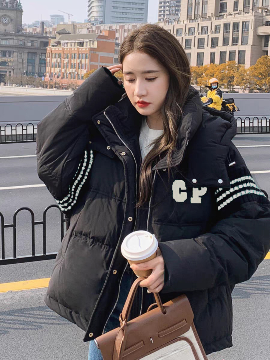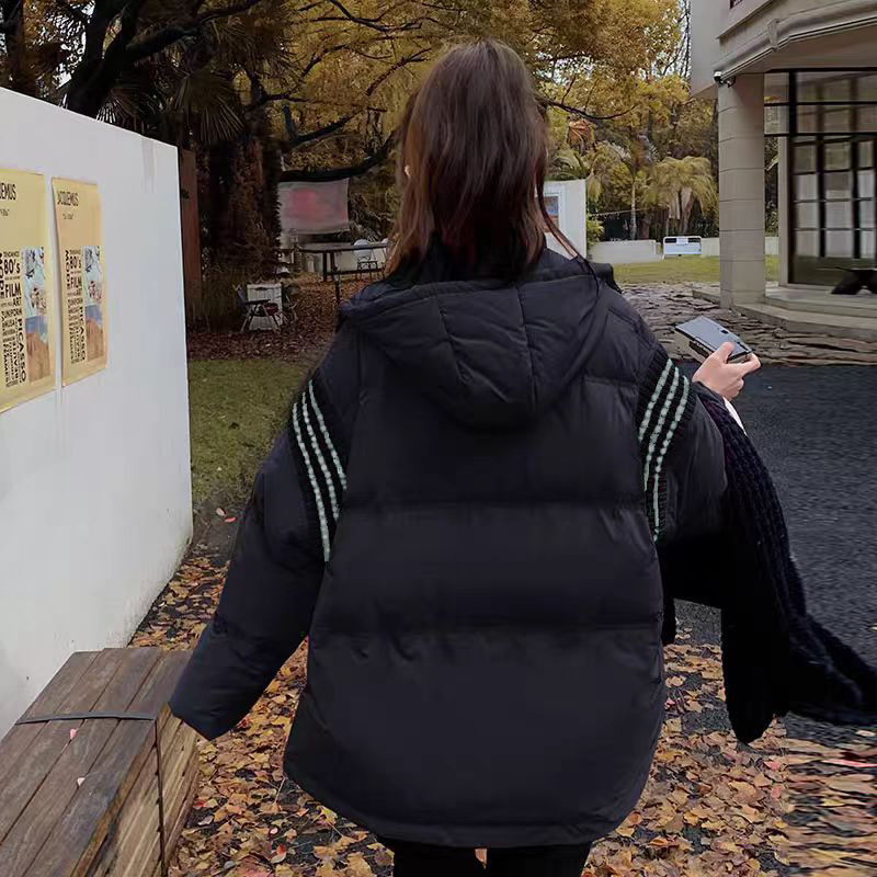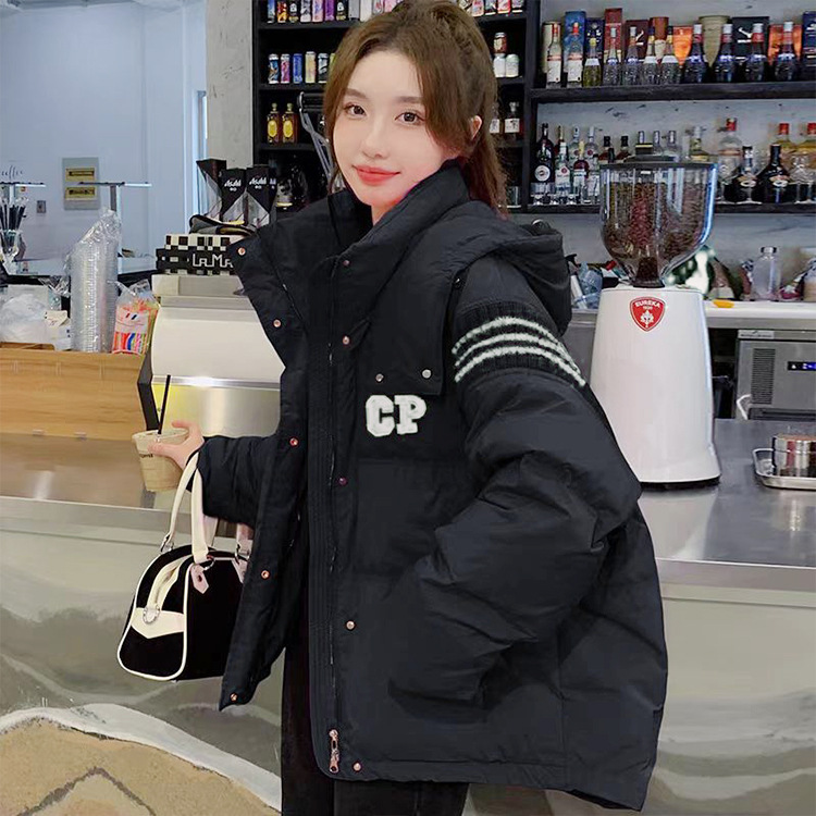 로즈 레드 후드 칼라 다운 코튼 패딩 재킷 여성의 겨울 새로운 니트 스티칭 코튼 패딩 재킷 루즈 코튼 패딩 재킷 캐주얼 빈티지 재킷