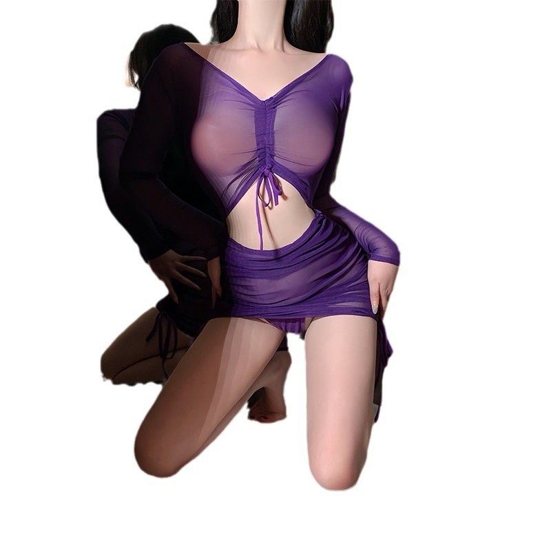 Gui Meizi 섹스 속옷 섹시한 관점 메쉬 긴 소매 V-Neck 잠옷 드로스트링 접힌 엉덩이 원피스 세트