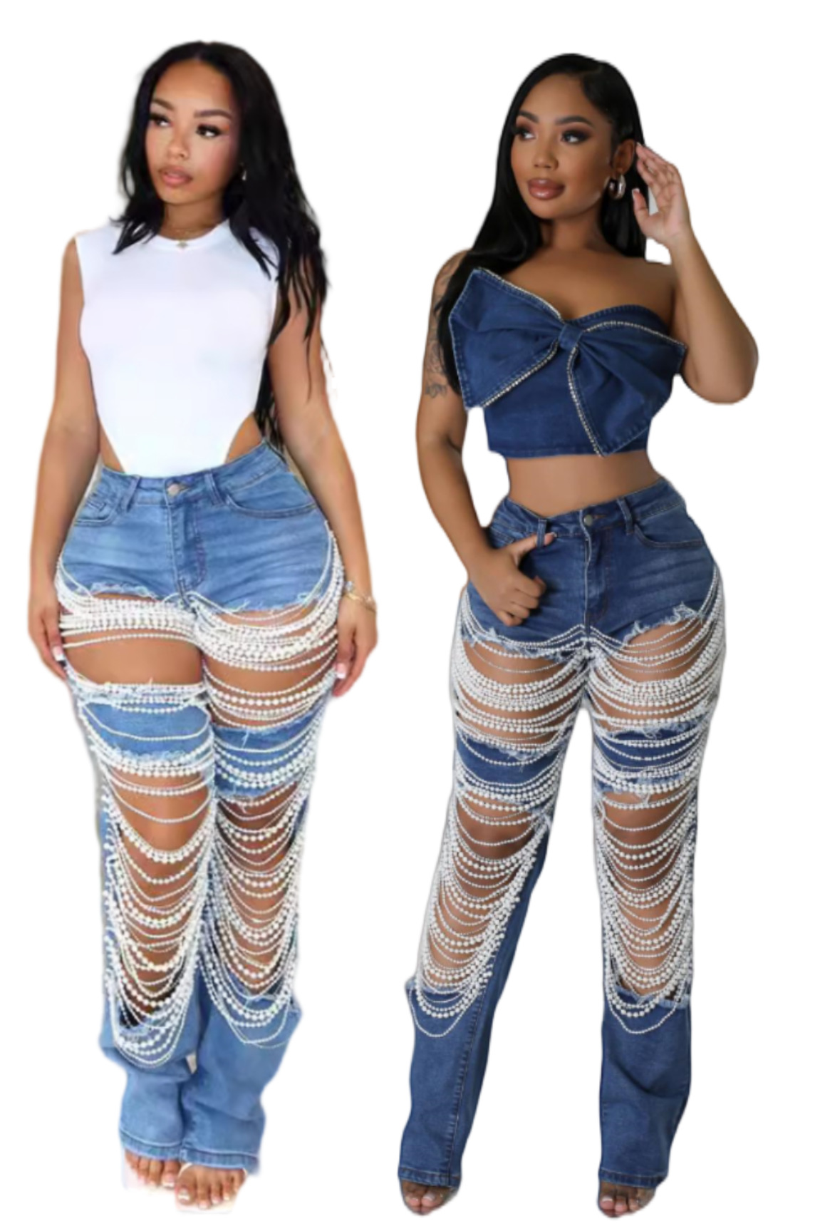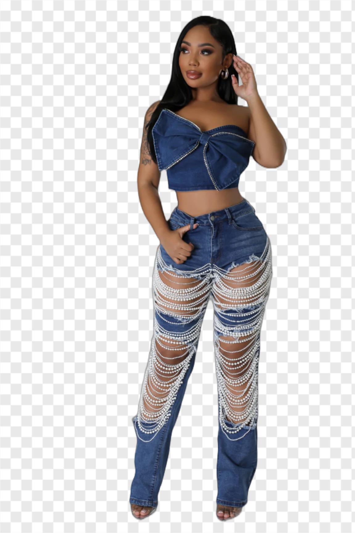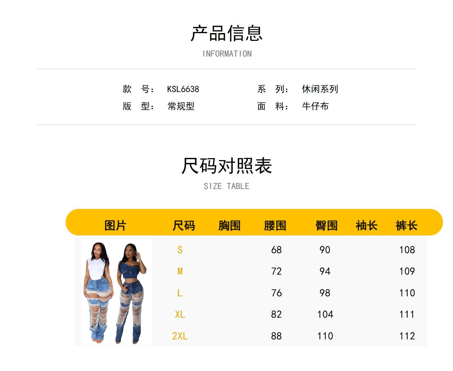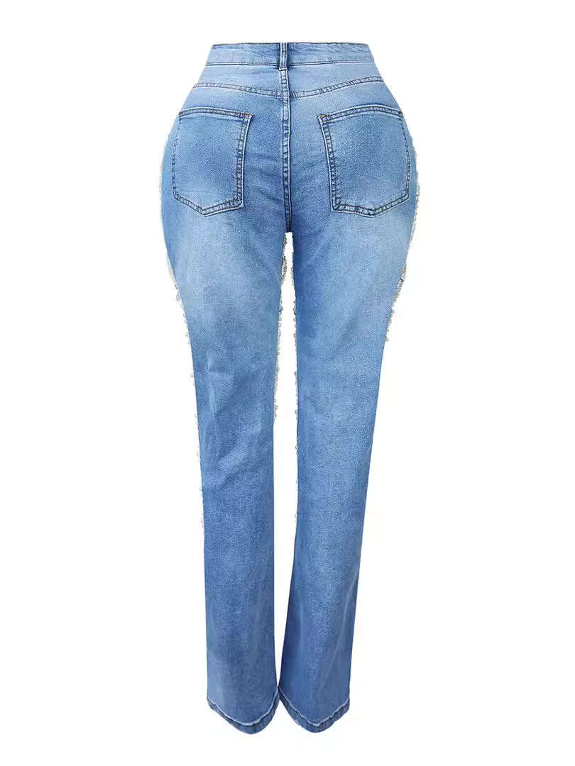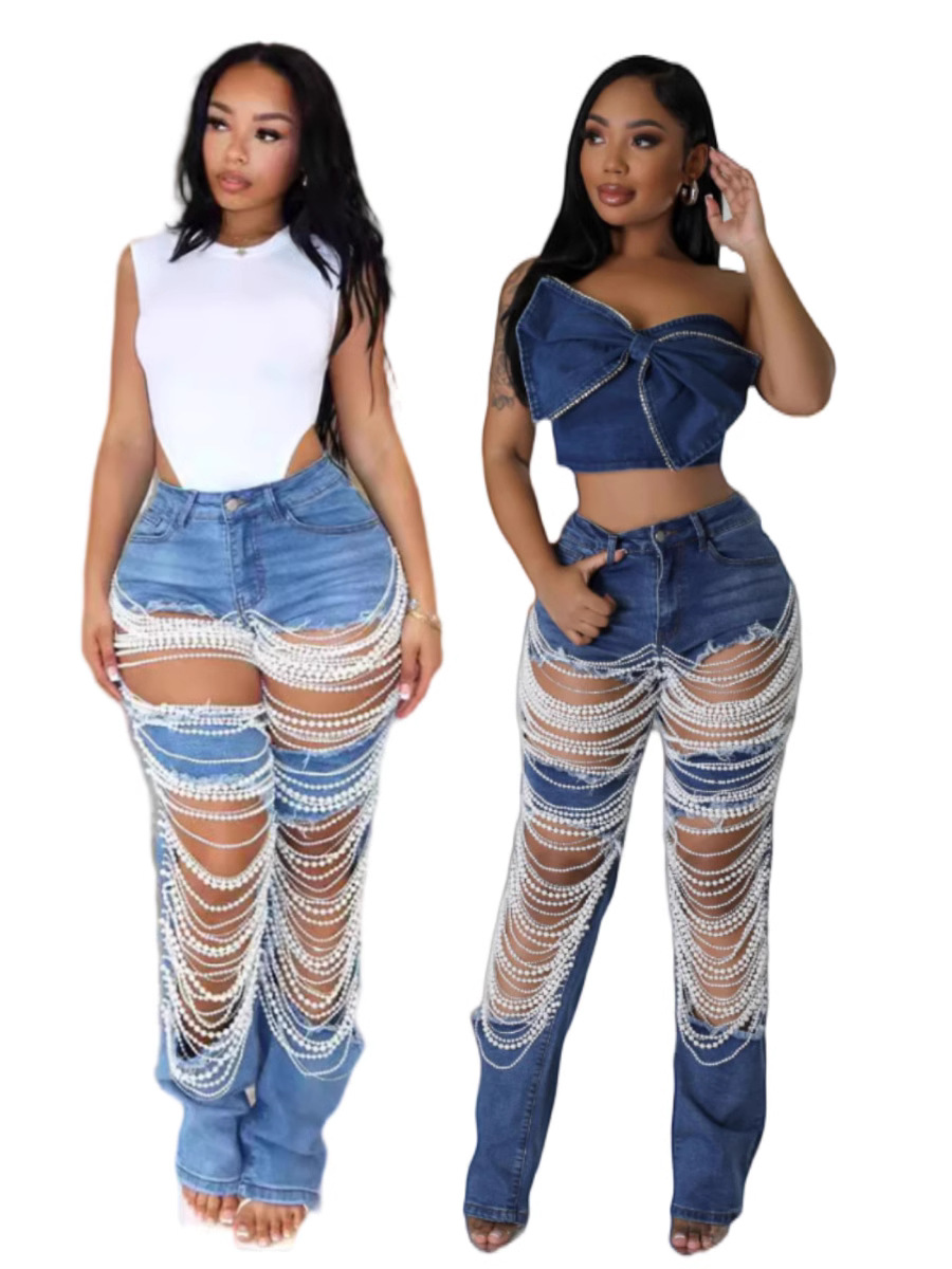 새로운 스트레치 청바지 KSL6638 재고 유럽과 미국의 국경 패션 찢어진 진주 체인 장식 청바지 여성