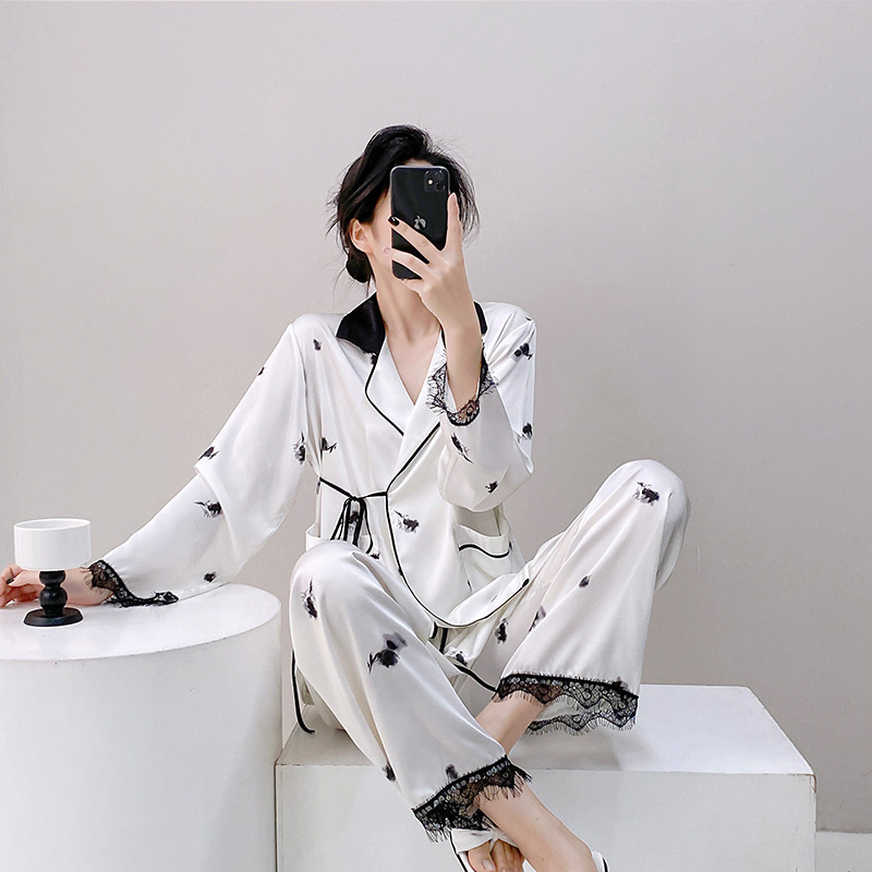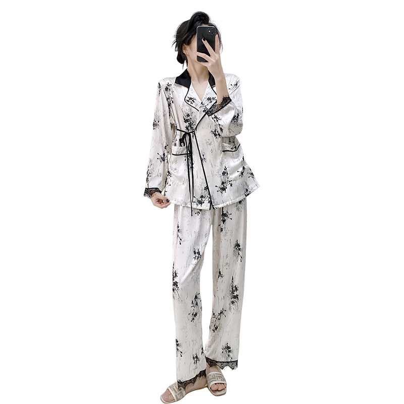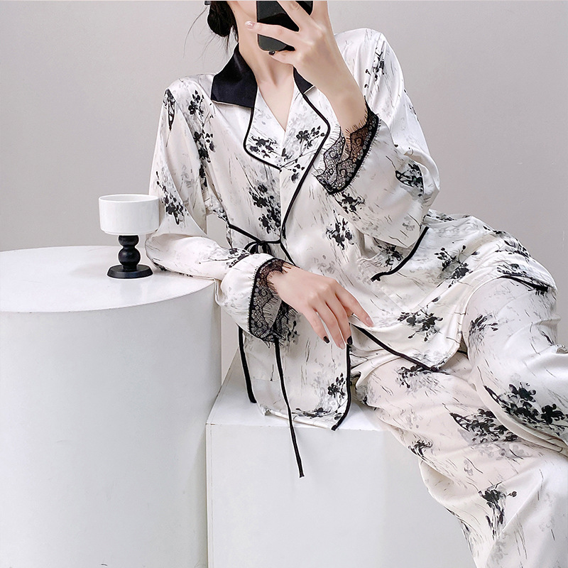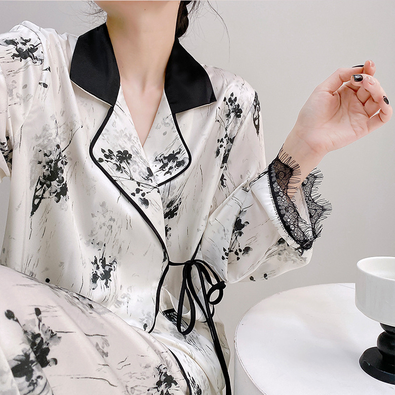 중국풍 수묵화 디자인의 여성용 고급 아이스 실크 잠옷, 레이스 소매가 있는 끈으로 묶는 실크 잠옷, 홈웨어로 외부에서 착용 가능합니다.