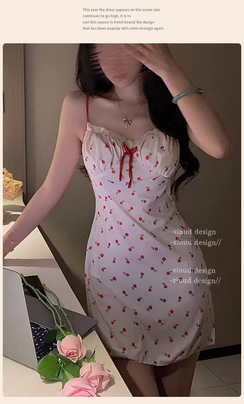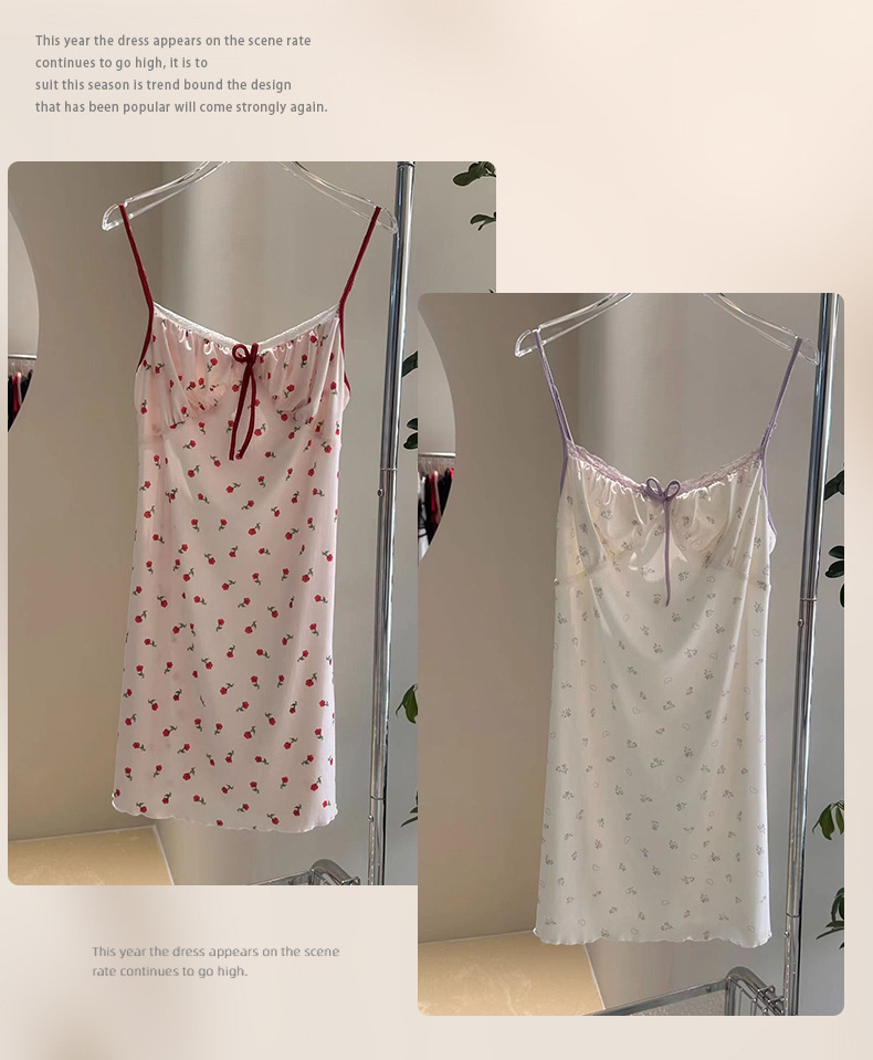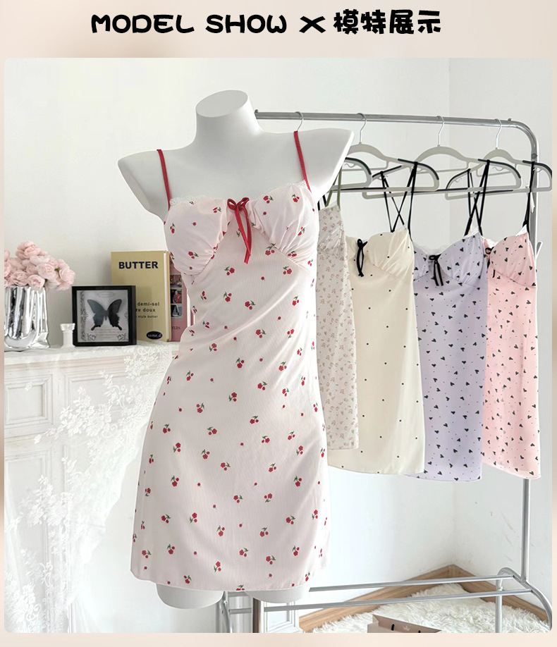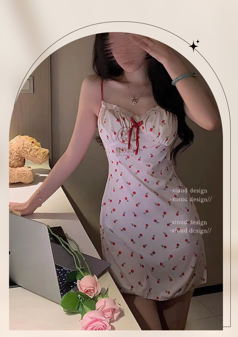 꽃무늬 체리 프린트 섹시 란제리, 청순한 꽃무늬 캐미솔, 요정풍 상큼한 홈웨어 나이트가운 A363