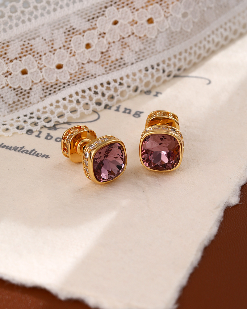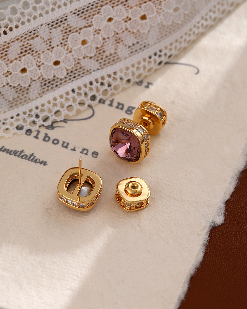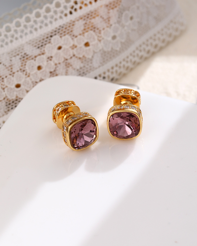 가지 퍼플 18K 골드 스퀘어 크리스탈 스터드 귀걸이 [925 실버바늘]
