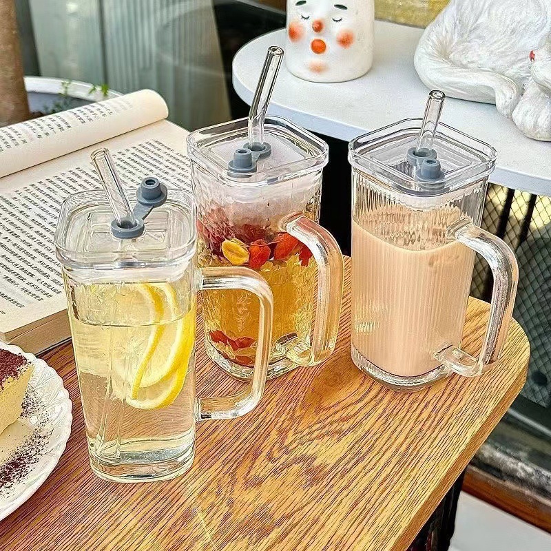 투명한 INS 바람 손잡이 유리 흡입 튜브 컵 높은 색상 가치 여성 여름 주스 음료 광장 수직 곡물 선물 컵