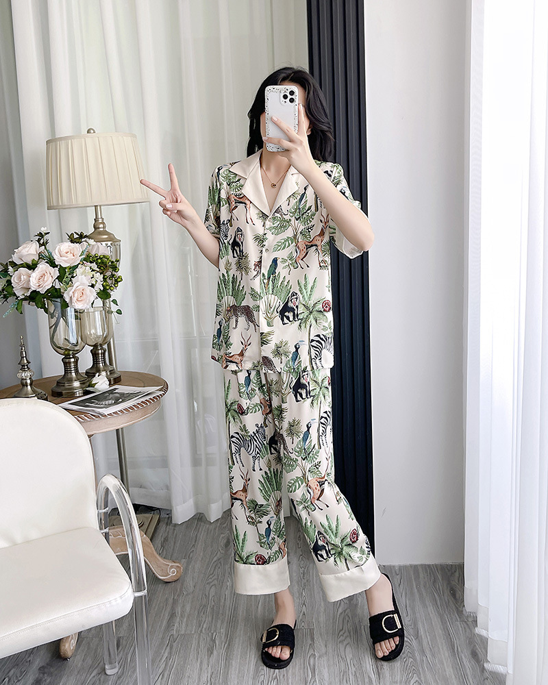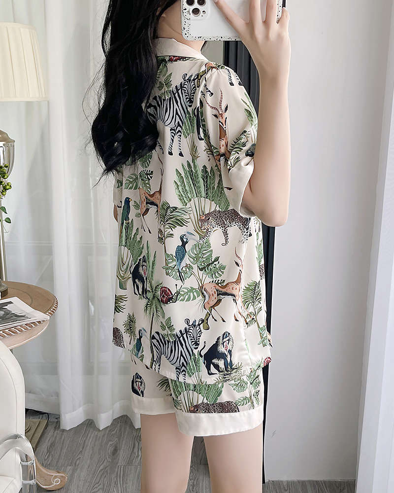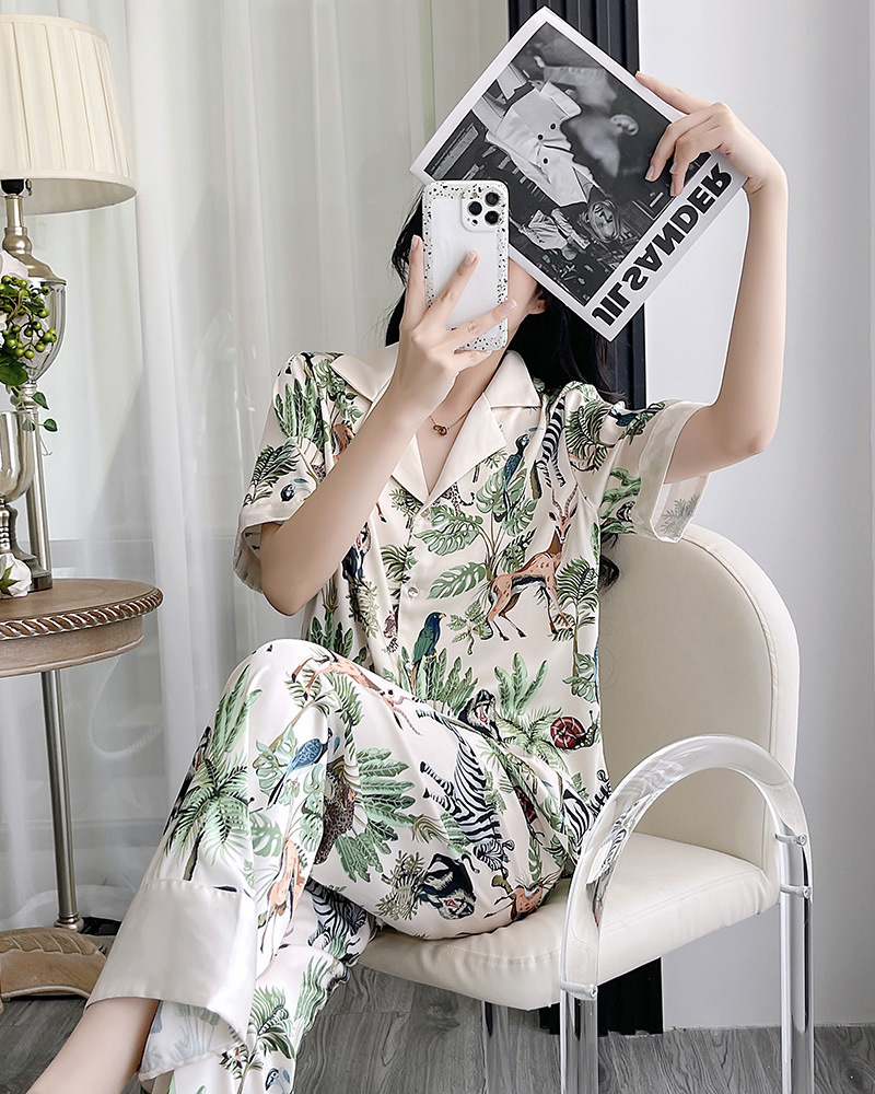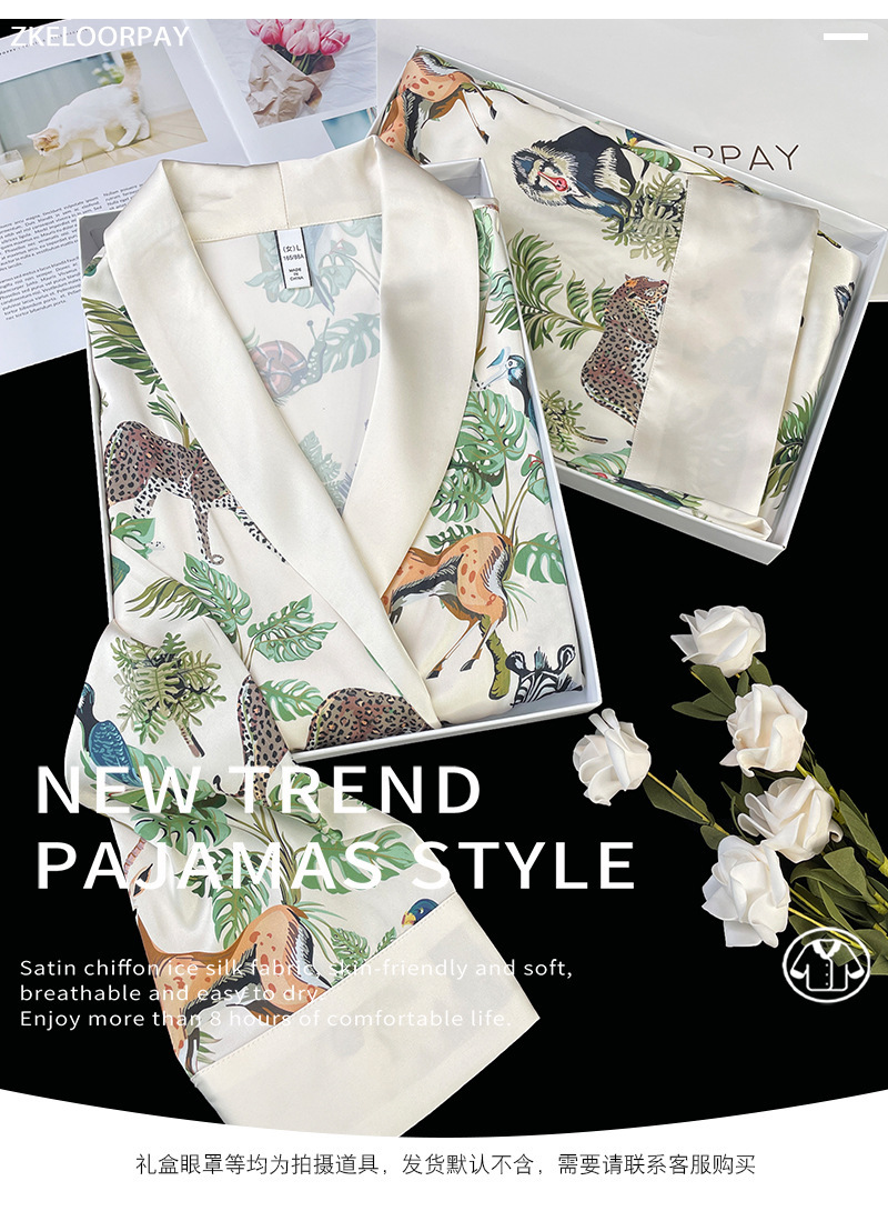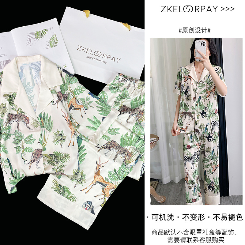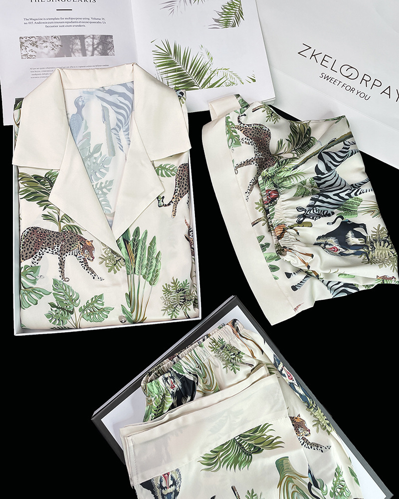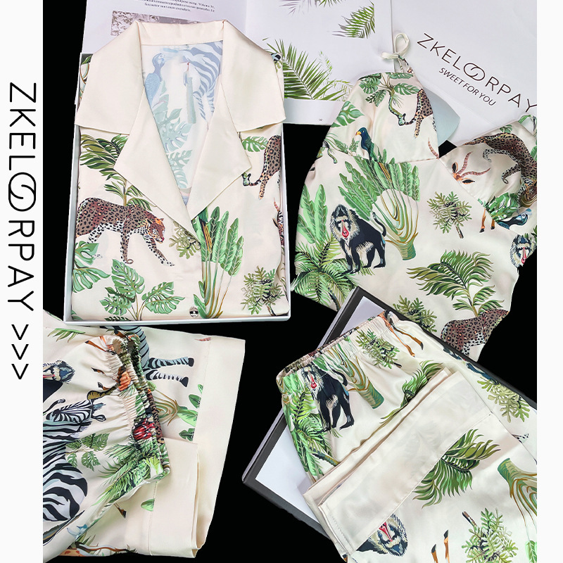 인터넷 연예인 동물 세계 4 피스 아이스 실크 파자마 여성 봄과 여름 새로운 도착 빛 럭셔리 프랑스 스타일 인공 실크 홈 옷
