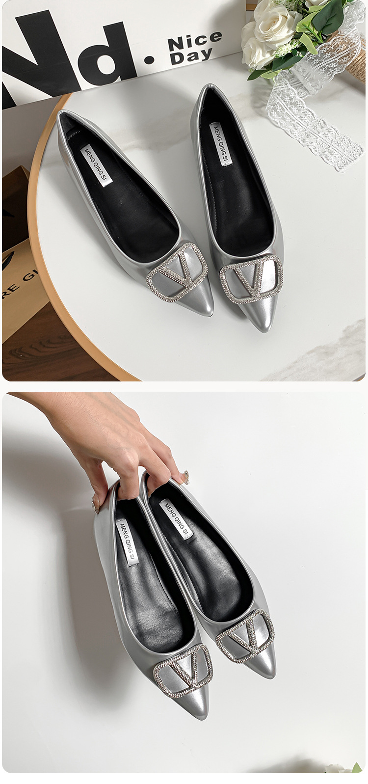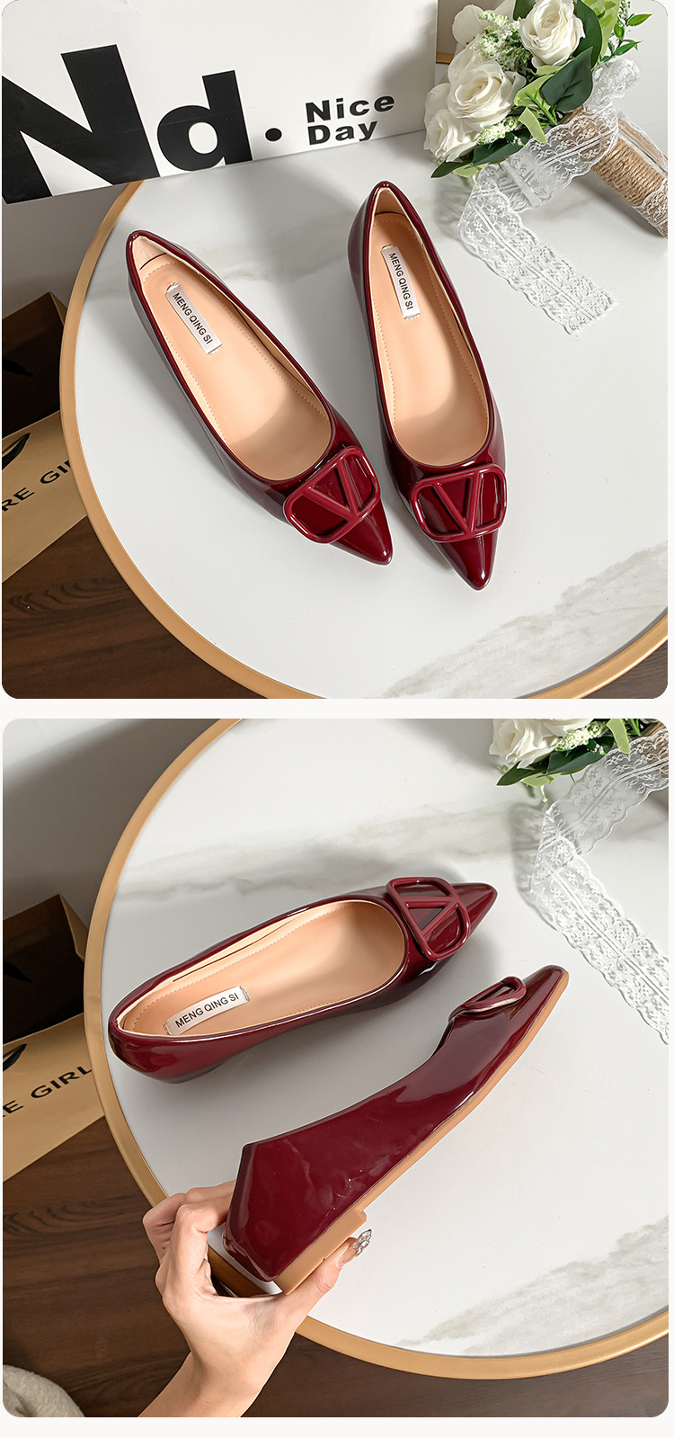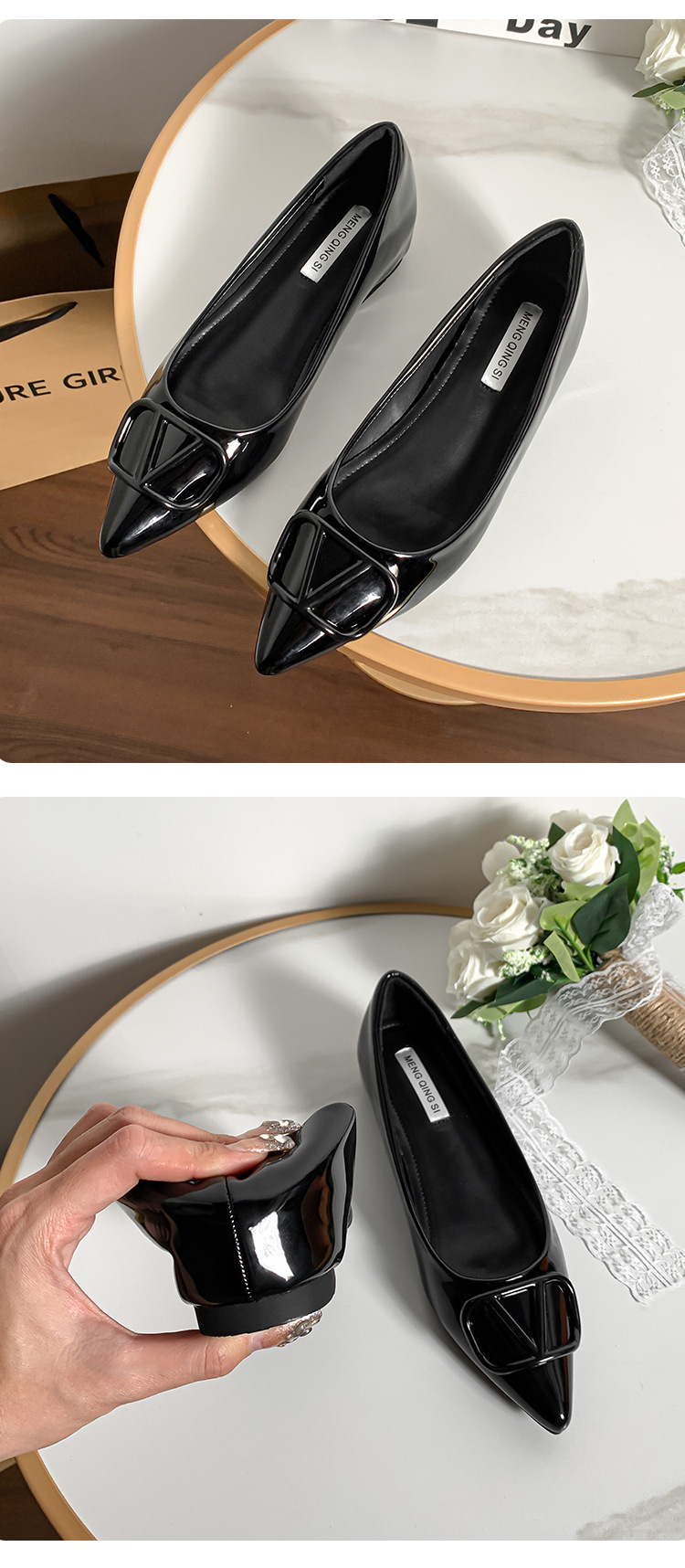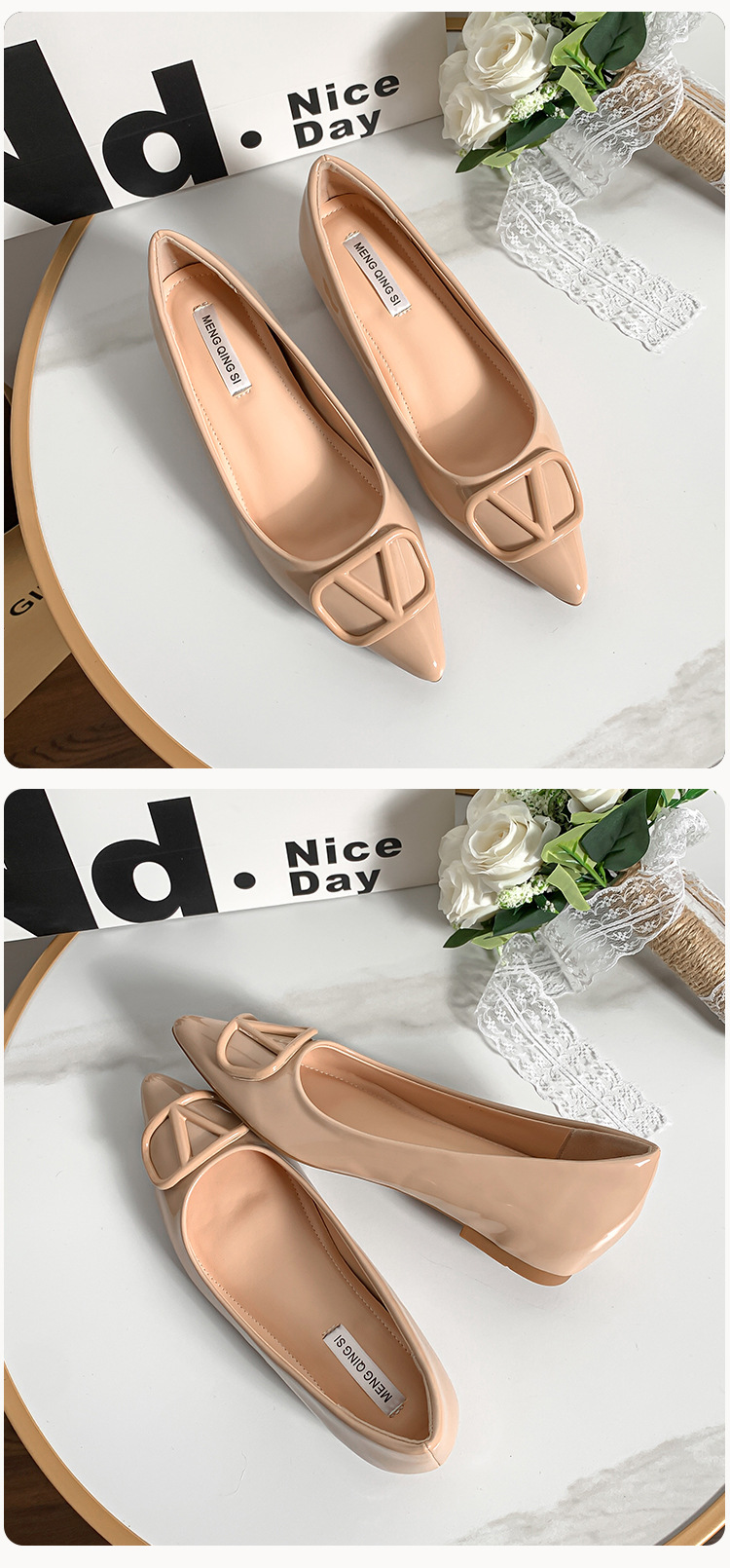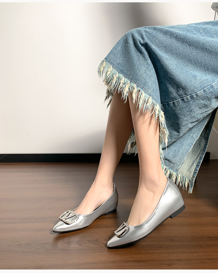 메탈 V 버클 페이턴트 가죽 누드 컬러 플랫 슈즈, 여성스러운 스타일, 키 작은 분들을 위한 키높이, 빅사이즈 여성화 41~43