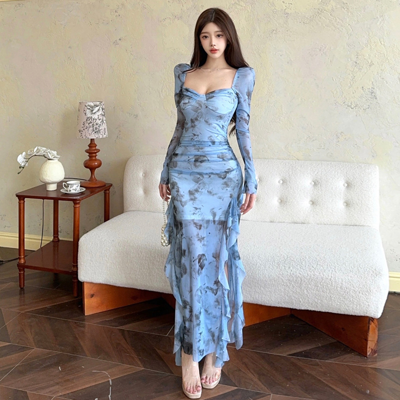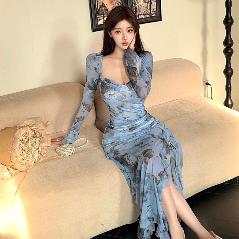 1206 유럽, 미국 및 동남 아시아 대외 무역 도매 2024 여성 의류 프랑스 복고풍 인쇄 메쉬 분할 슬림 원피스