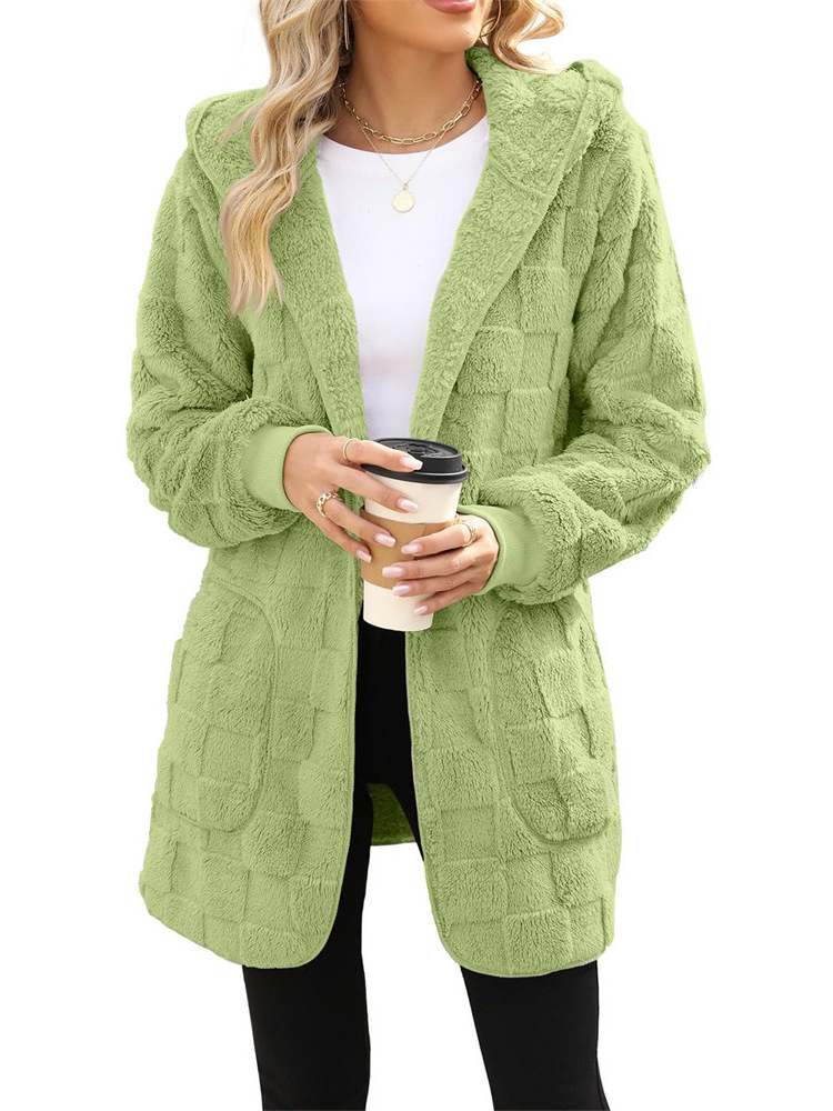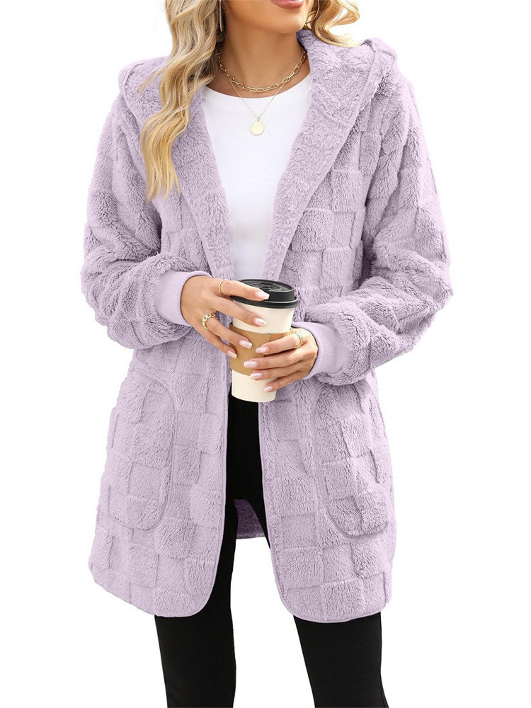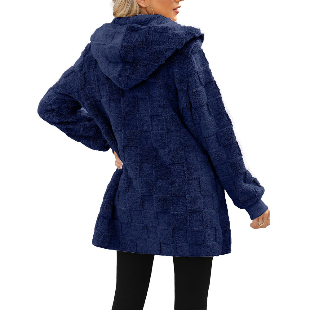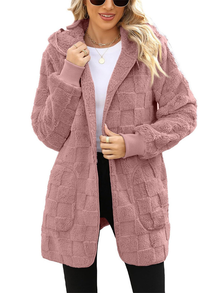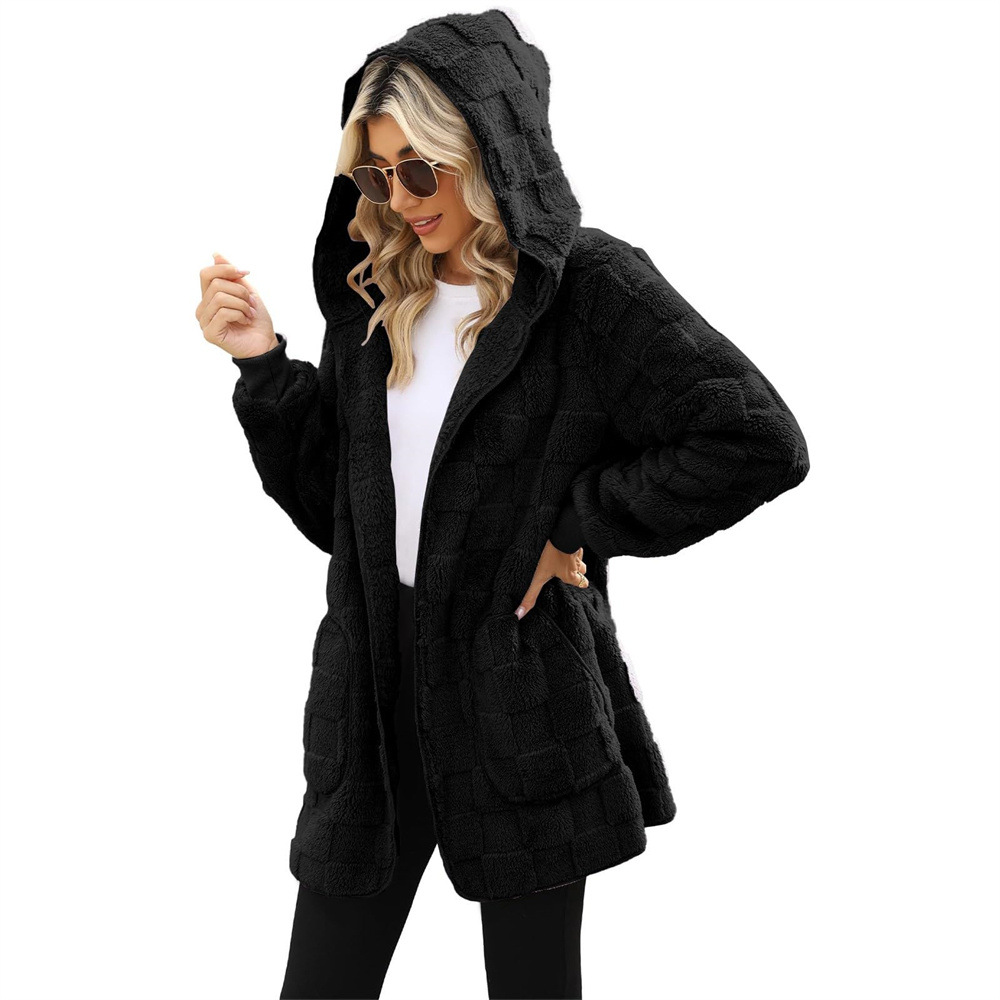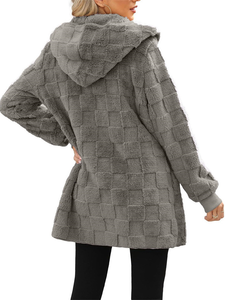 2024 유럽과 미국 국경 아마존 겨울 새로운 카디건 격자 무늬 자카드 후드 포켓 플러시 카디건 코트 여성