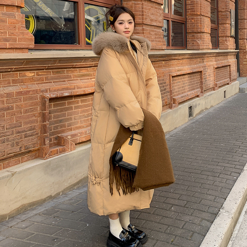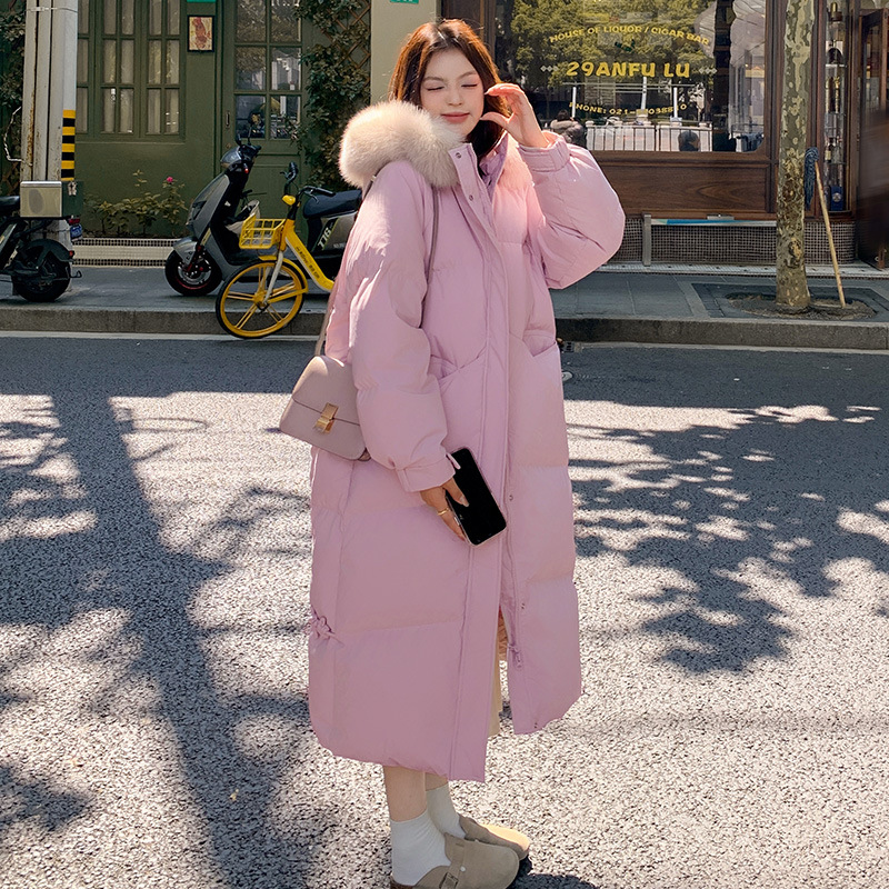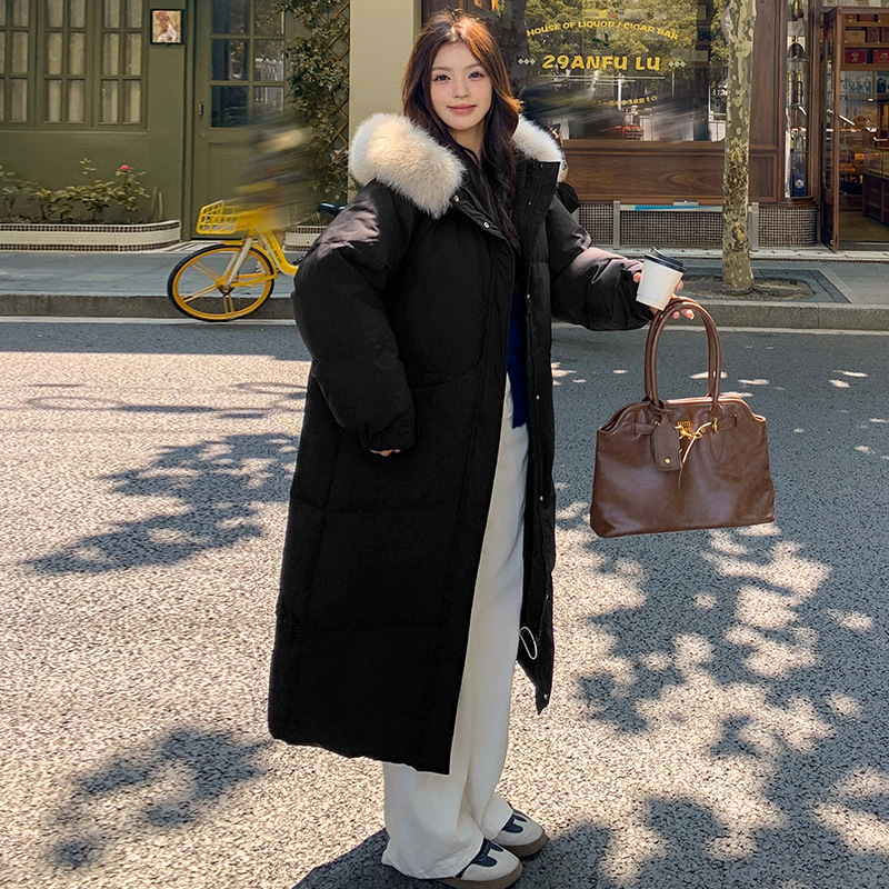 2025 겨울 신상 고급스러운 대형 모피 칼라 다운 재킷 여성용 롱 코트 무릎 아래까지 오는 한국 스타일 두꺼운 면 코트