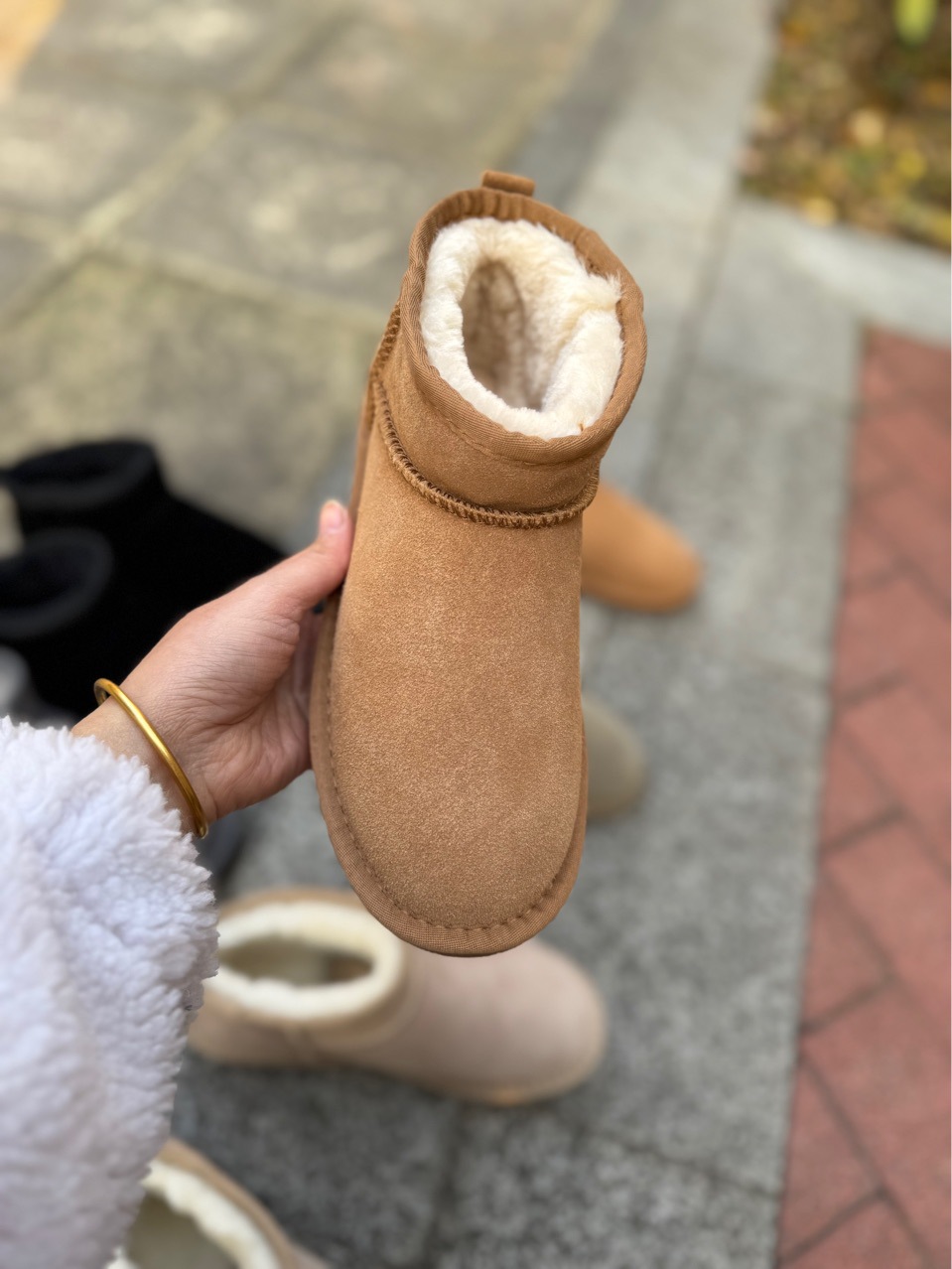 스노우 부츠 여성 가죽 양모 2024 새로운 짧은 튜브 두꺼운 벨벳 겨울 편평한 면화 신발 Zhou Dongyu