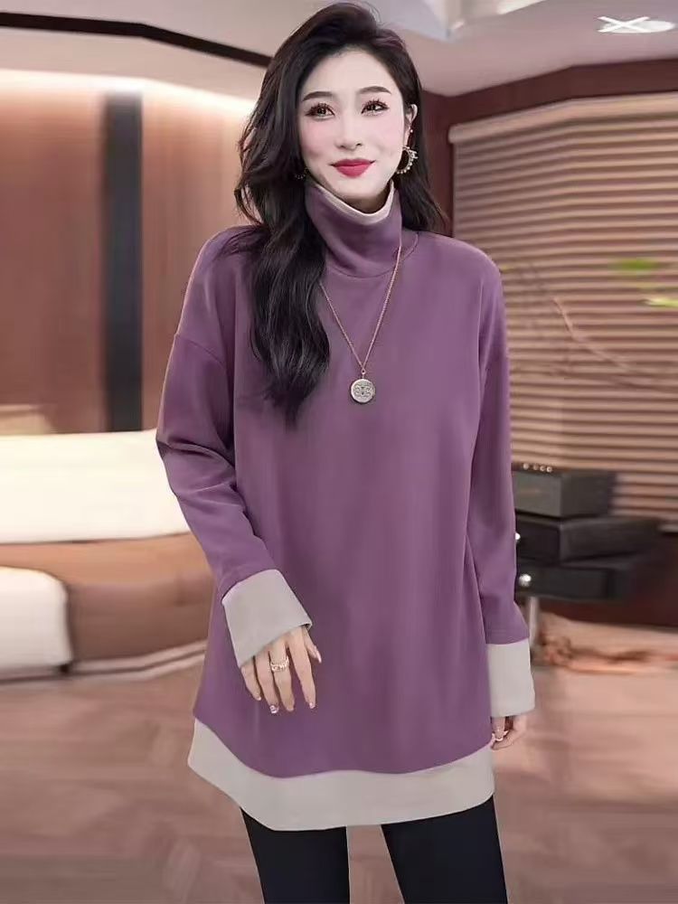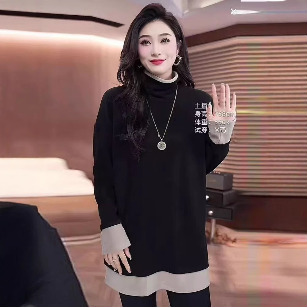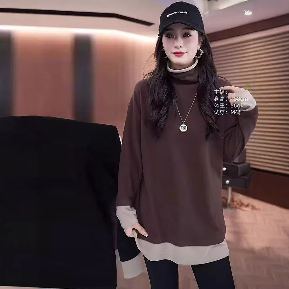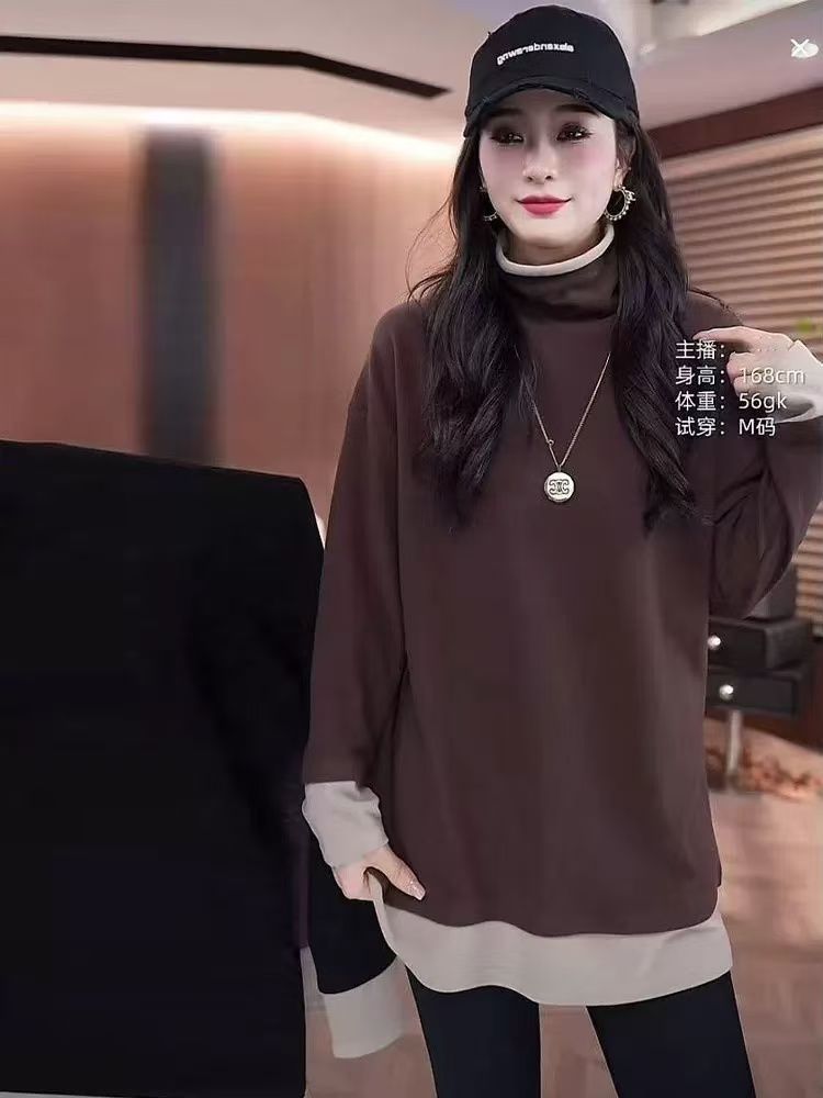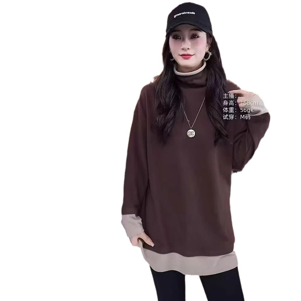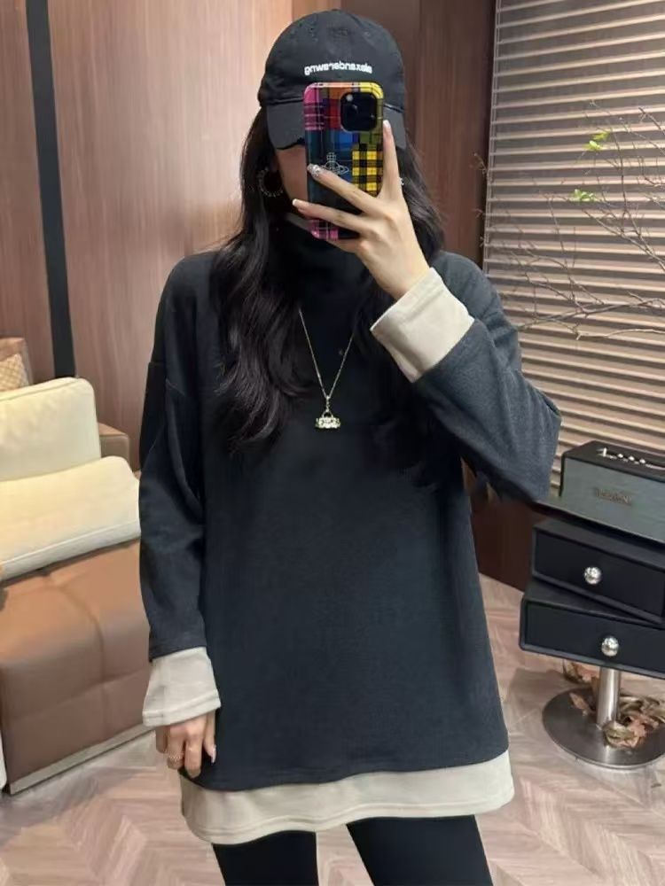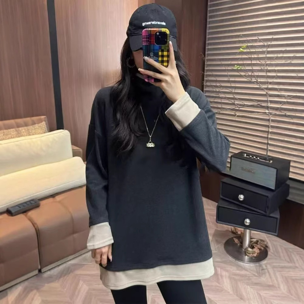 빅사이즈 여성복 유럽풍 페이크 투피스 하이넥 티셔츠 이너웨어 여성 봄 가을 2026 신상 루즈핏 긴팔 상의