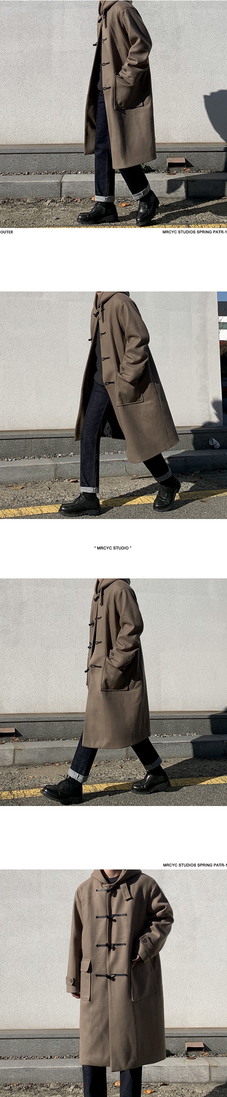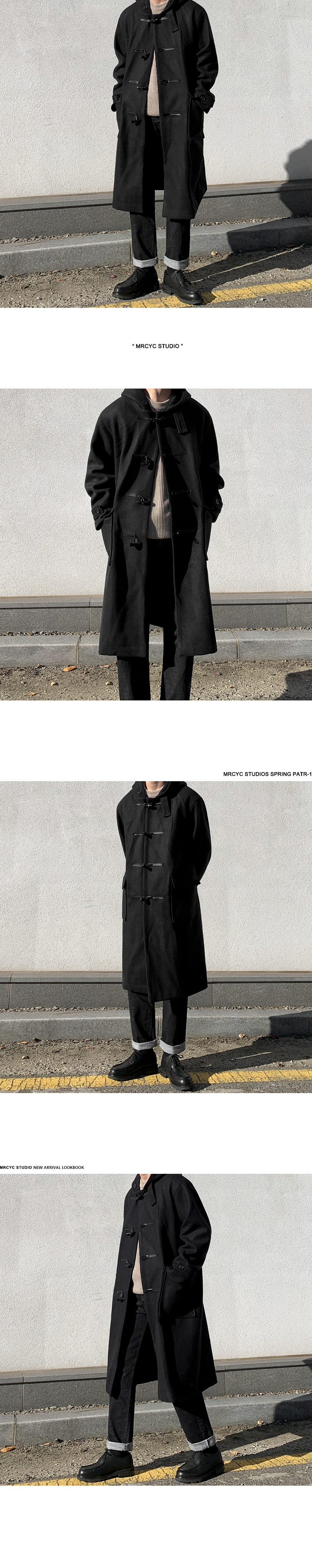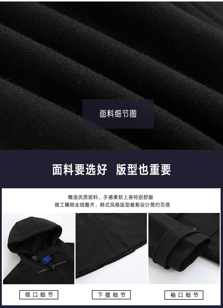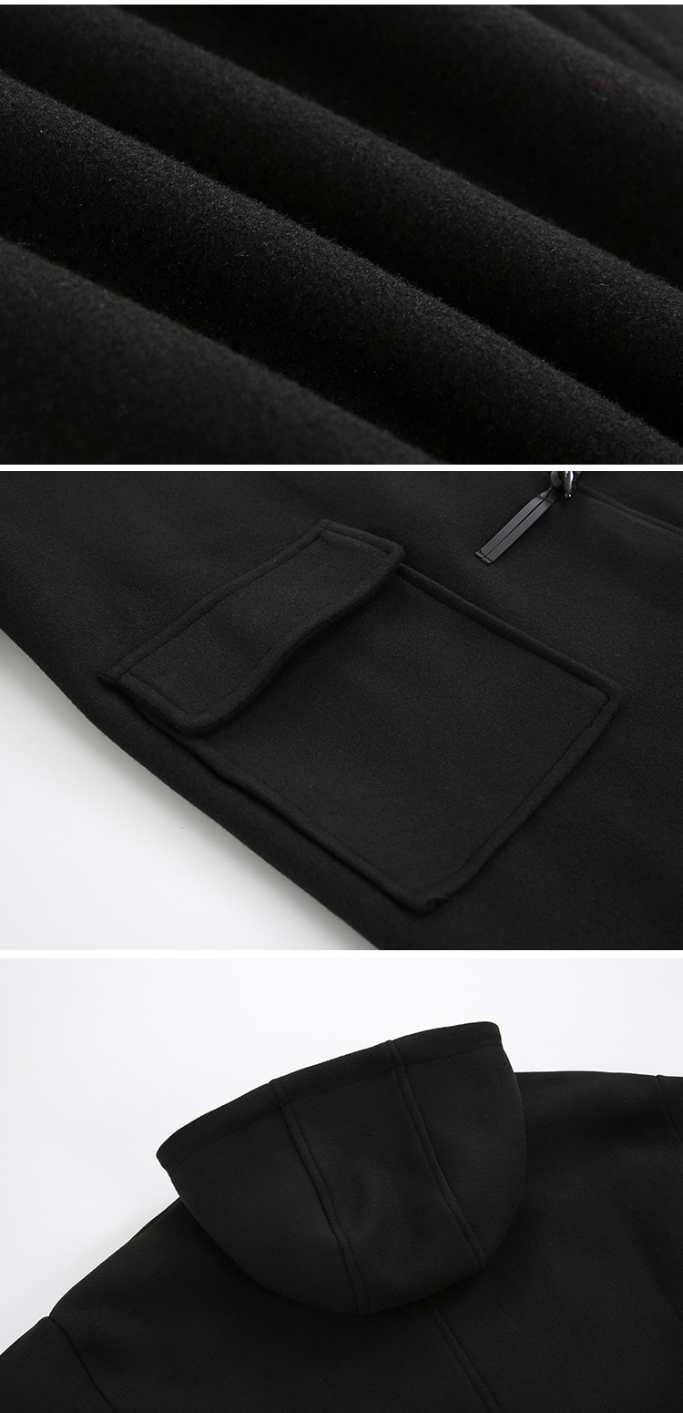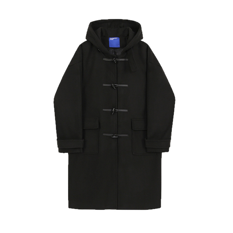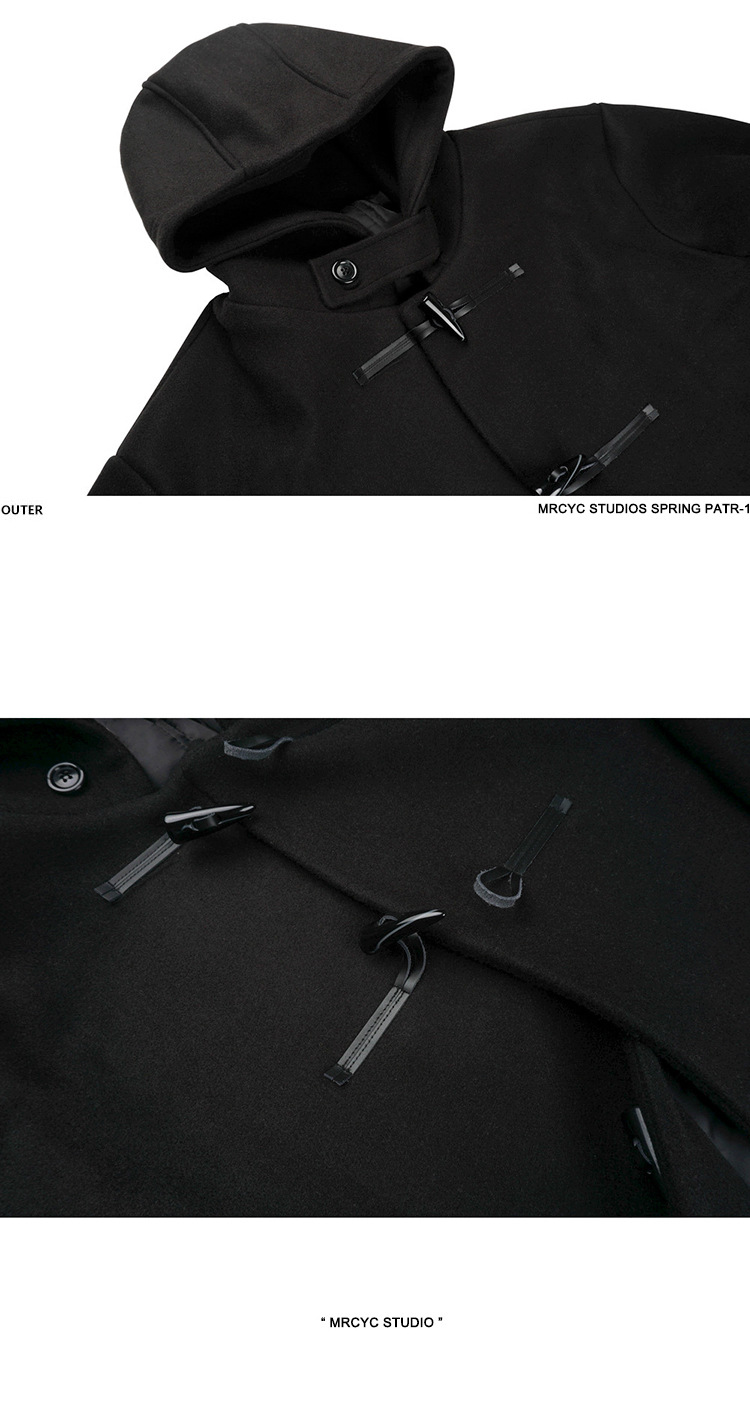 MYQ 일본 모직 코트 남자 중간 길이의 코트 후드 라펠 재킷 트렌디 남성 혼 버클 울 코트