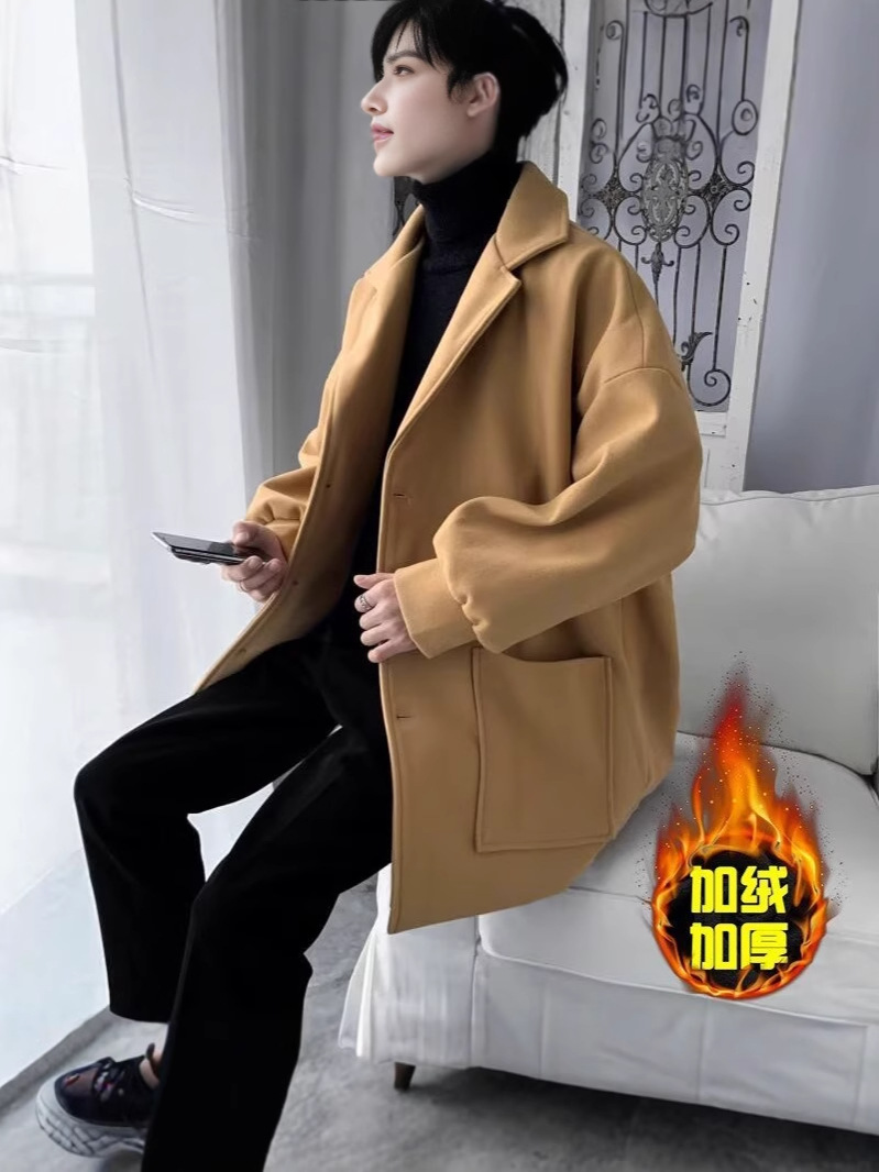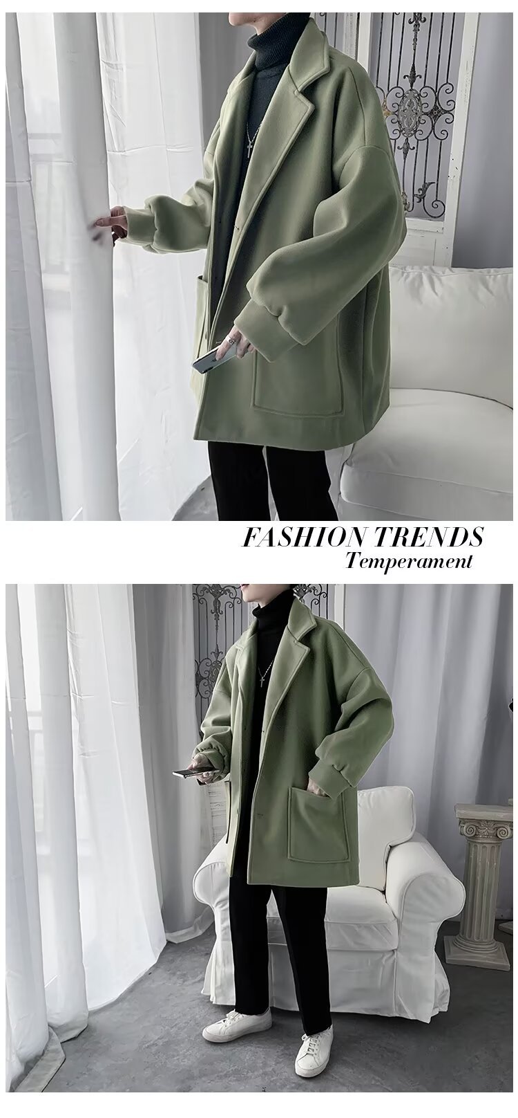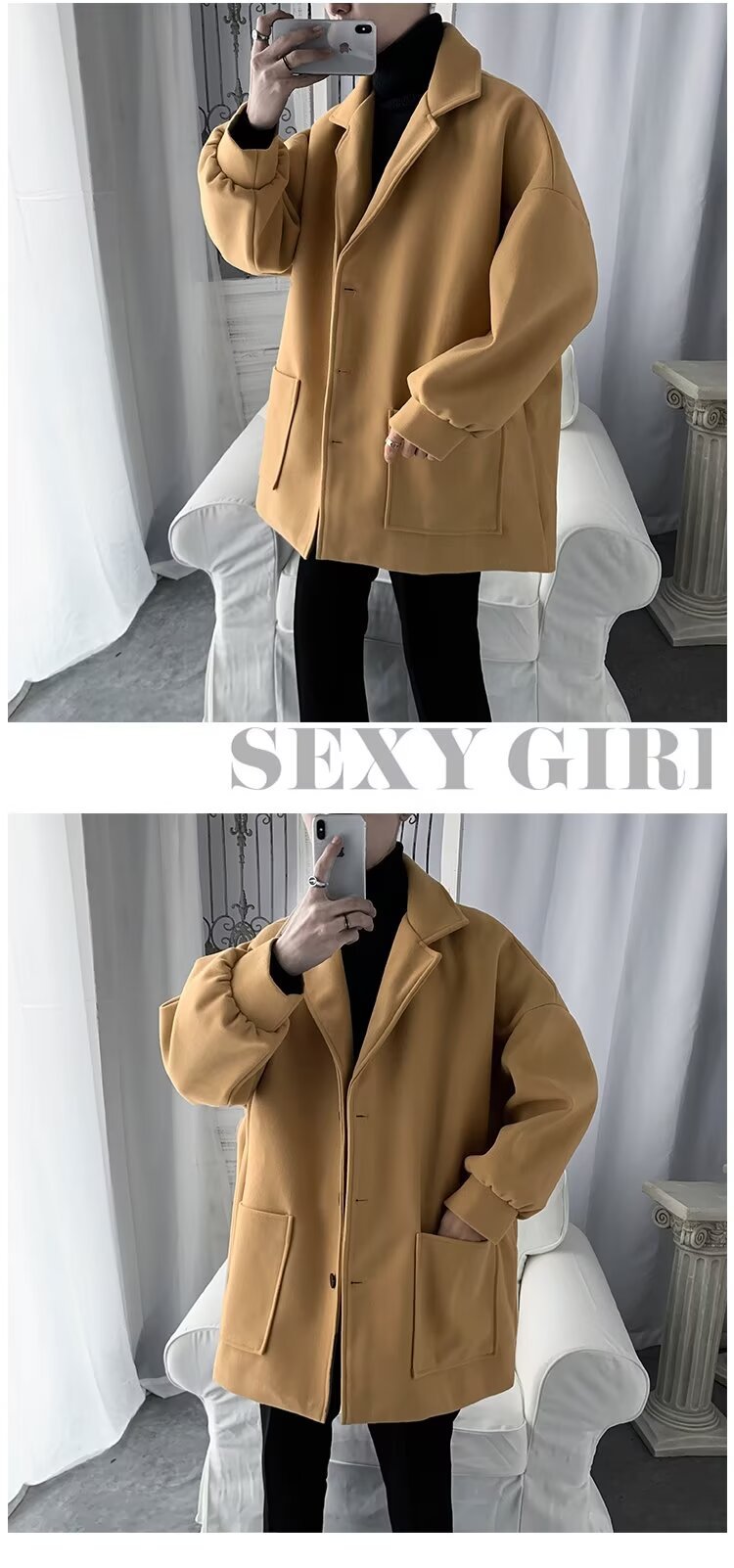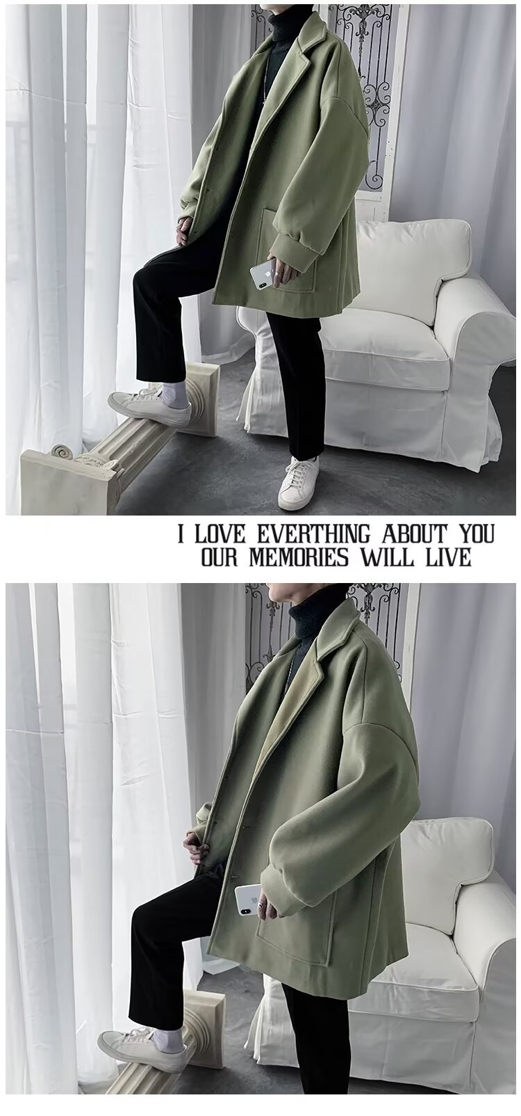 모직 코트 남자 두꺼운 모직 코트 중간 길이의 코트 한국 스타일 유행 잘 생긴 단색 가을과 겨울 홍콩 스타일 더피 잘 생긴