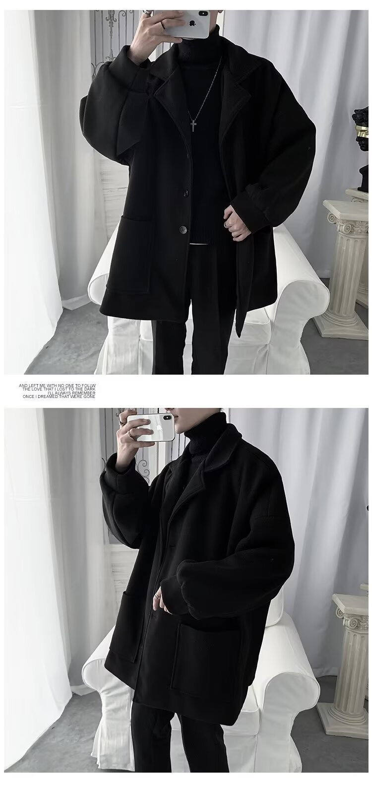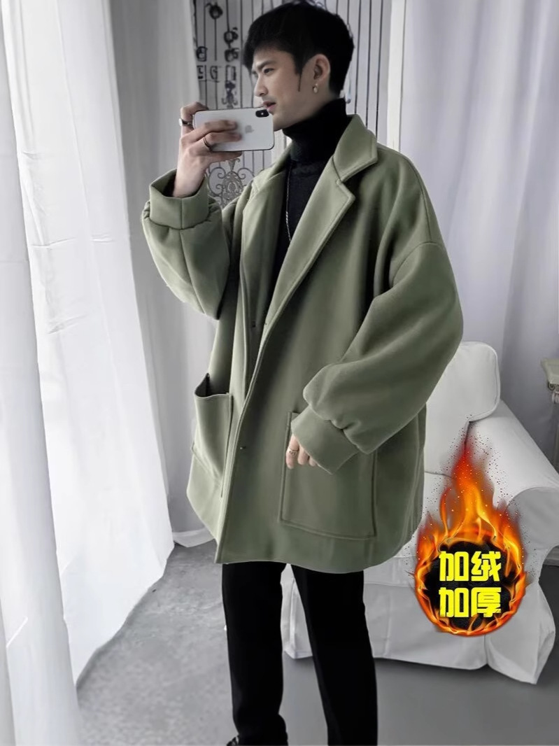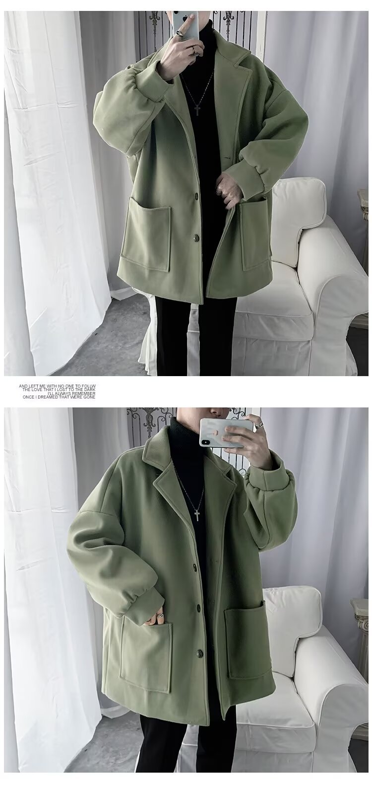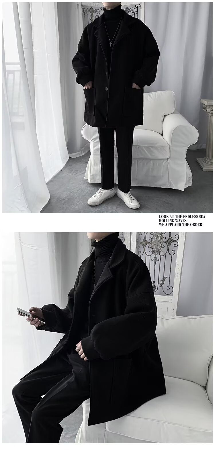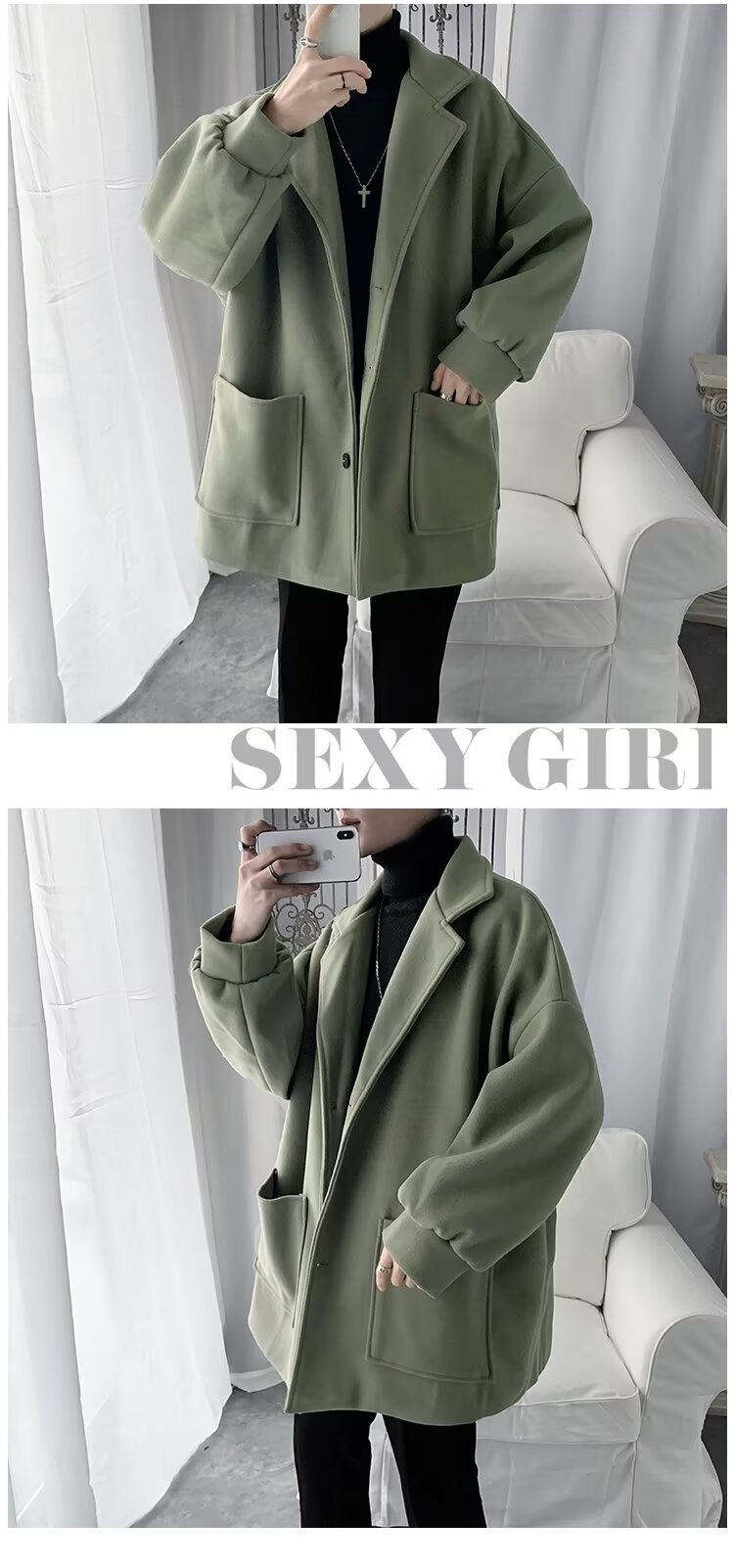 모직 코트 남자 두꺼운 모직 코트 중간 길이의 코트 한국 스타일 유행 잘 생긴 단색 가을과 겨울 홍콩 스타일 더피 잘 생긴