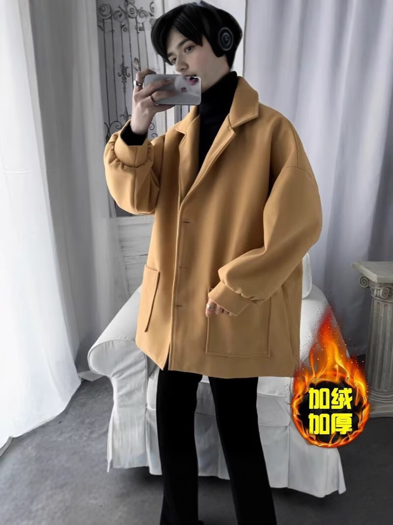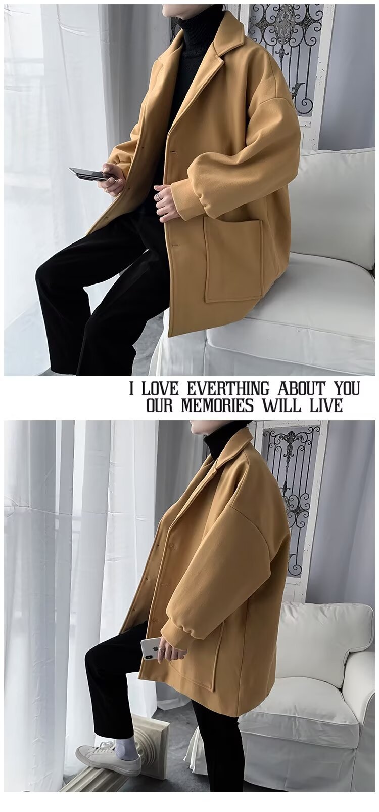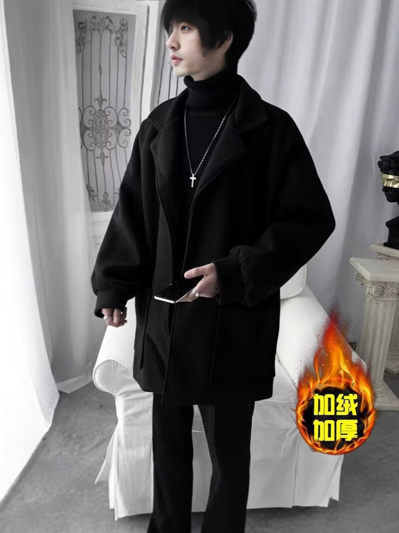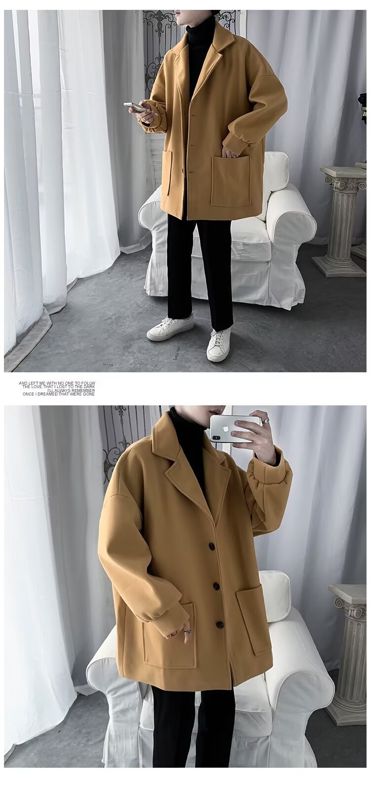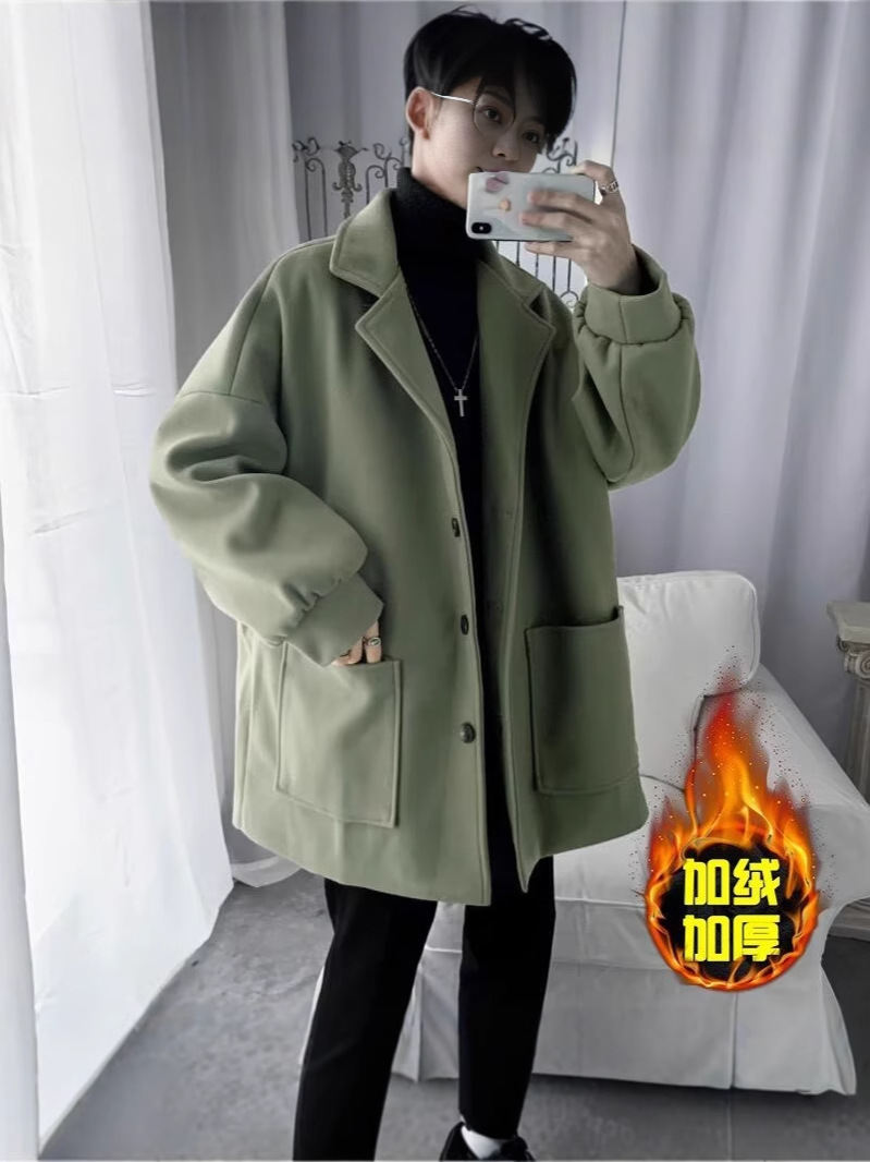 모직 코트 남자 두꺼운 모직 코트 중간 길이의 코트 한국 스타일 유행 잘 생긴 단색 가을과 겨울 홍콩 스타일 더피 잘 생긴