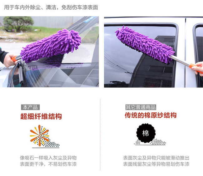 2.使用本品轻松除尘,打理方便。掸毛采用棉纱线编制而成,非常柔顺,清洁力强。使用时,不损伤车身漆面,厚实耐用,美观精致。产品轻便,可用于车身或车玻璃除灰。