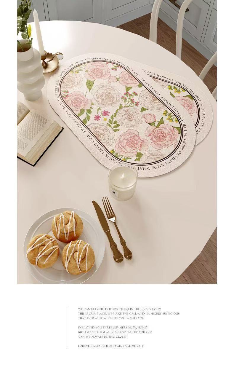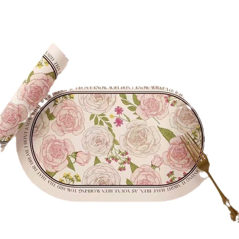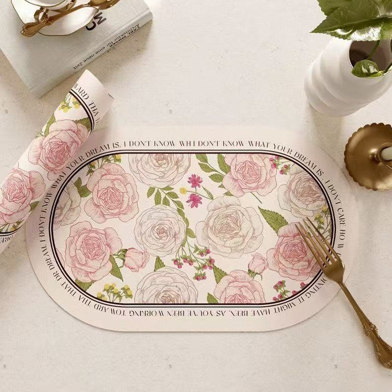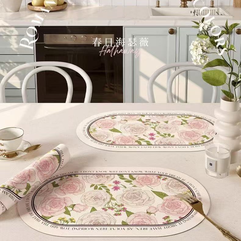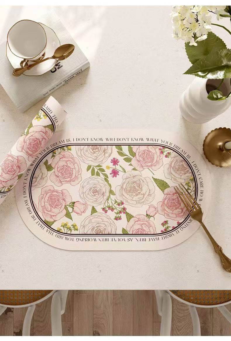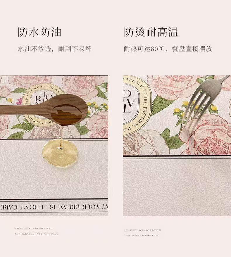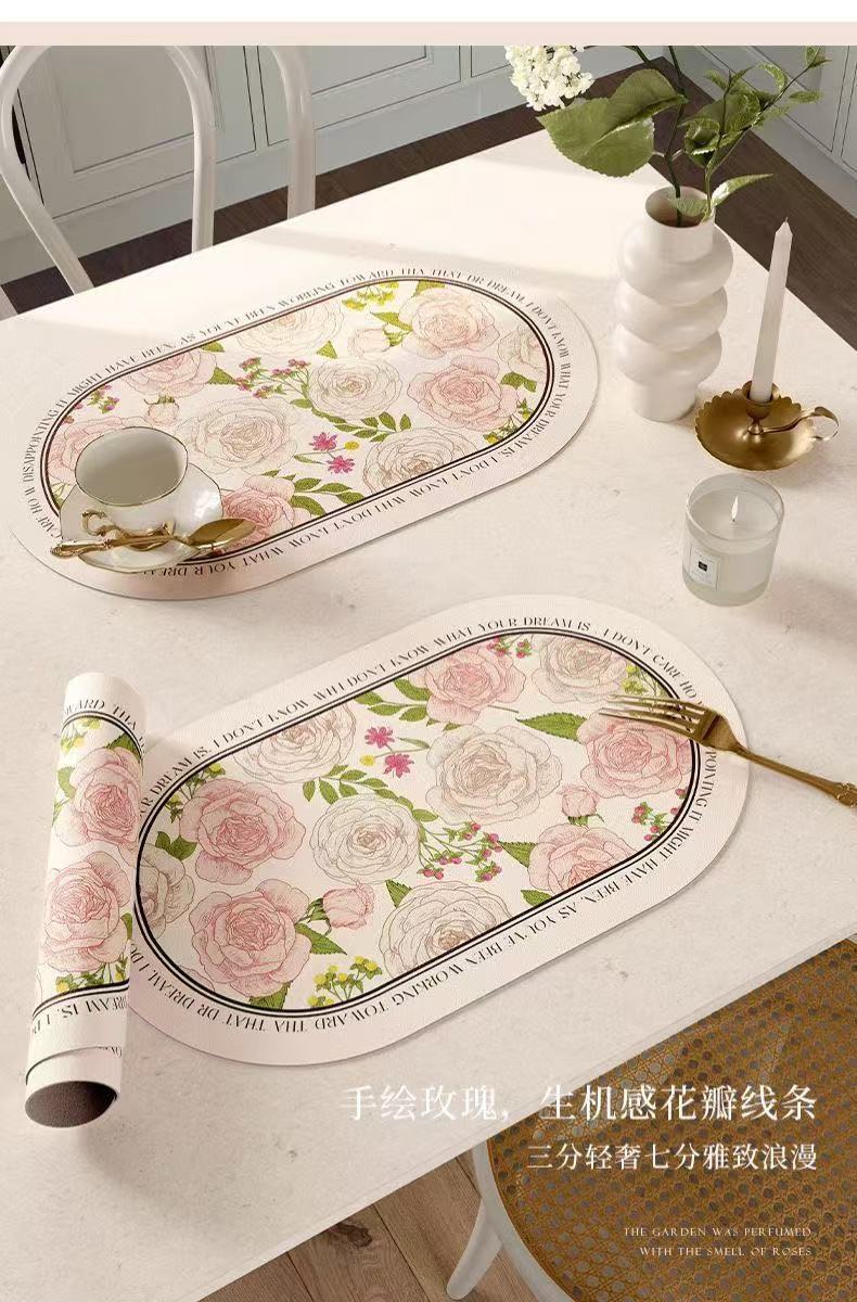 핑크와 화이트 로즈 고온 방지 테이블 매트, 고급스러운 서양식 식탁 매트, 가죽 식사 단열 매트, 방수 및 방유 그릇 매트