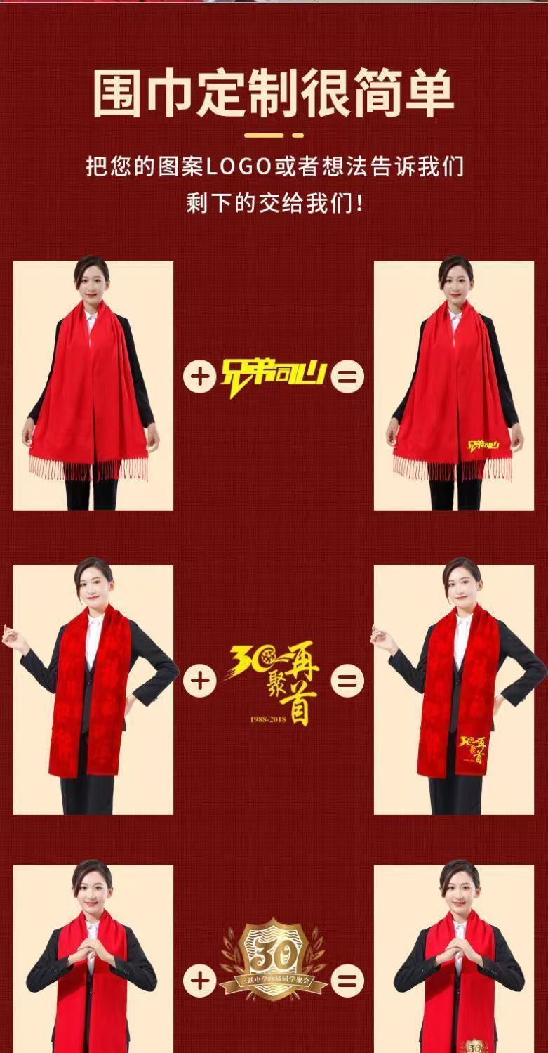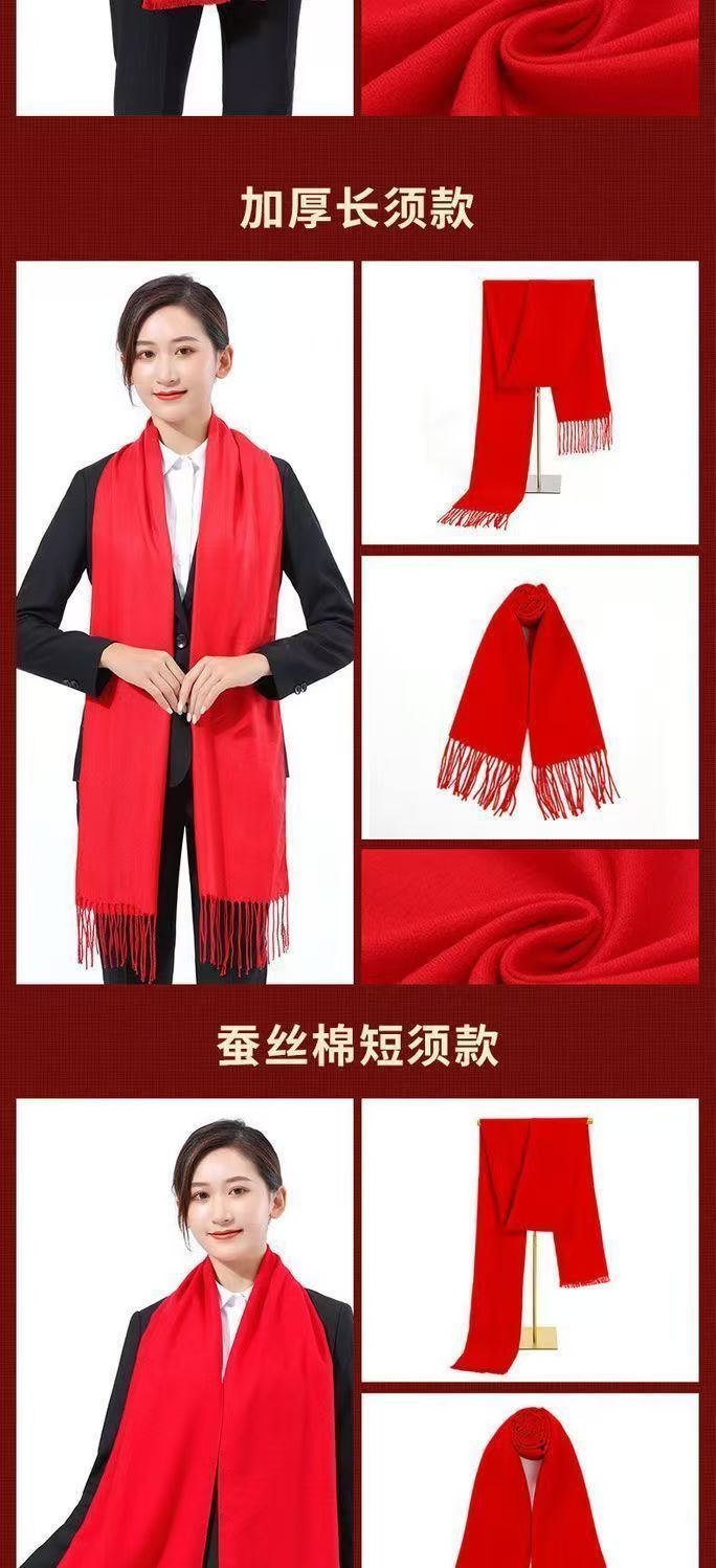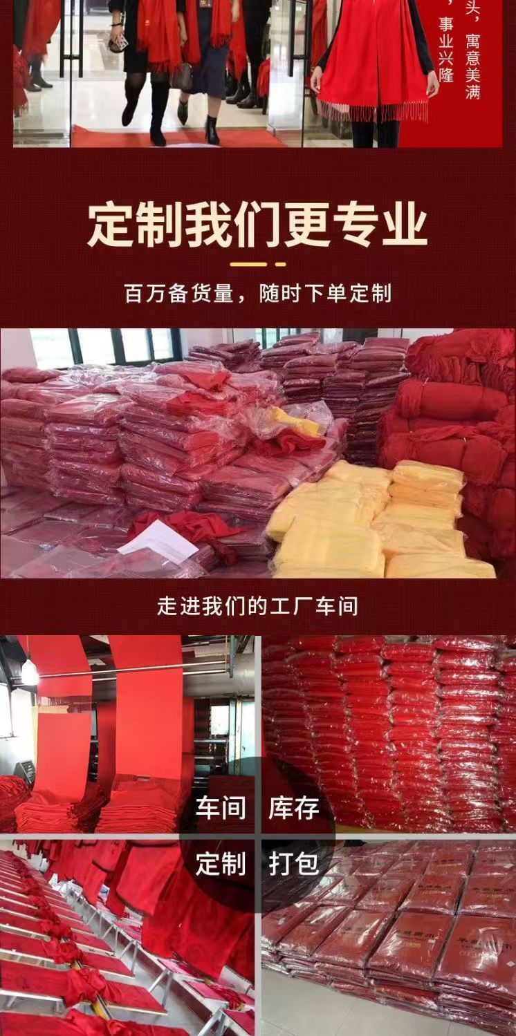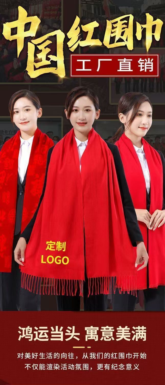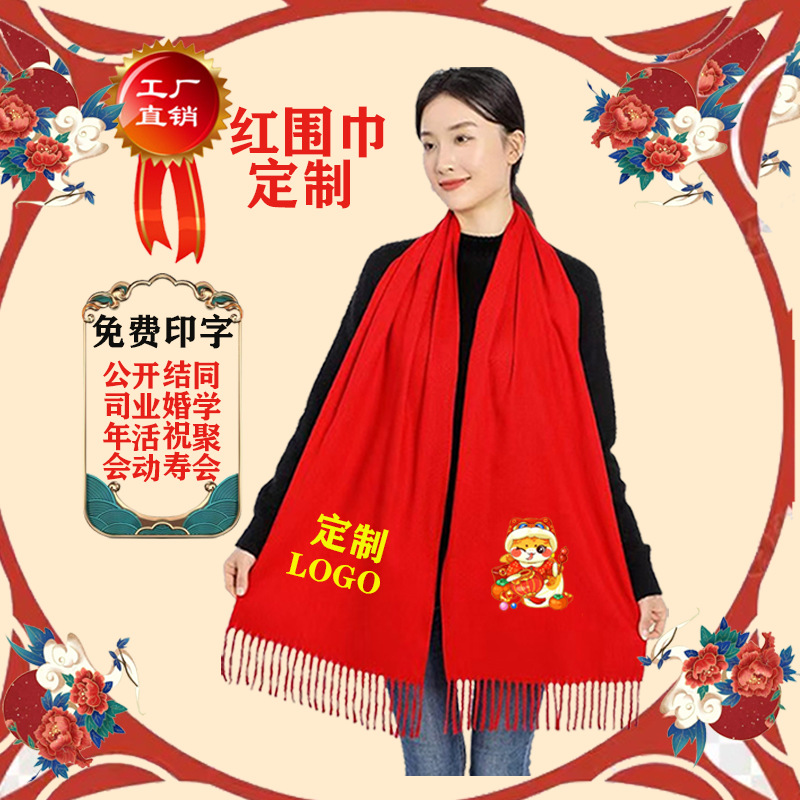 레드 스카프 도매 맞춤형 로고 연례 회의 큰 빨간 캐시미어 중국 빨간 스카프 자수 인쇄