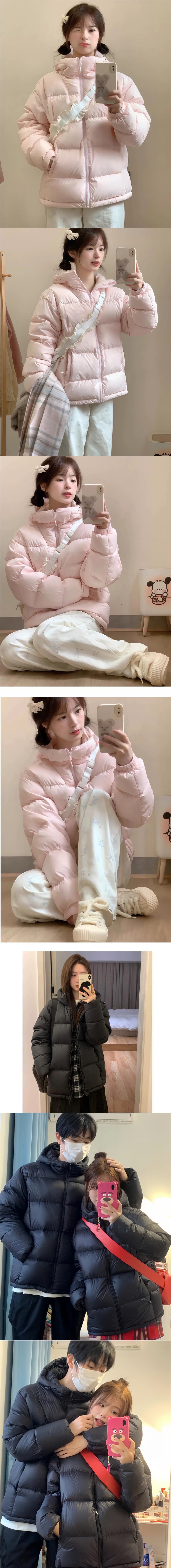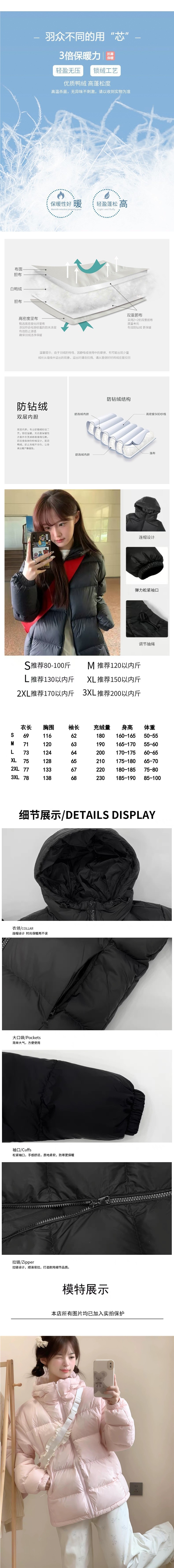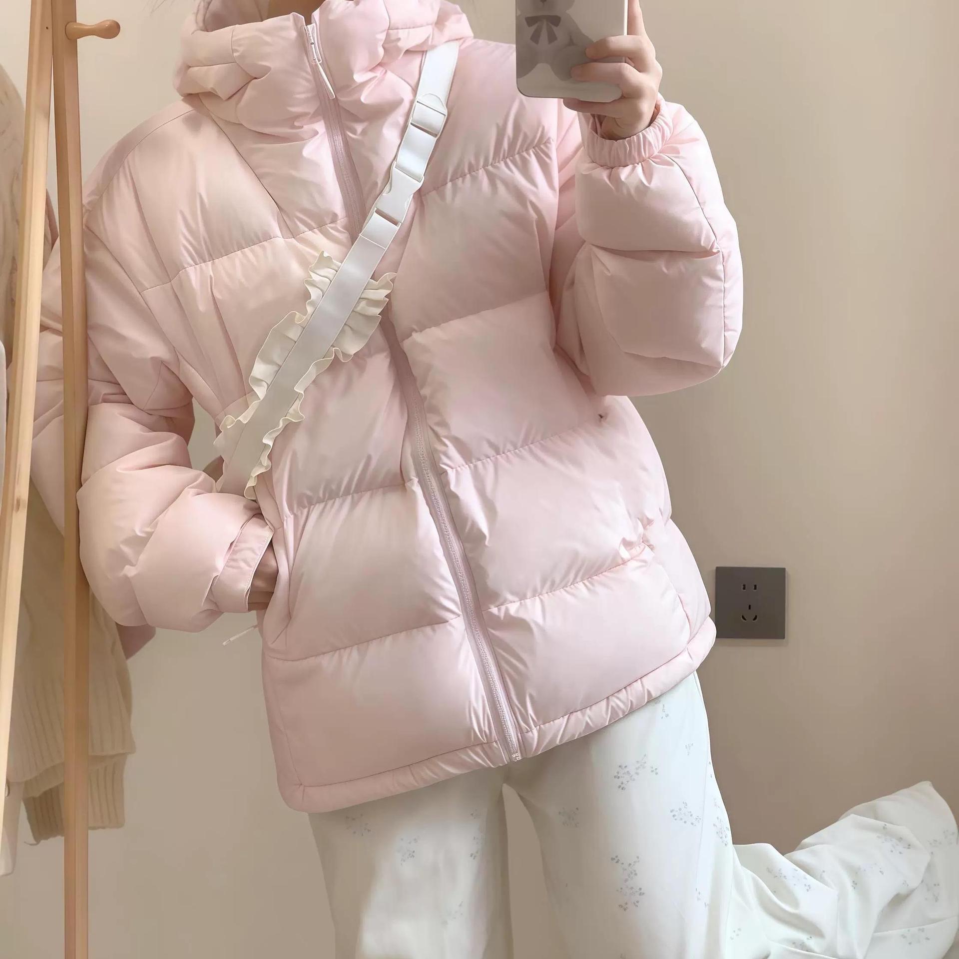 2024 새로운 흰 오리 아래로 두껍게 짧은 재킷 여성의 겨울 검은 두건 빵 세트 학생 커플 코트