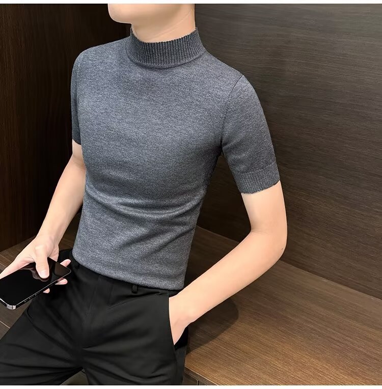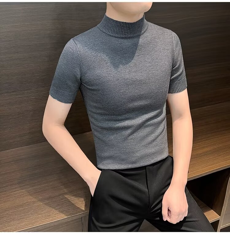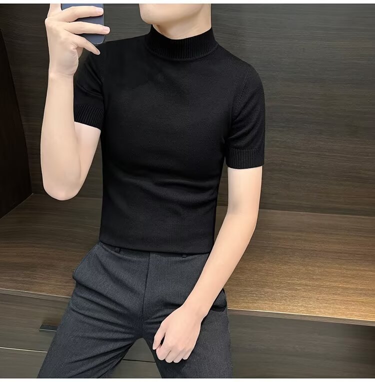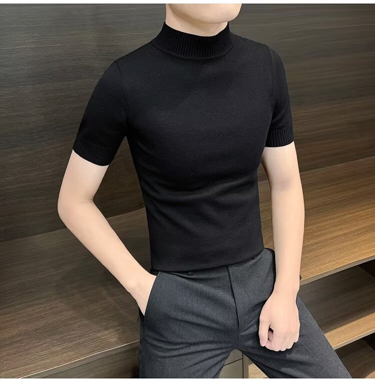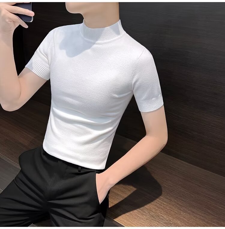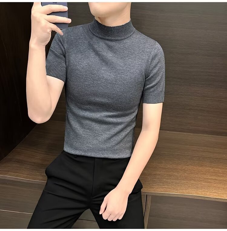 가을 겨울 한국 스타일 슬림핏 남성 하프 터틀넥 반팔 티셔츠 남성 타이트 스트레치 스웨터 라운드 넥 베이스 레이어 셔츠