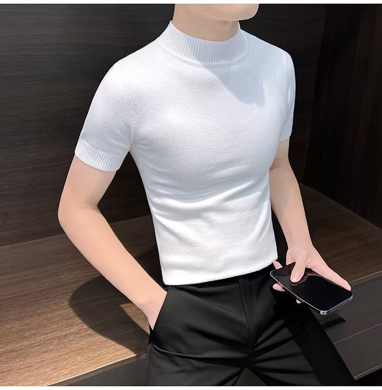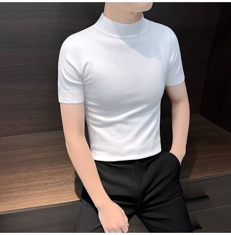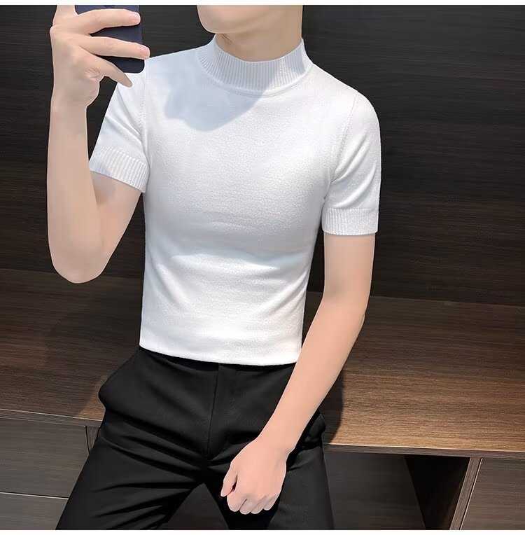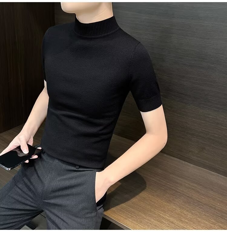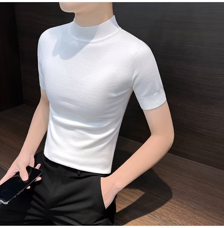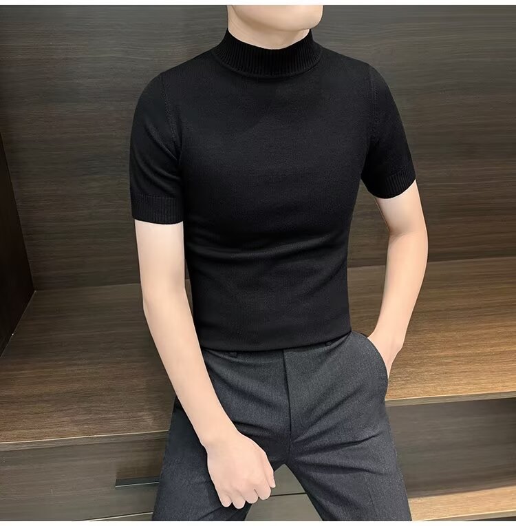 가을 겨울 한국 스타일 슬림핏 남성 하프 터틀넥 반팔 티셔츠 남성 타이트 스트레치 스웨터 라운드 넥 베이스 레이어 셔츠