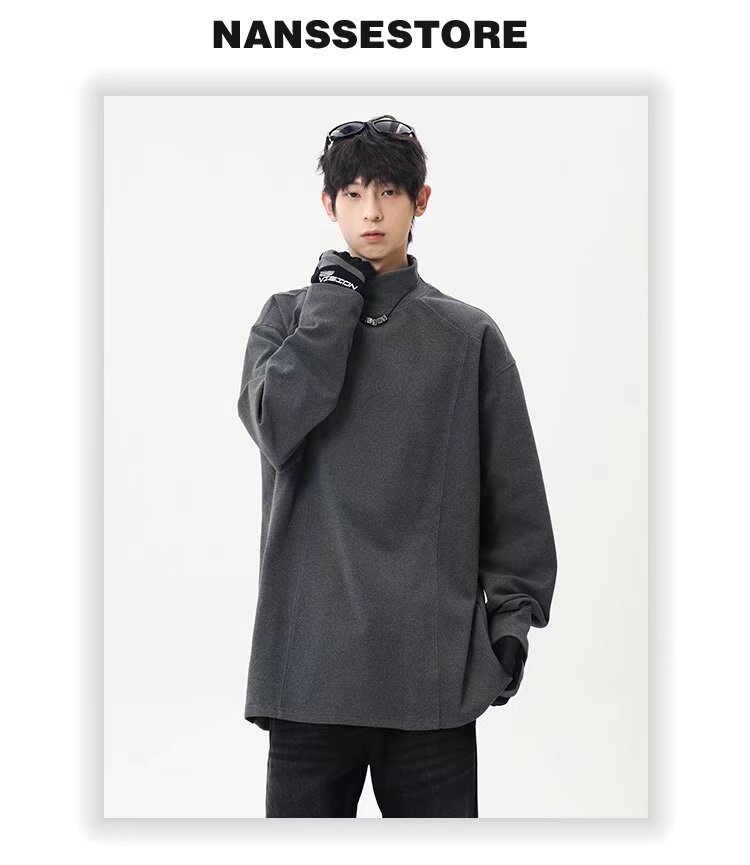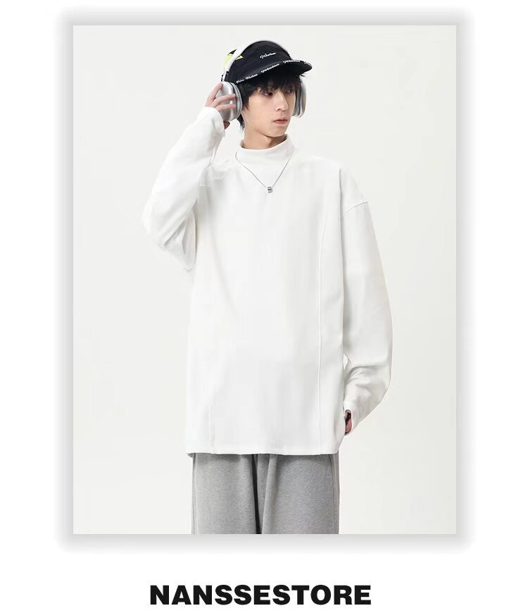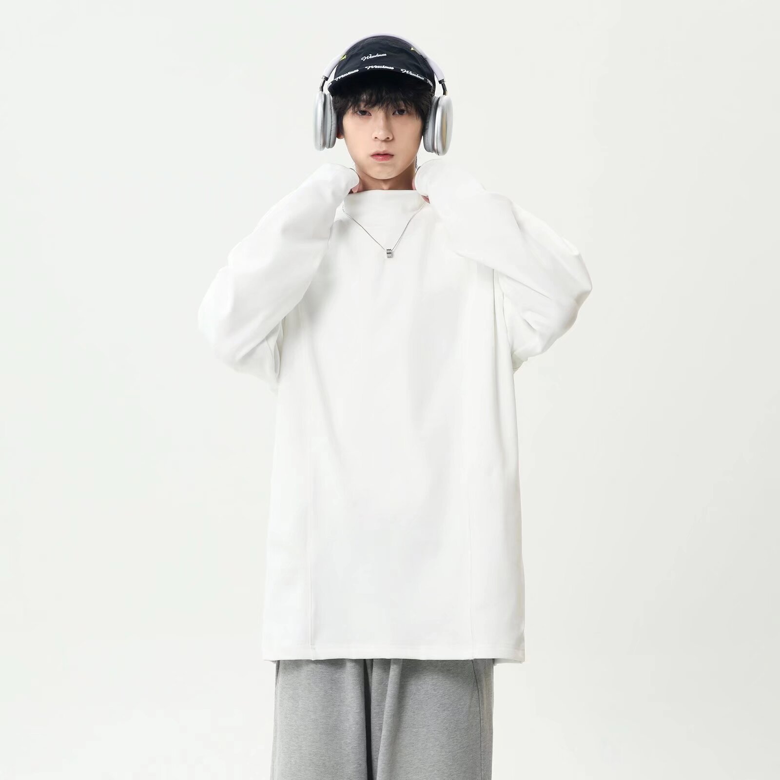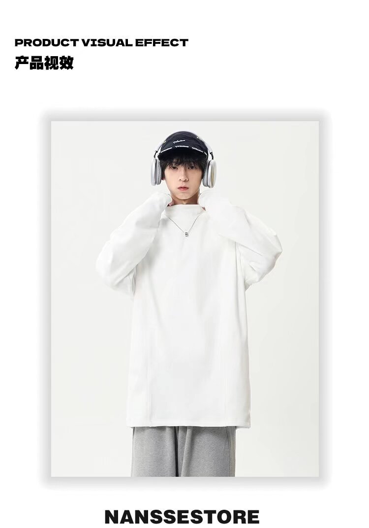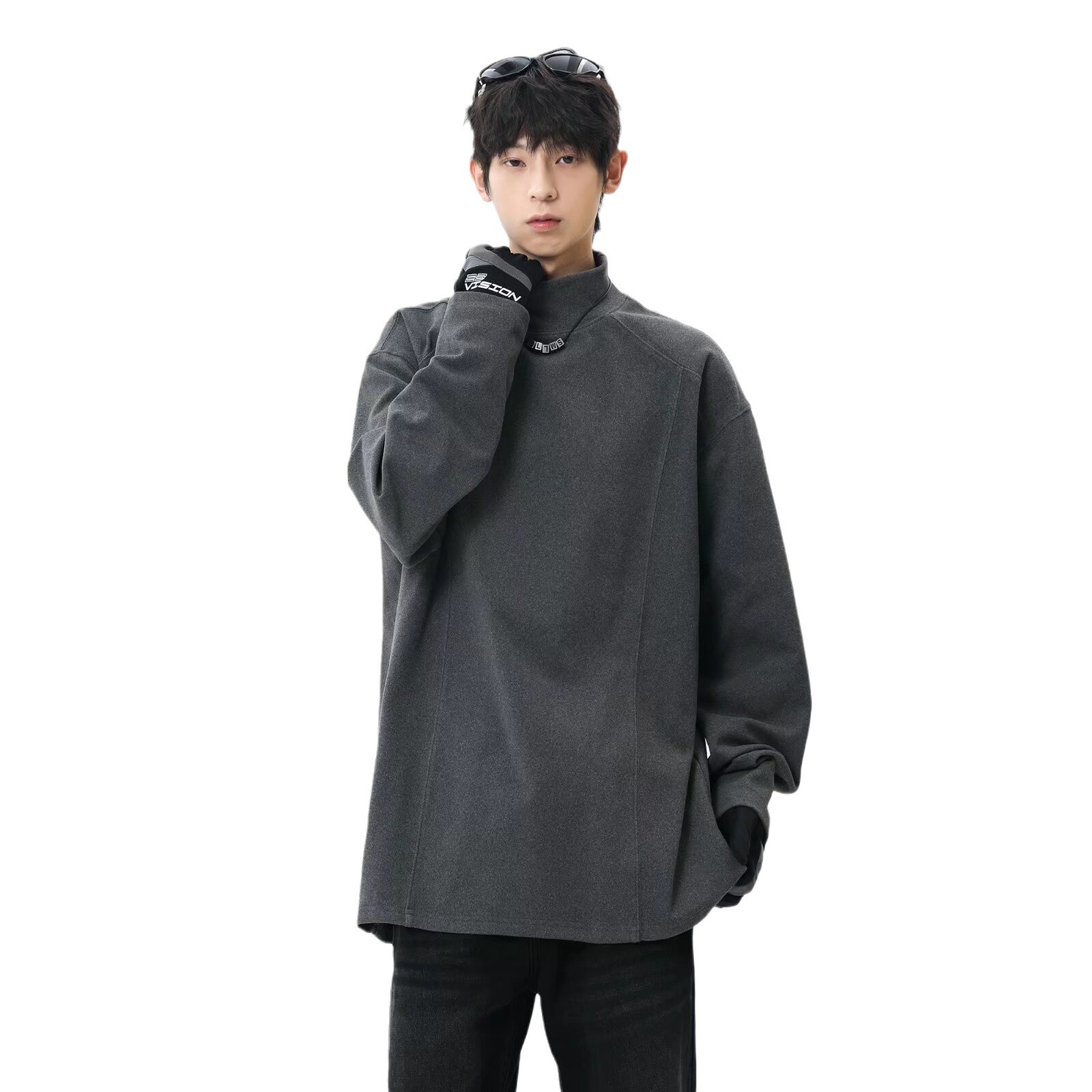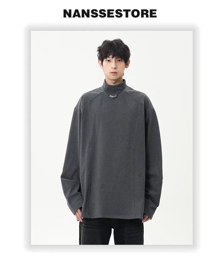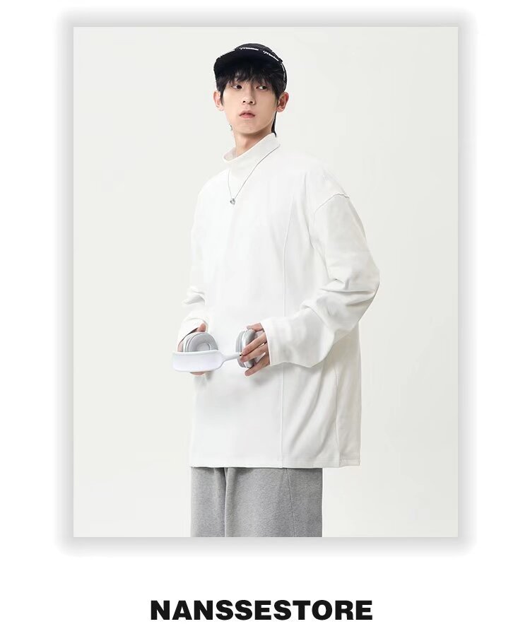 솔리드 컬러 세미 하이 넥 벨벳 긴팔 티셔츠 남성 가을 및 겨울 미국 디자인 센스 숄더 스웨트 셔츠 (베이스 탑 포함)