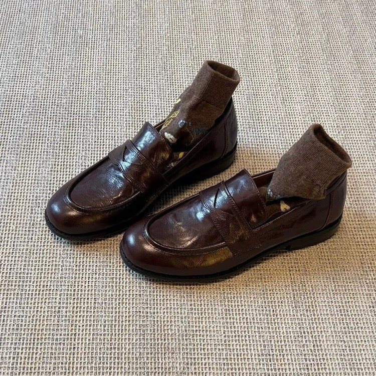 로퍼 패션 레트로 플랫 싱글 레이어 신발 영국 스타일 작은 가죽 신발 퍼가죽 올매치 슬립 온 로퍼 여성용 두꺼운 힐