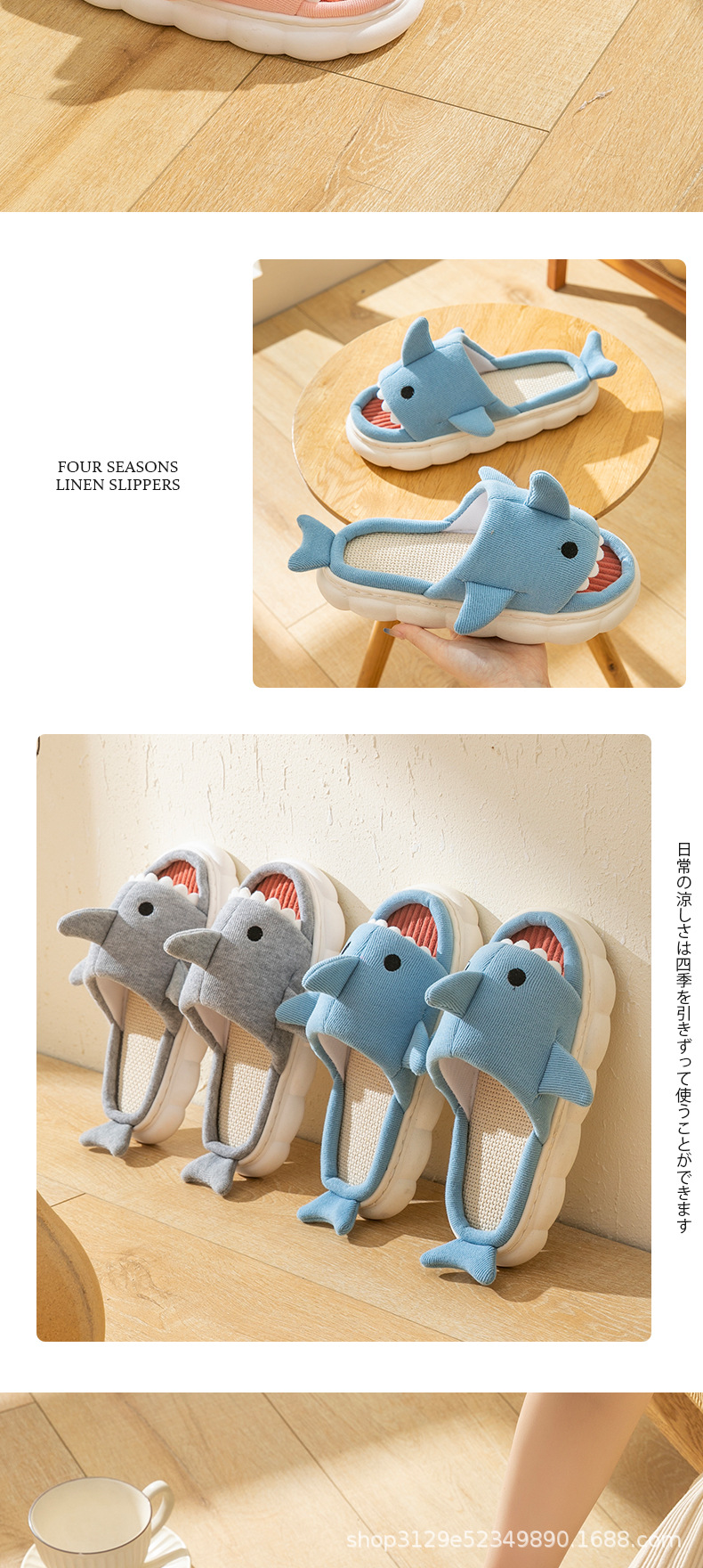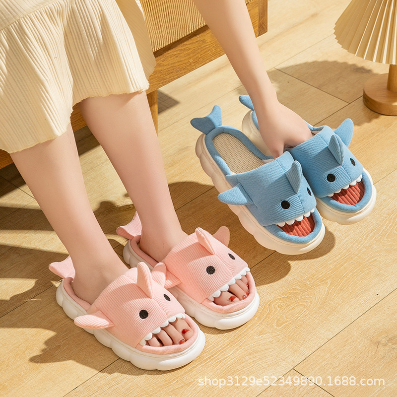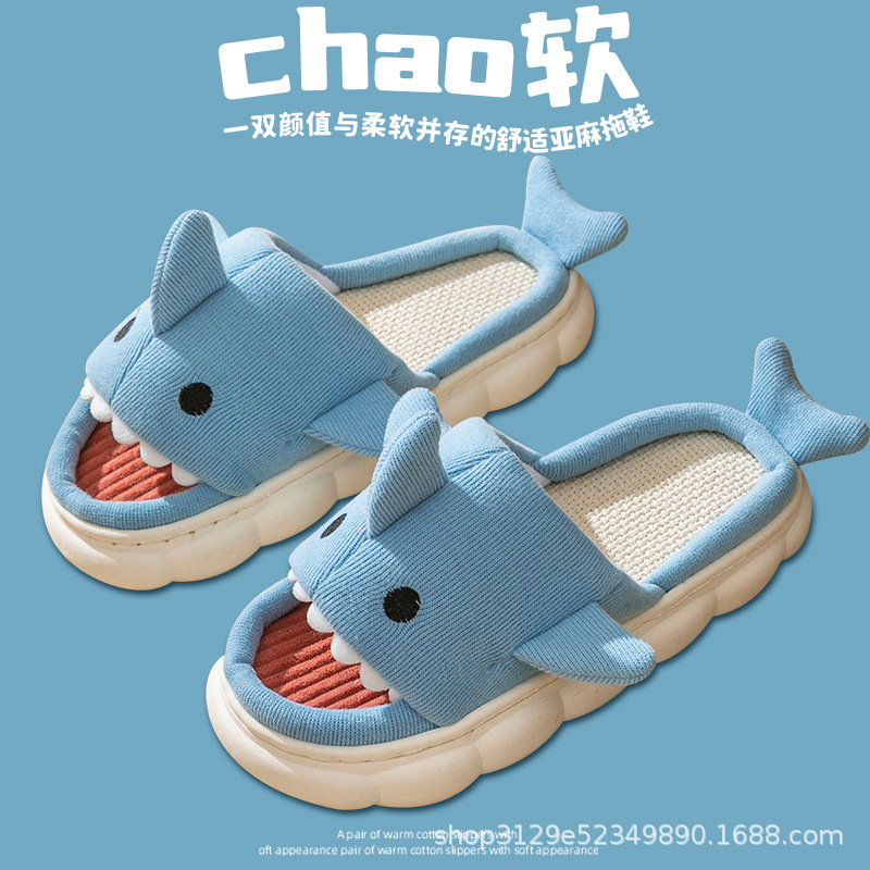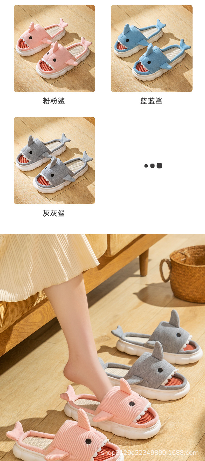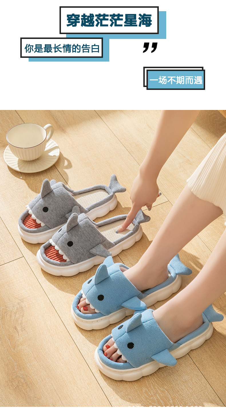 봄과 가을 리넨 슬리퍼 여성 상어 귀여운 만화 땀 흡수 통기성 미끄럼 방지 의상 홈 뮤트 커플 슬리퍼 도매