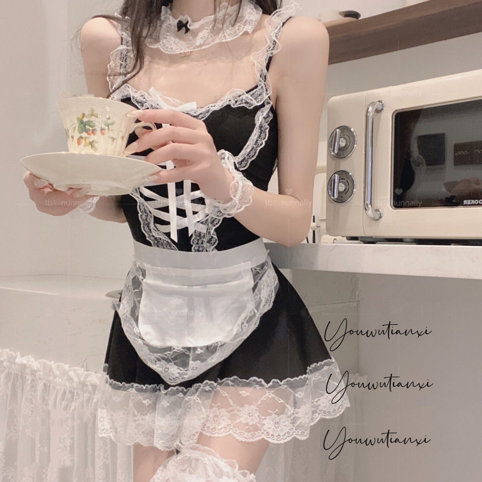메이드 코스 섹시한 메이드 유니폼 플러스 사이즈 슬링 나이트 가운 원피스 스커트 무료 침대 순수 세트