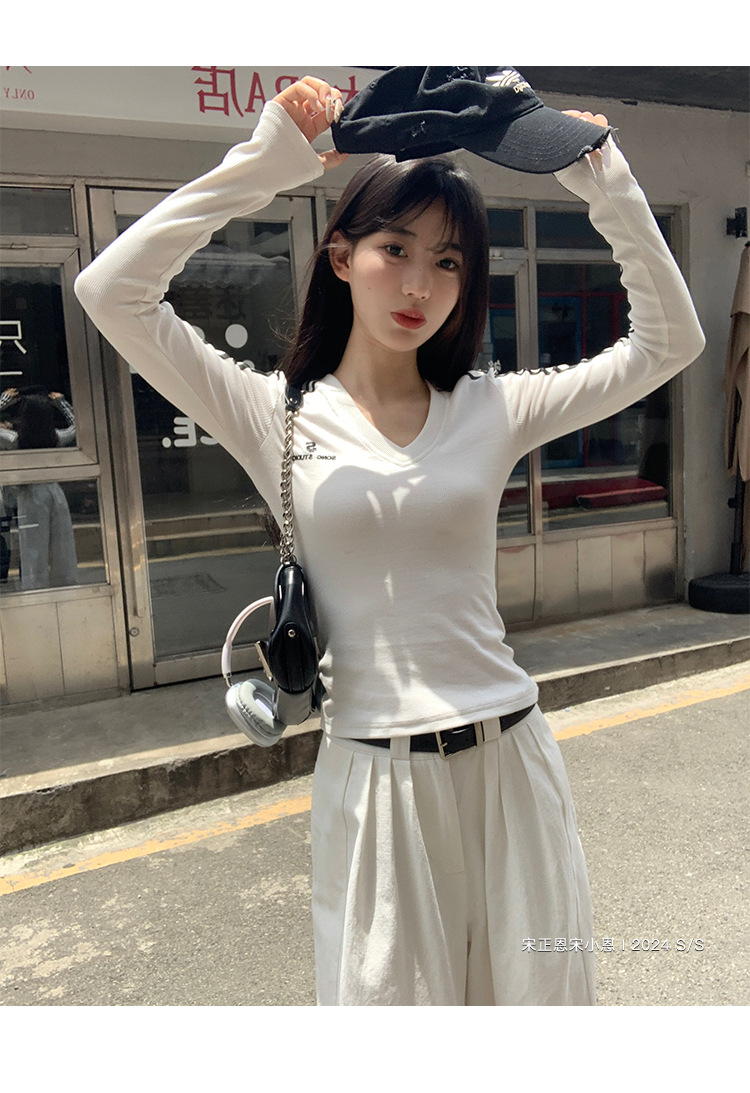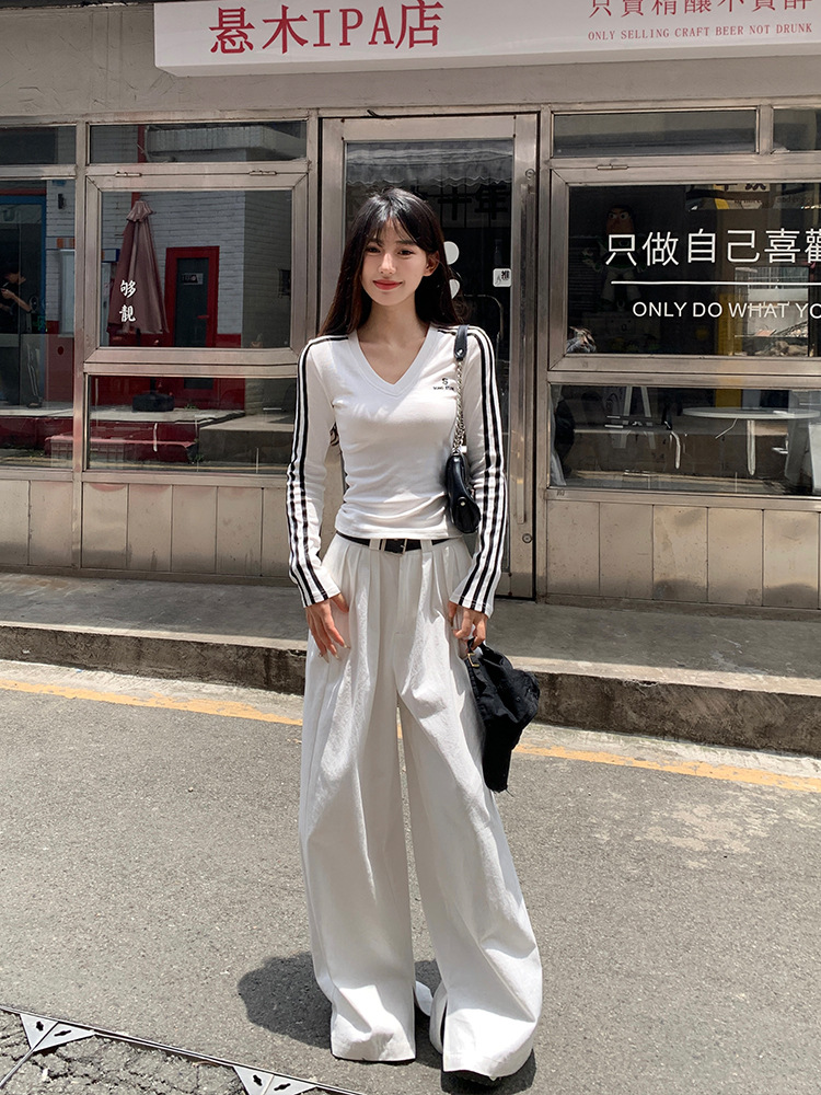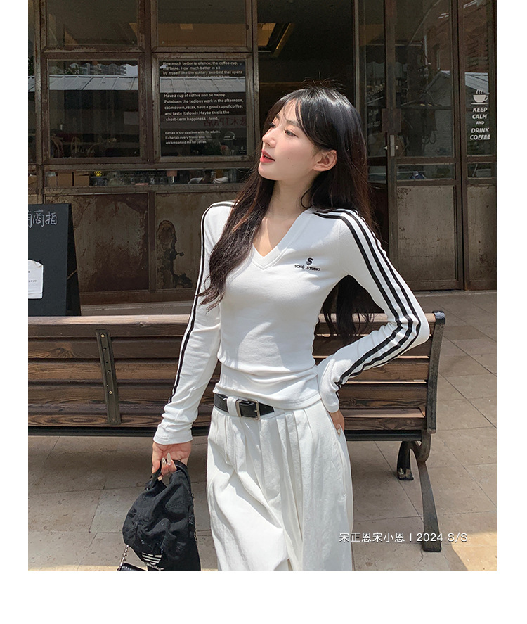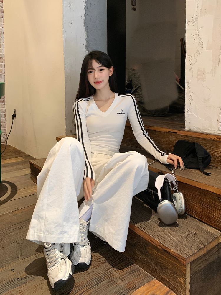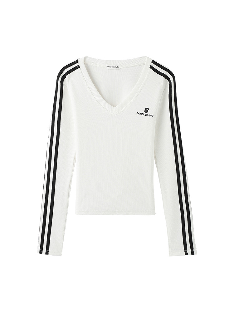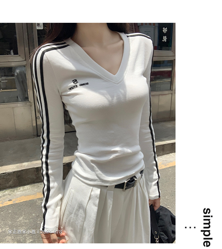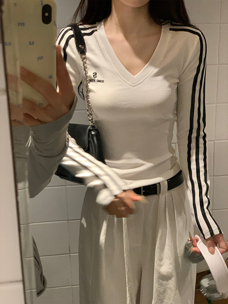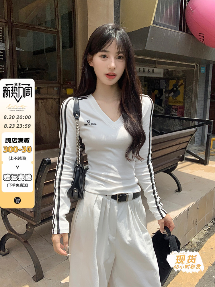 화이트 스트라이프 V-넥 긴팔 티셔츠 여성의 봄과 가을 2025 슬림 핏 내베이스 셔츠 짧은 타이트탑