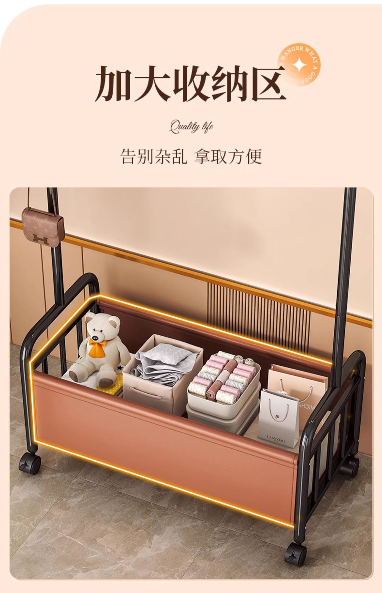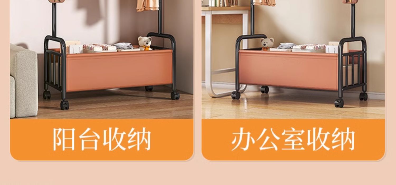 [화이트 오렌지 100cm] 두꺼운 옷걸이봉|옷걸이 6개 + 가죽 수납바구니