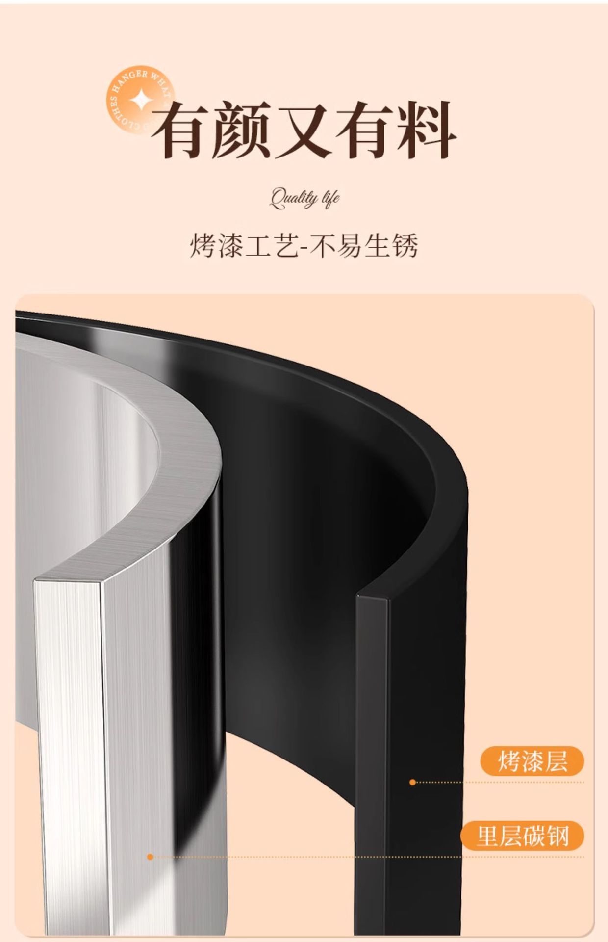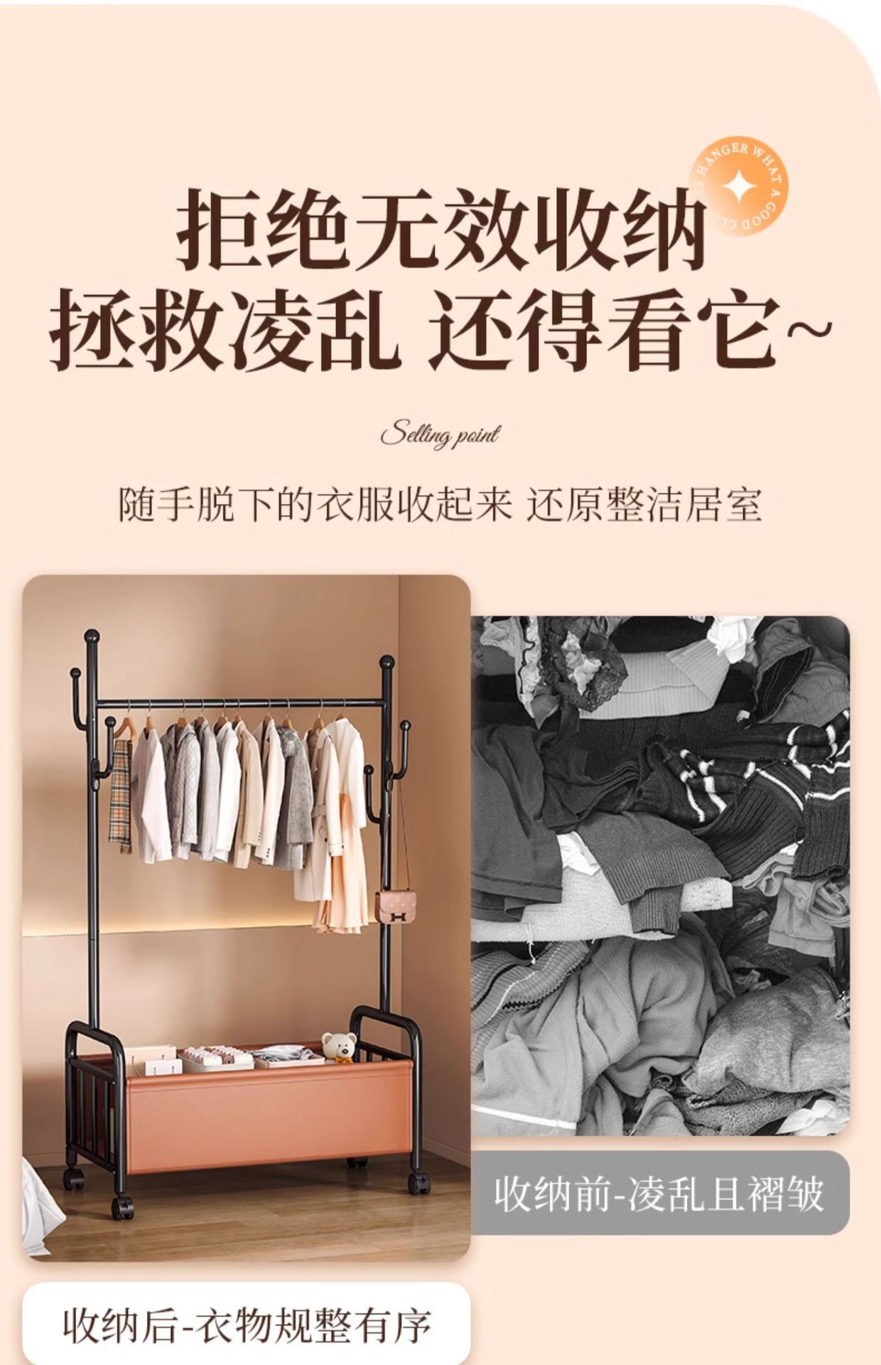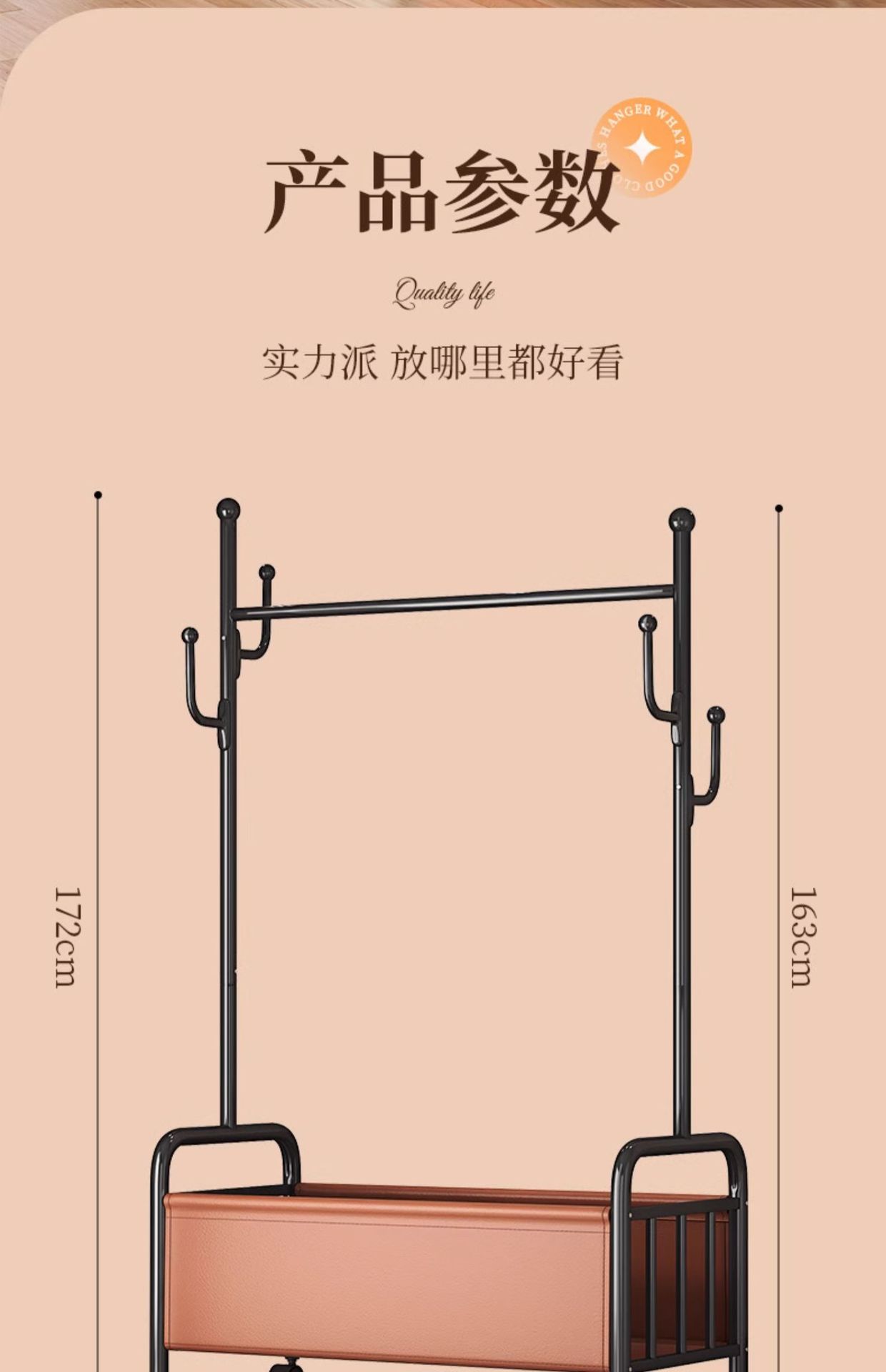 [화이트 오렌지 80cm] 두꺼운 옷걸이봉|옷걸이 6개 + 가죽 수납바구니
