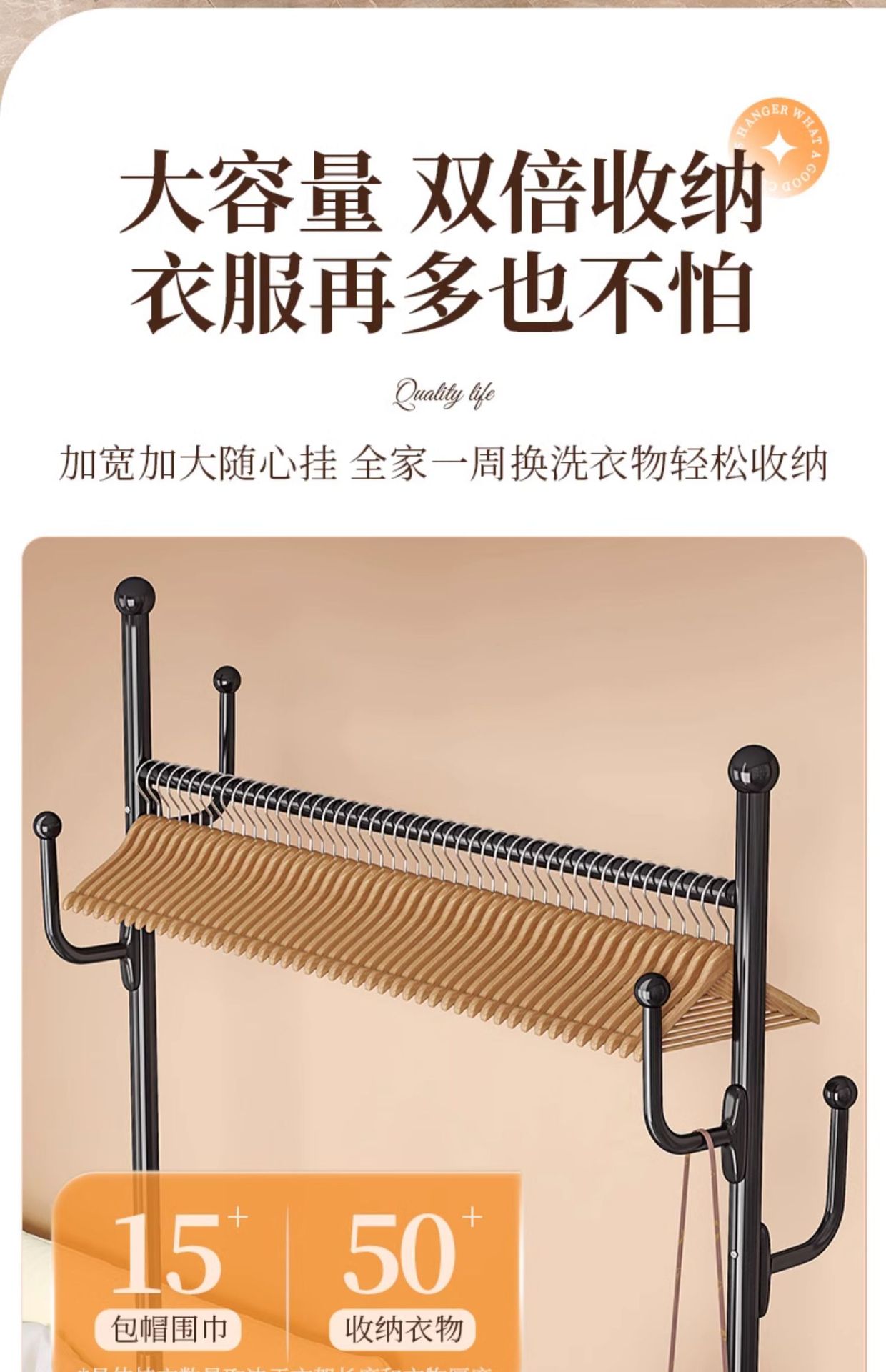 [바이바이 80cm] 두꺼운 옷걸이봉|옷걸이 6개 + 가죽 수납바구니