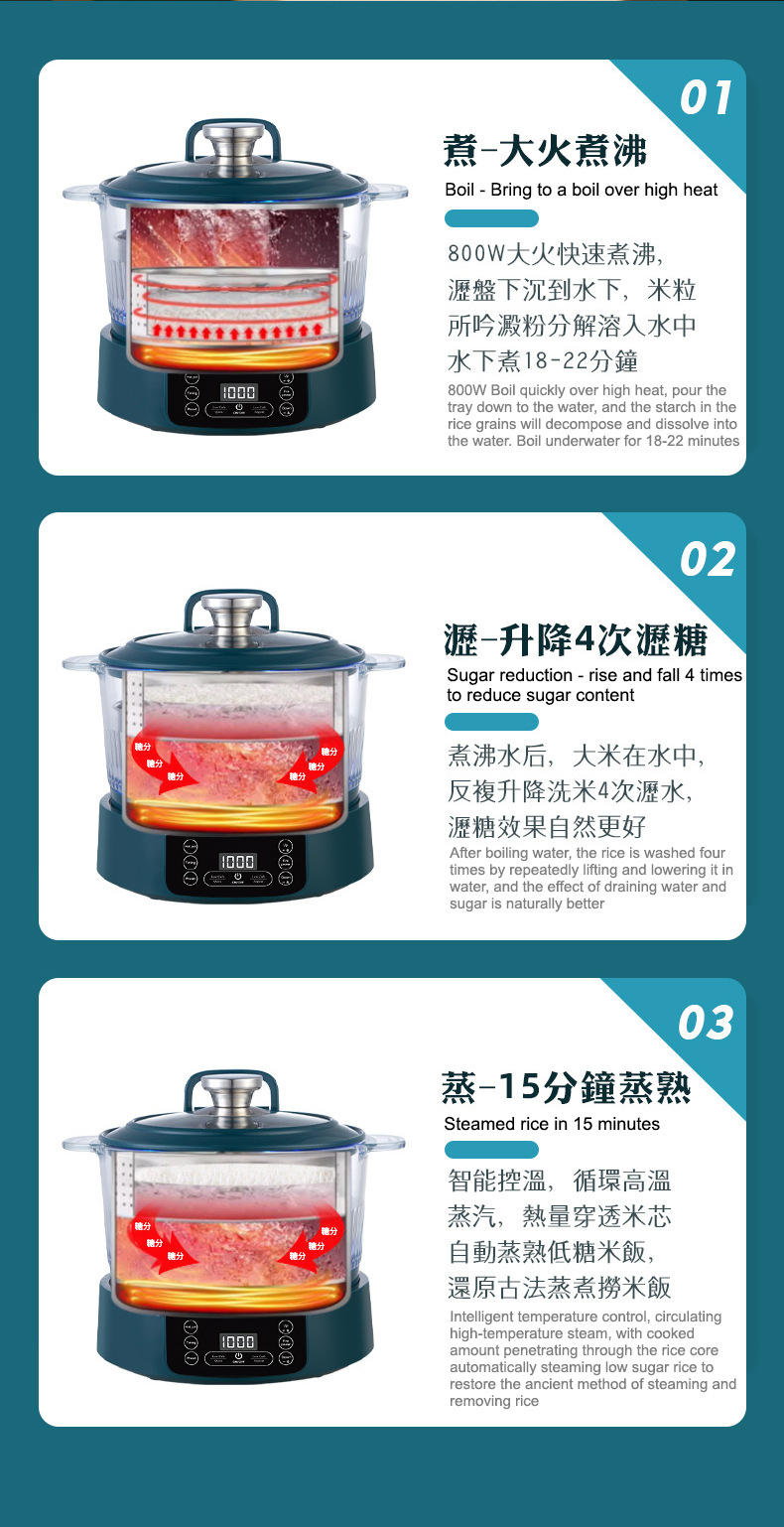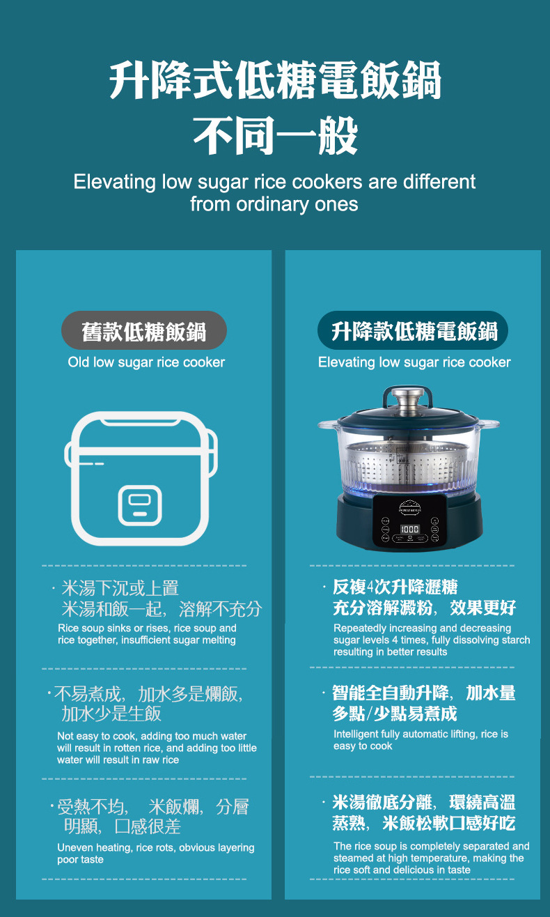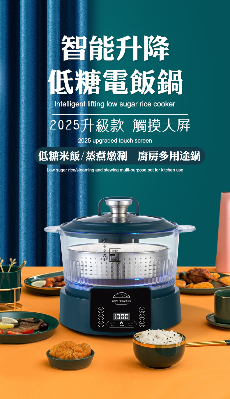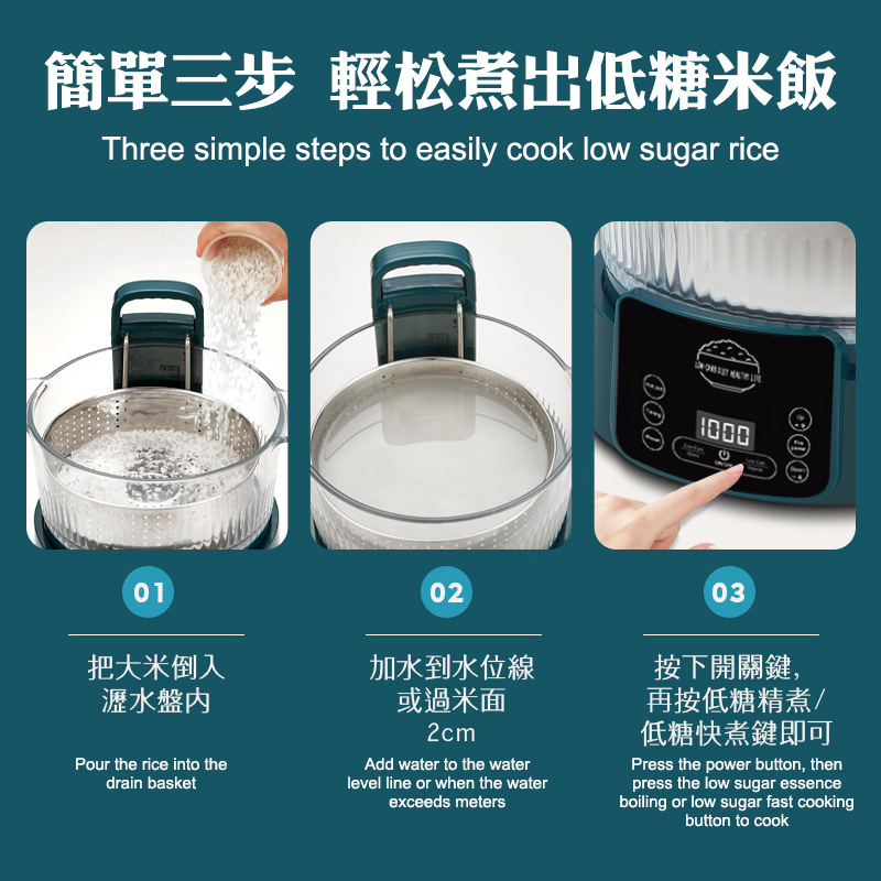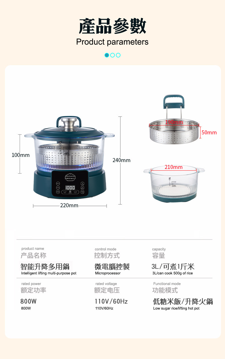 110V 다기능 밥솥 가정용 지능형 리프팅 밥솥 쌀 수프 분리 제어 설탕 김이 나는 쌀 유리 투명 3L
