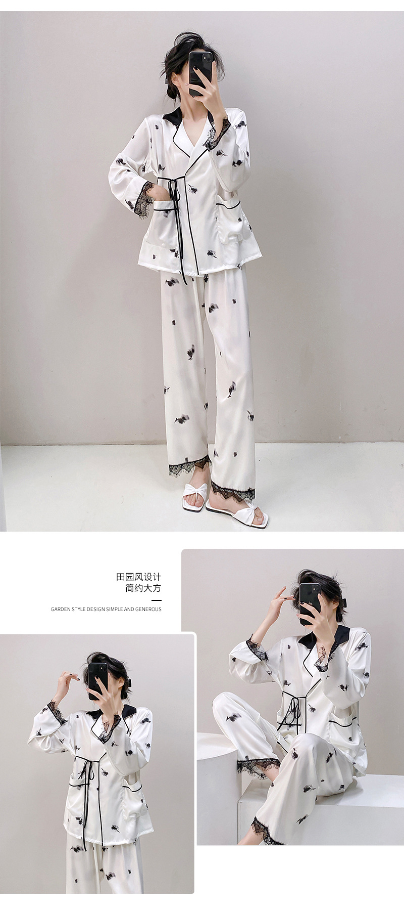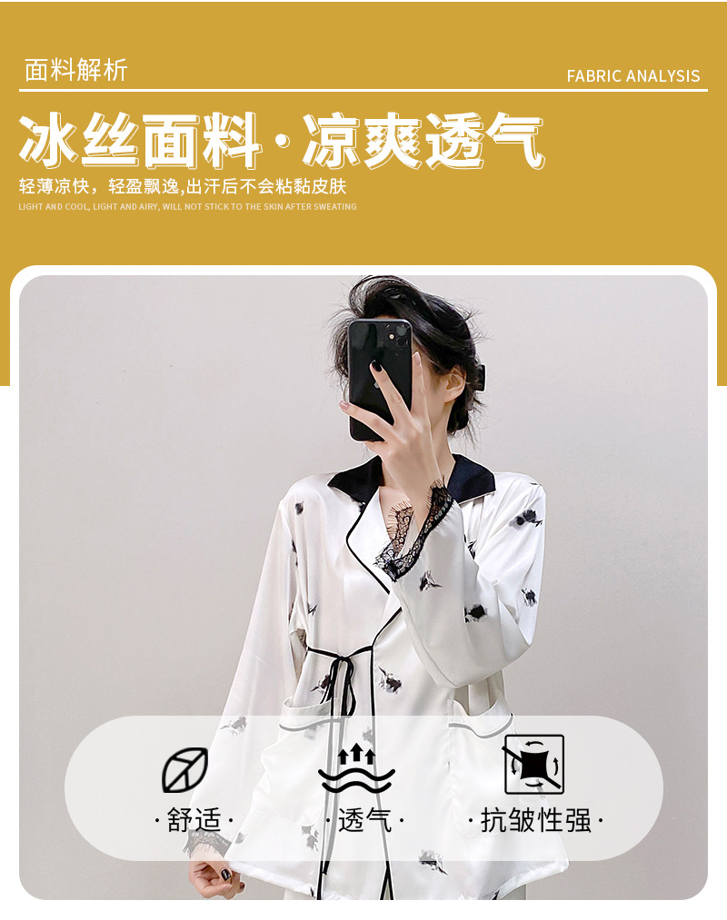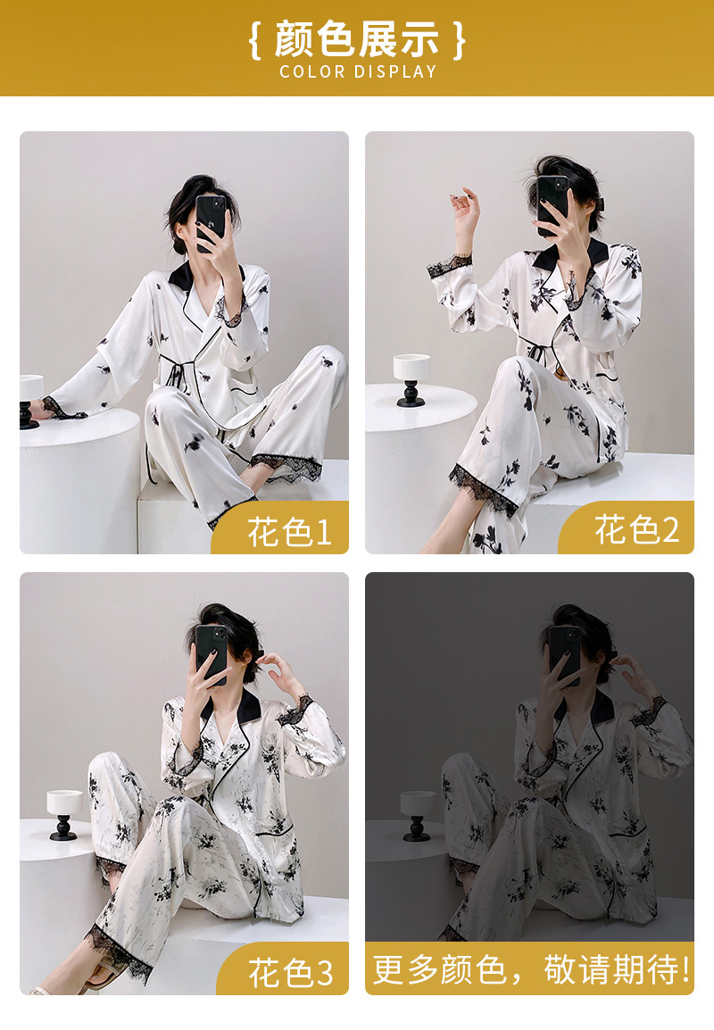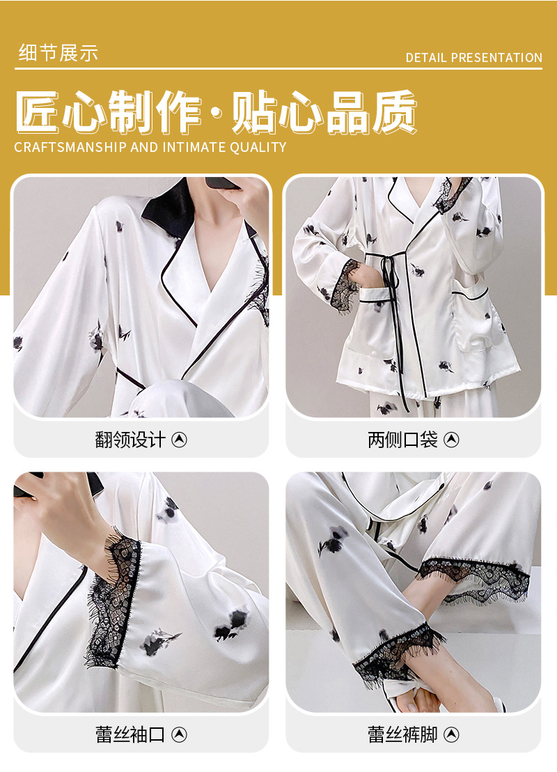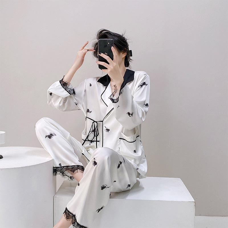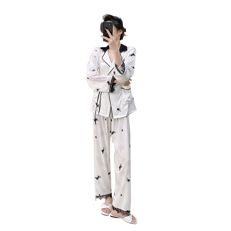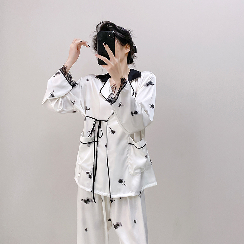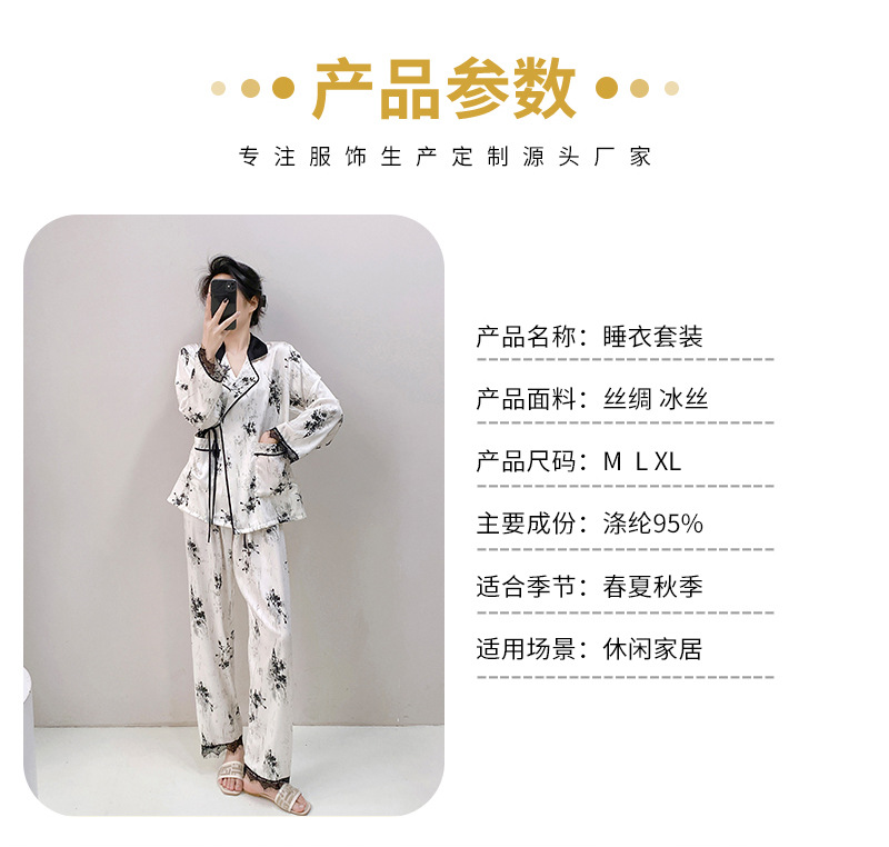 새로운 실크 여성용 잠옷, 수묵화 프린트, 캐주얼 긴팔 긴바지, 아이스 실크, 집에서 입을 수 있는 투피스 세트