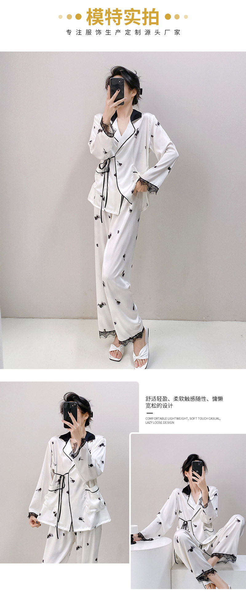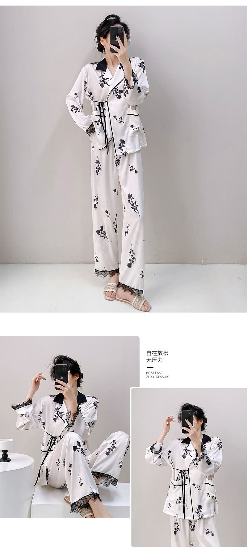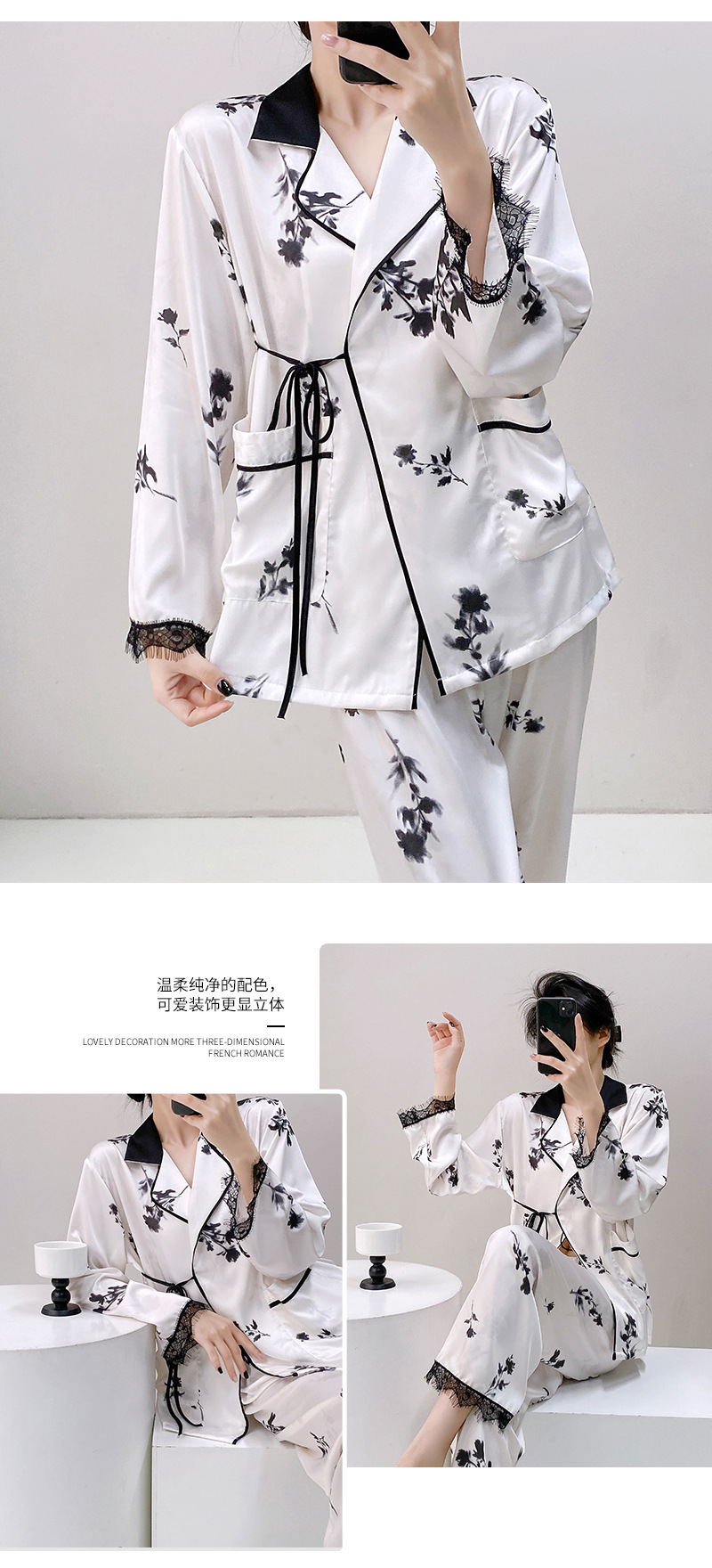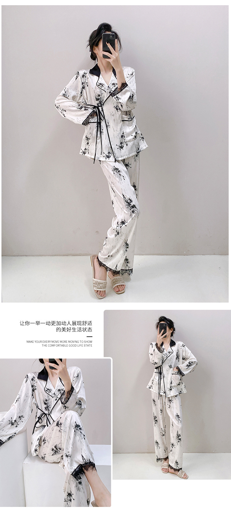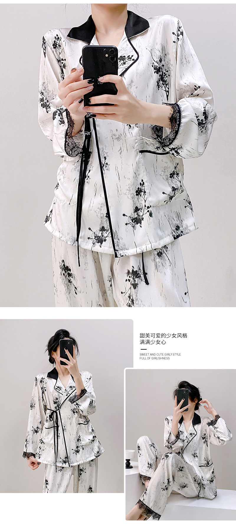 새로운 실크 여성용 잠옷, 수묵화 프린트, 캐주얼 긴팔 긴바지, 아이스 실크, 집에서 입을 수 있는 투피스 세트