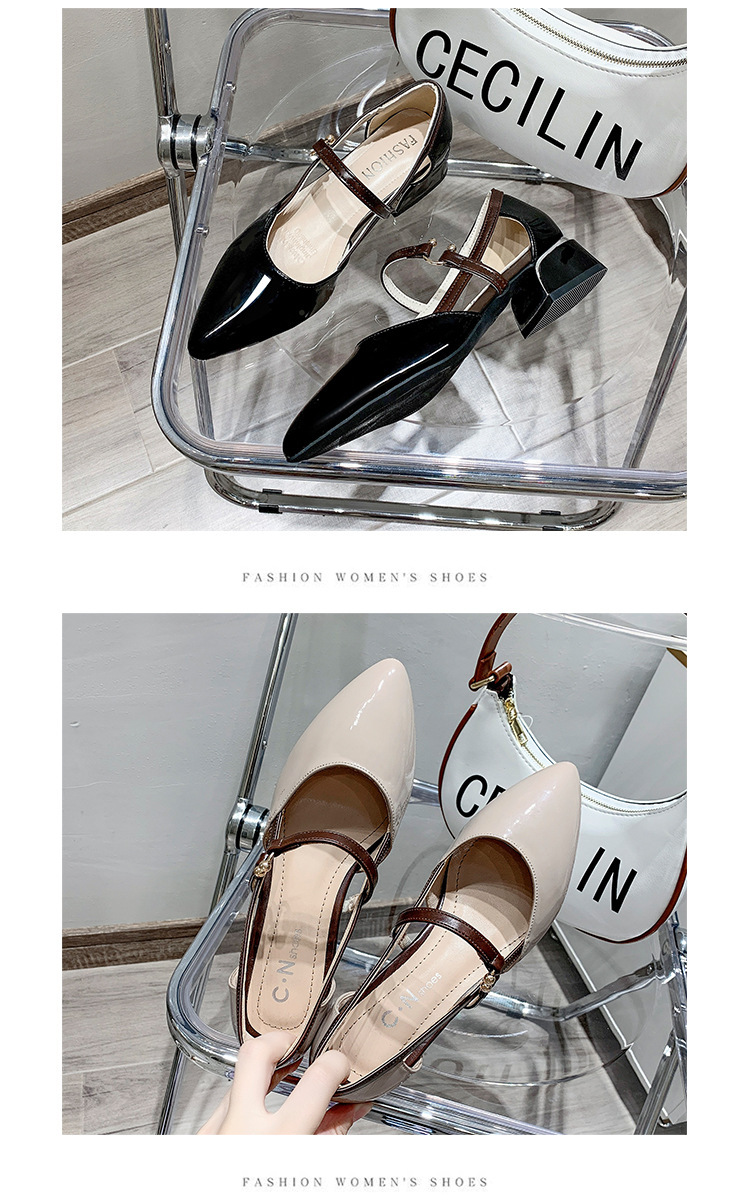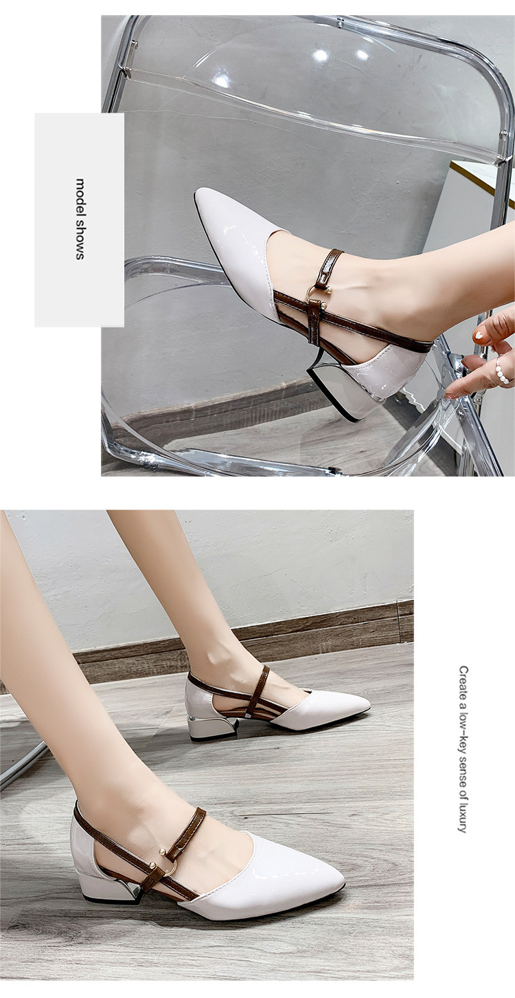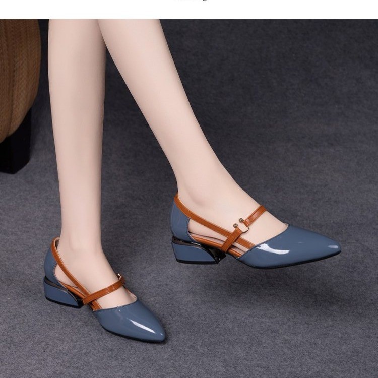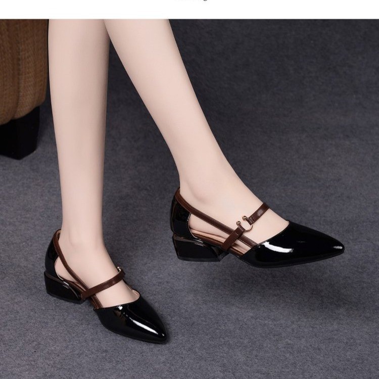 다재다능한 중공 버클 슈즈, 부드러운 가죽 토캡 샌들, 여성 여름 미드힐 한국식 포인티드 토 하이힐 가죽 슈즈