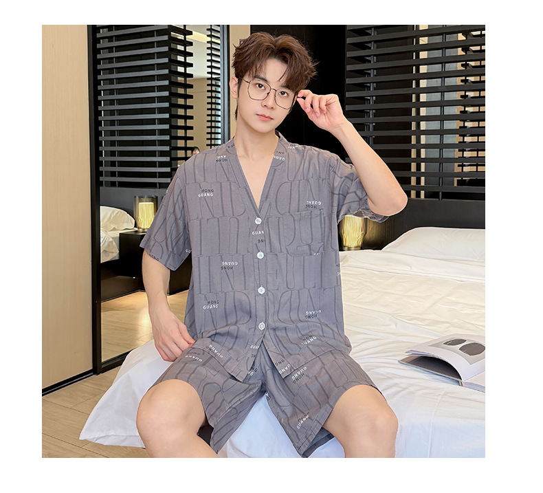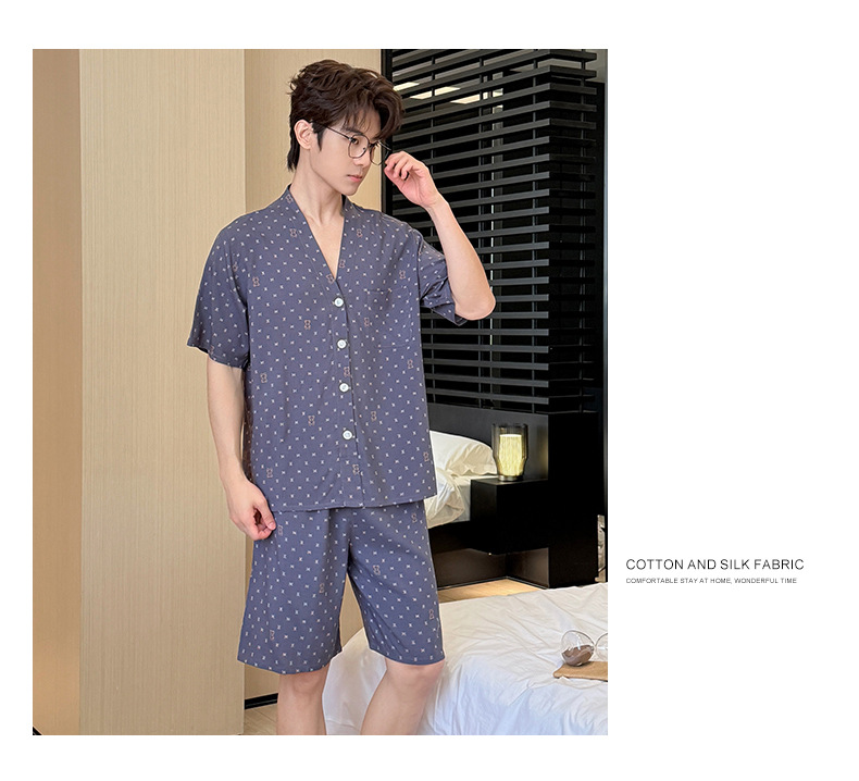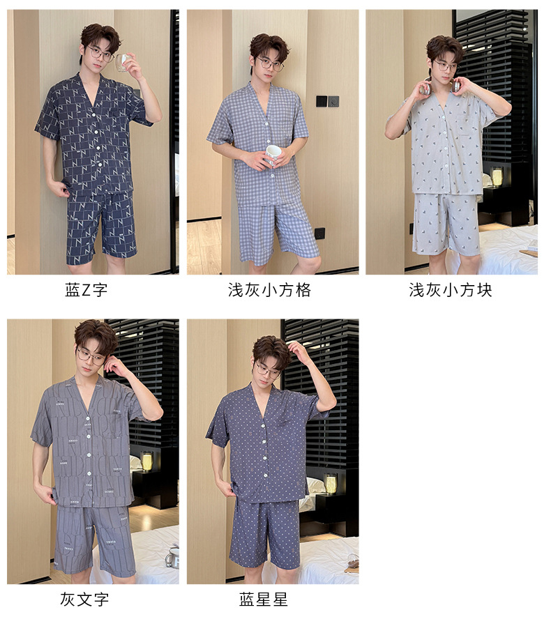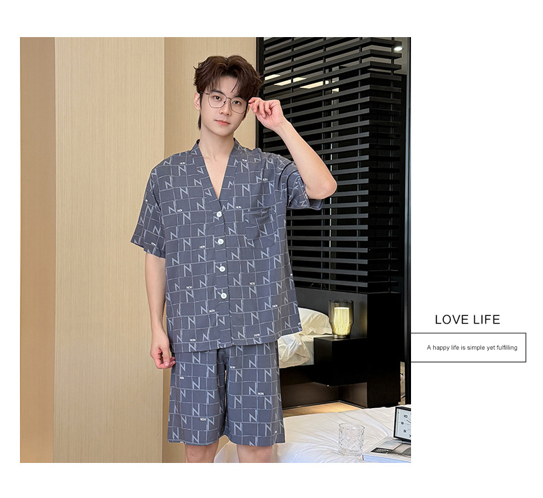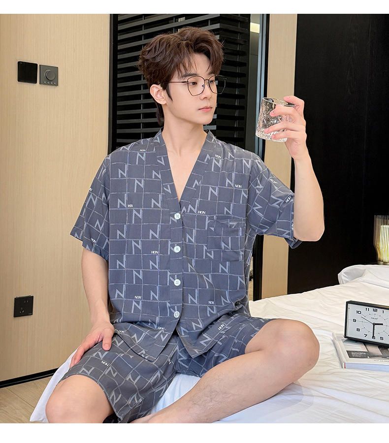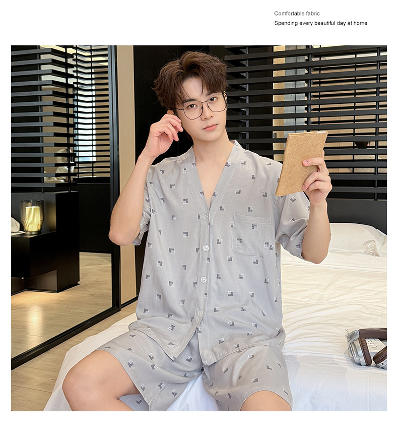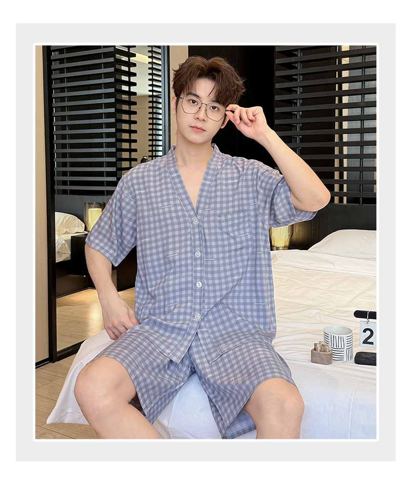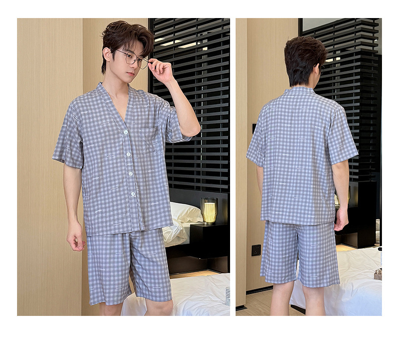 여름 남성 면 실크 잠옷, 반팔 가디건, 루즈한 캐주얼 레이온 체크 무늬 잠옷, 집 옷, 야외에서 착용 가능