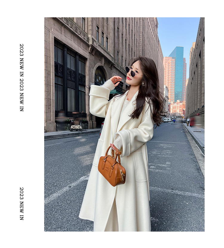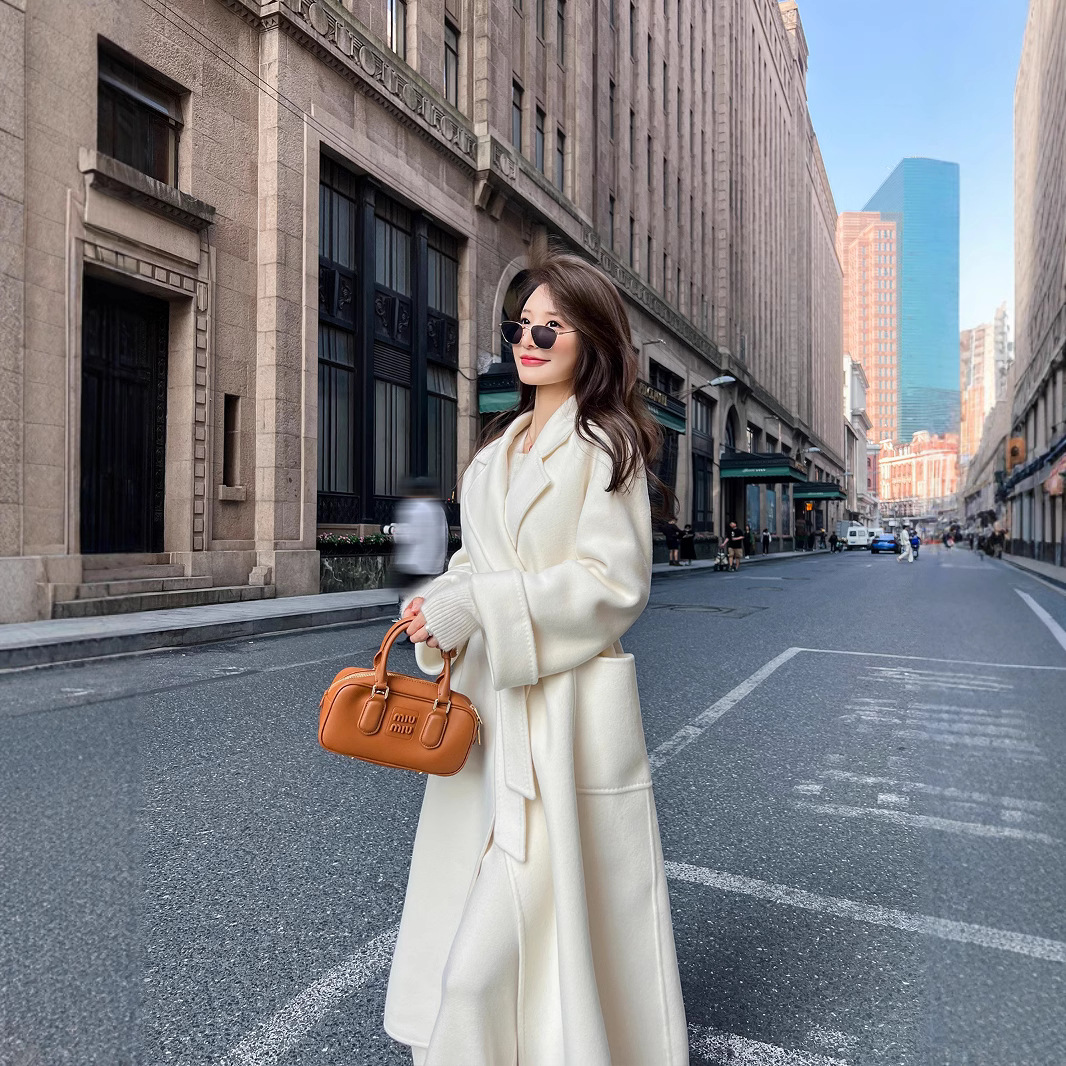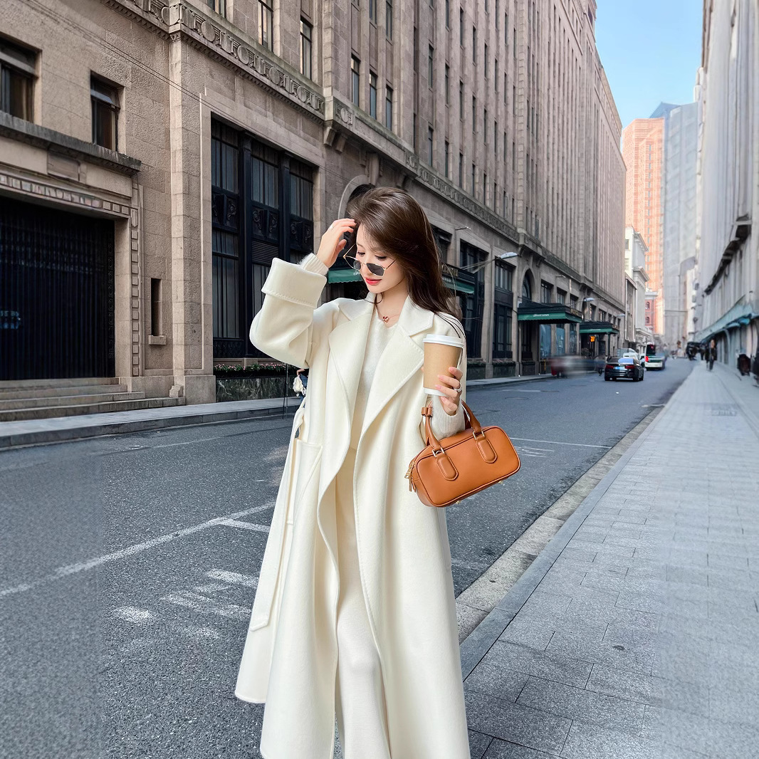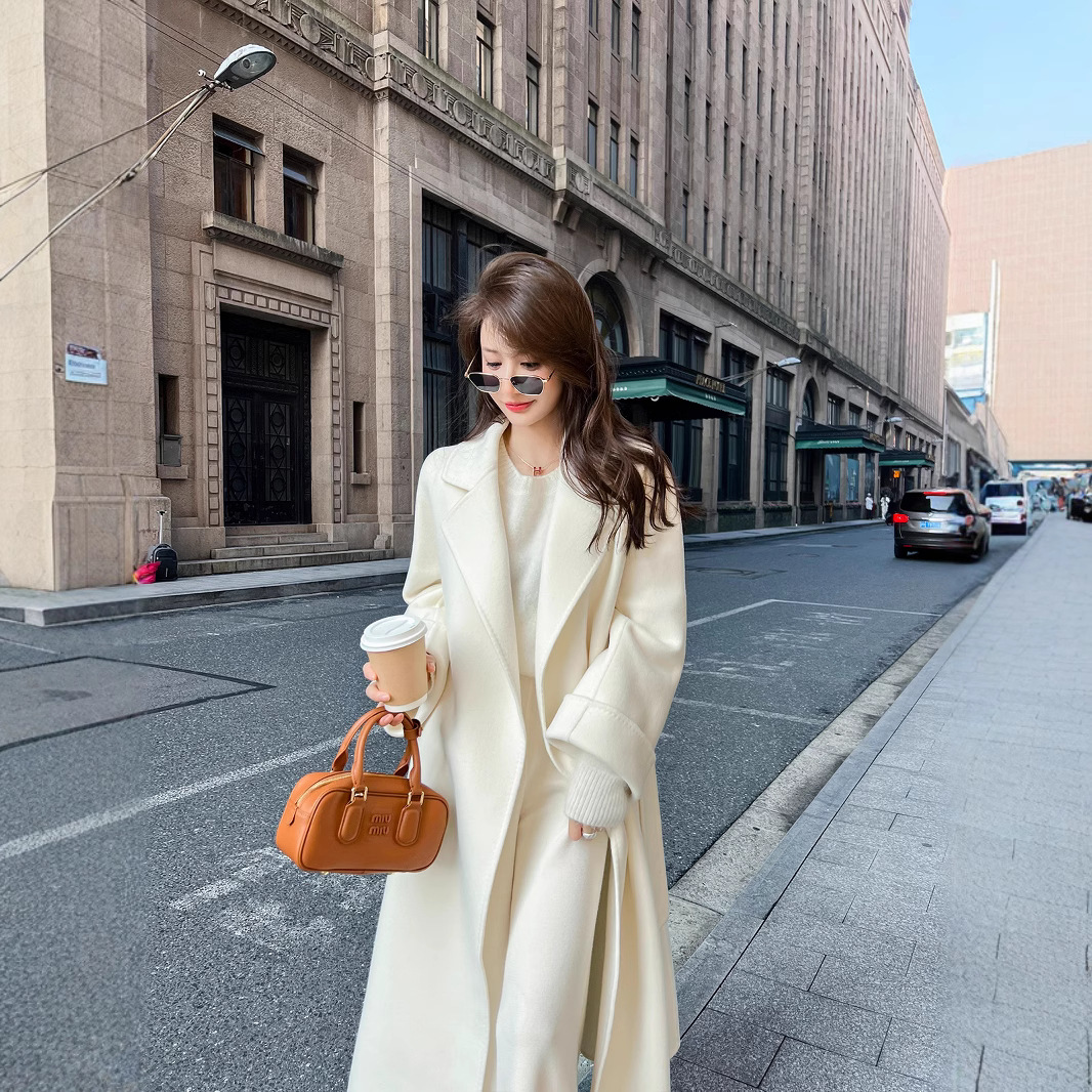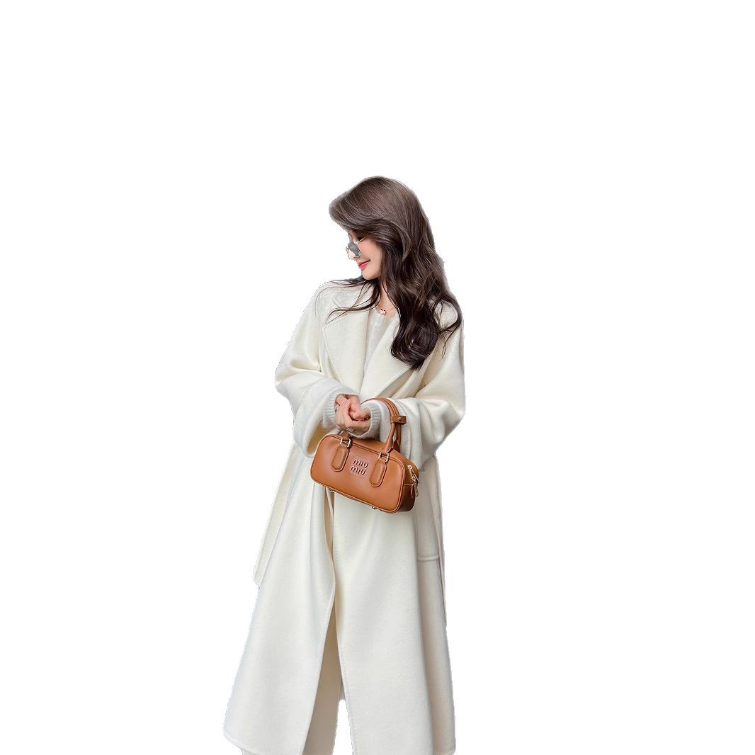 흰색 양면 캐시미어 코트 여자 중장 2025 봄 및 겨울 인기있는 새로운 헵번 스타일 고급 모직 코트