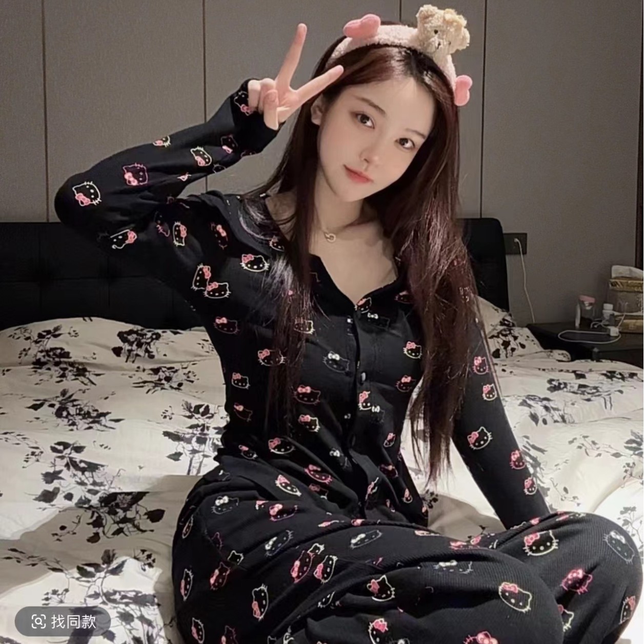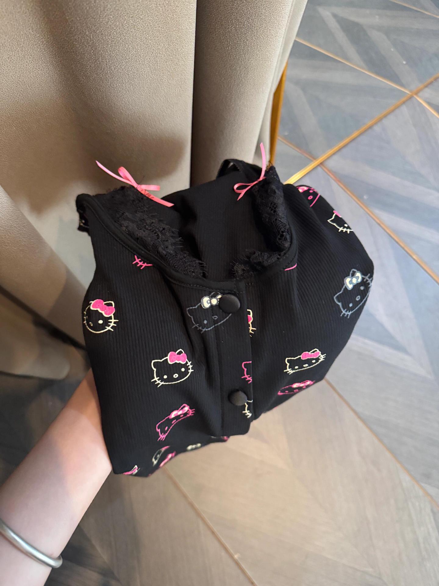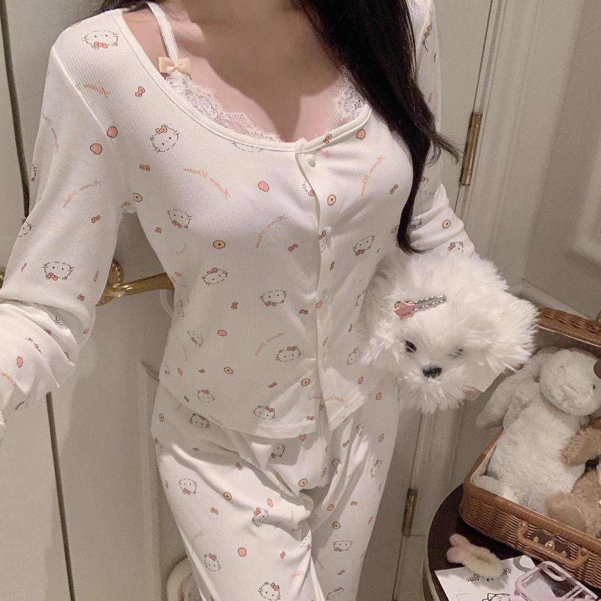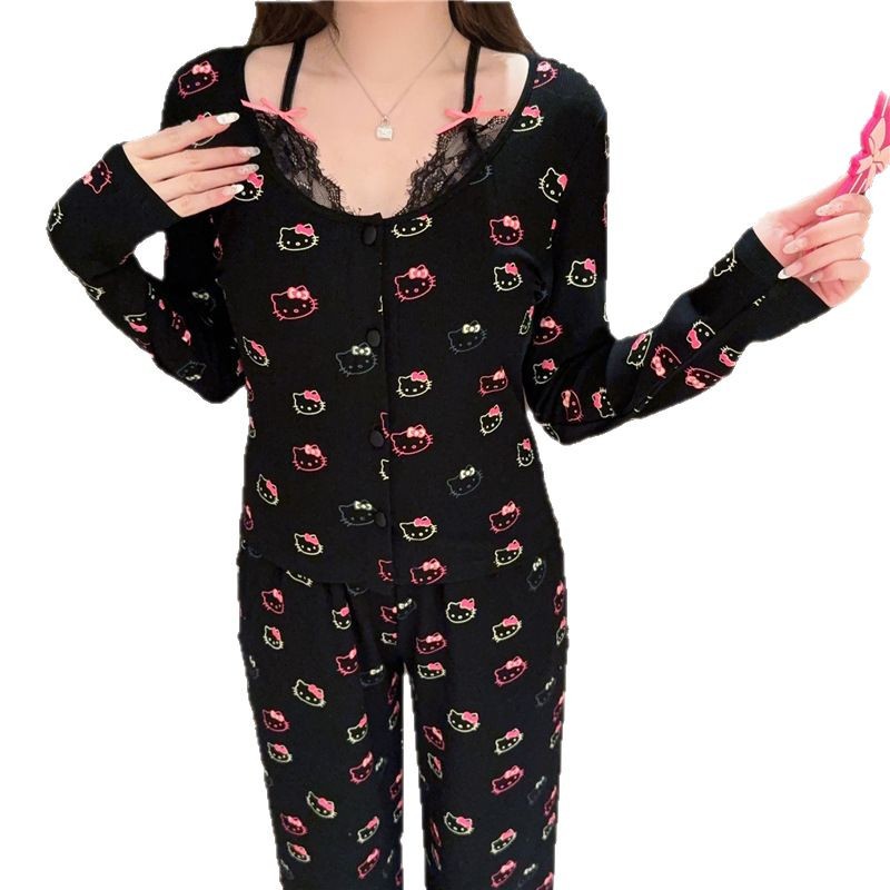 여성용 가슴 패드가 있는 인기 헬로키티 봄, 가을 잠옷 모달 코튼 레이스 하이 엔드 루즈 캐주얼 아우터웨어