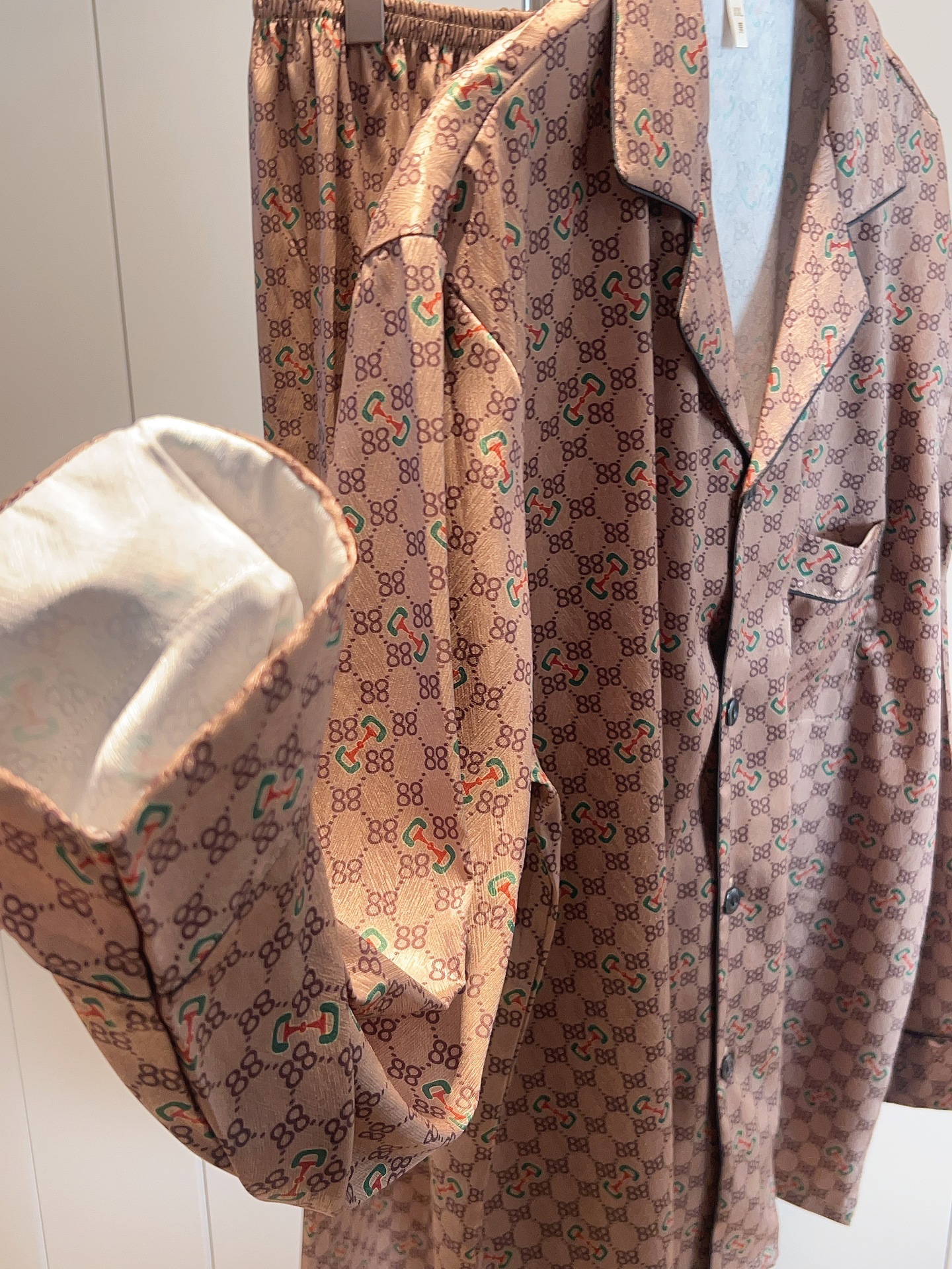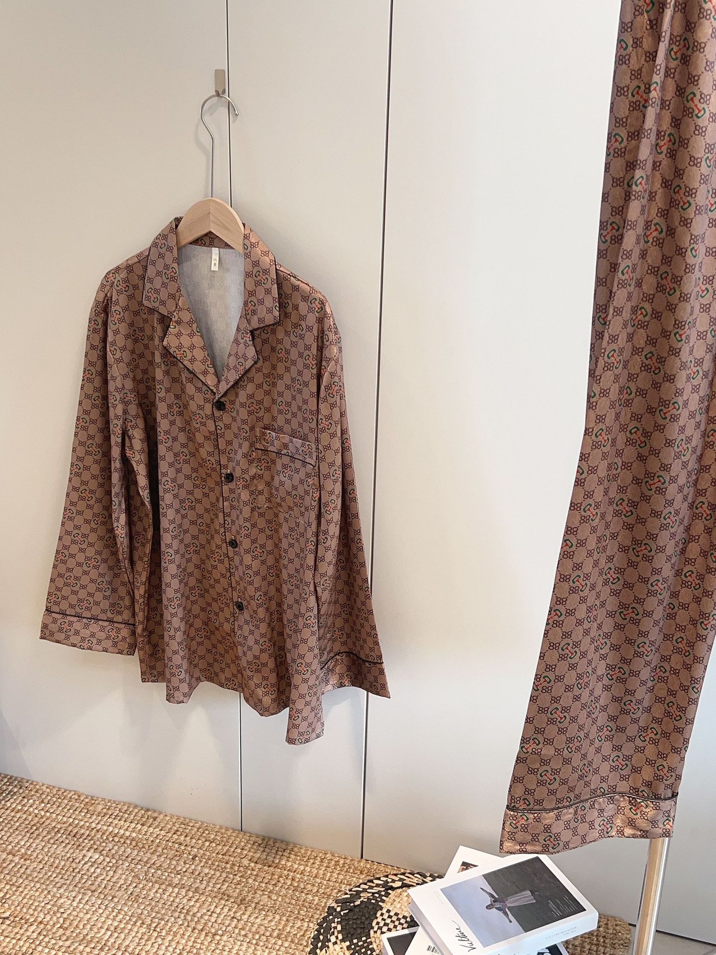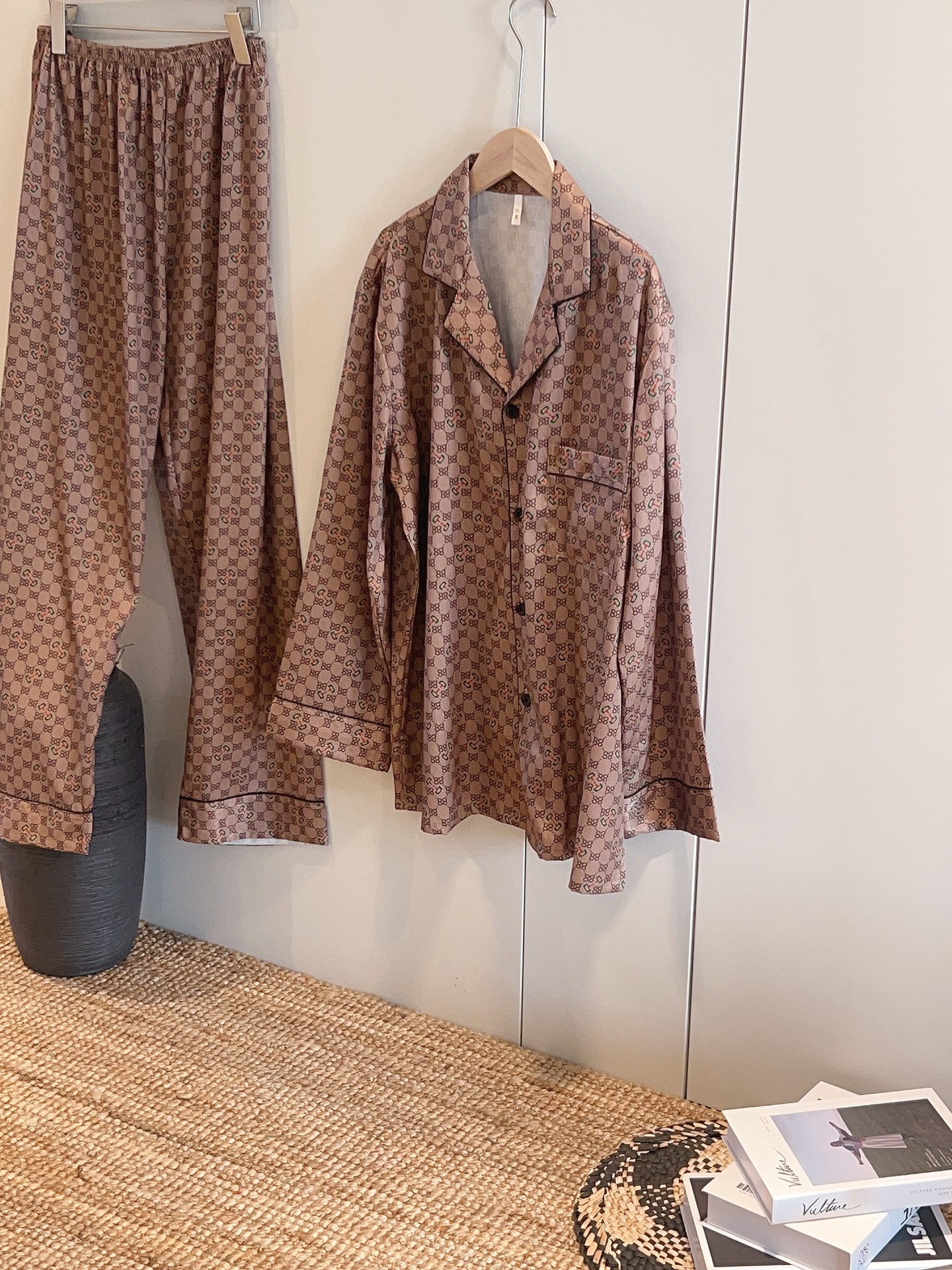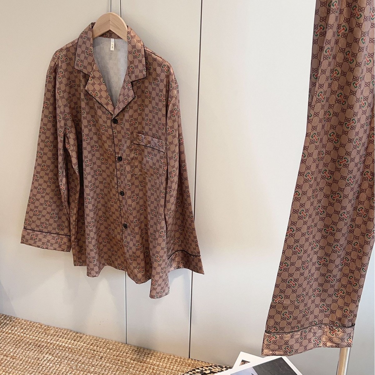 큰 브랜드 잠옷 남자 아이스 실크 옷깃 카디건 긴 소매 봄과 가을 간단한 캐주얼 여름 실크 시즌 홈 의류 세트