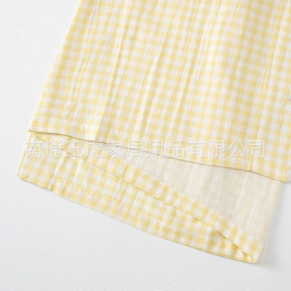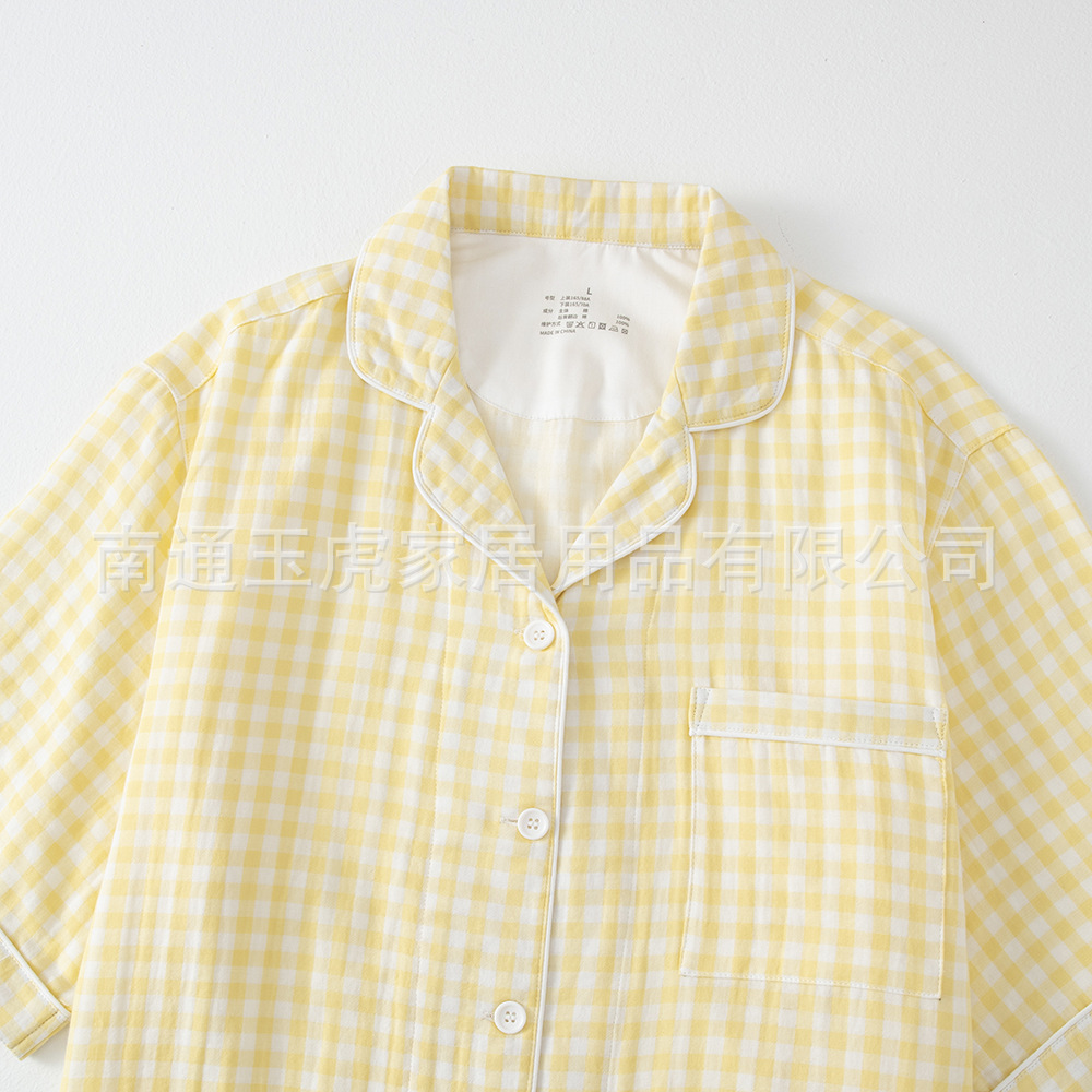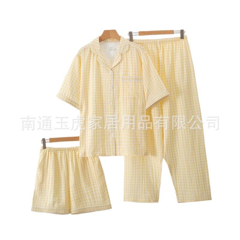순수 코튼 파자마 3 피스 여름 새로운 더블 레이어 원사 옷깃 마카롱 바지 반팔 반바지 홈웨어 세트