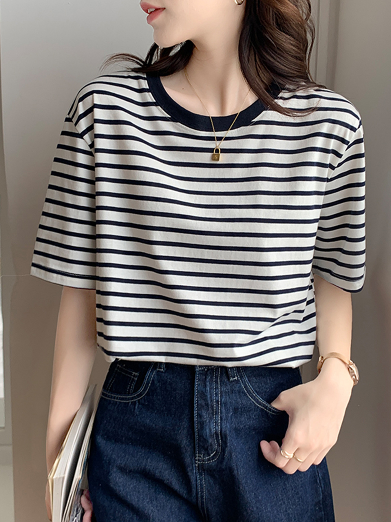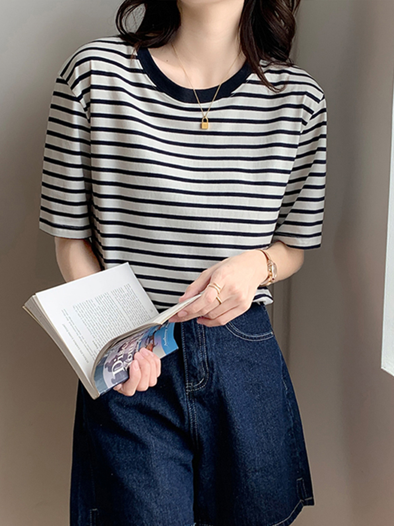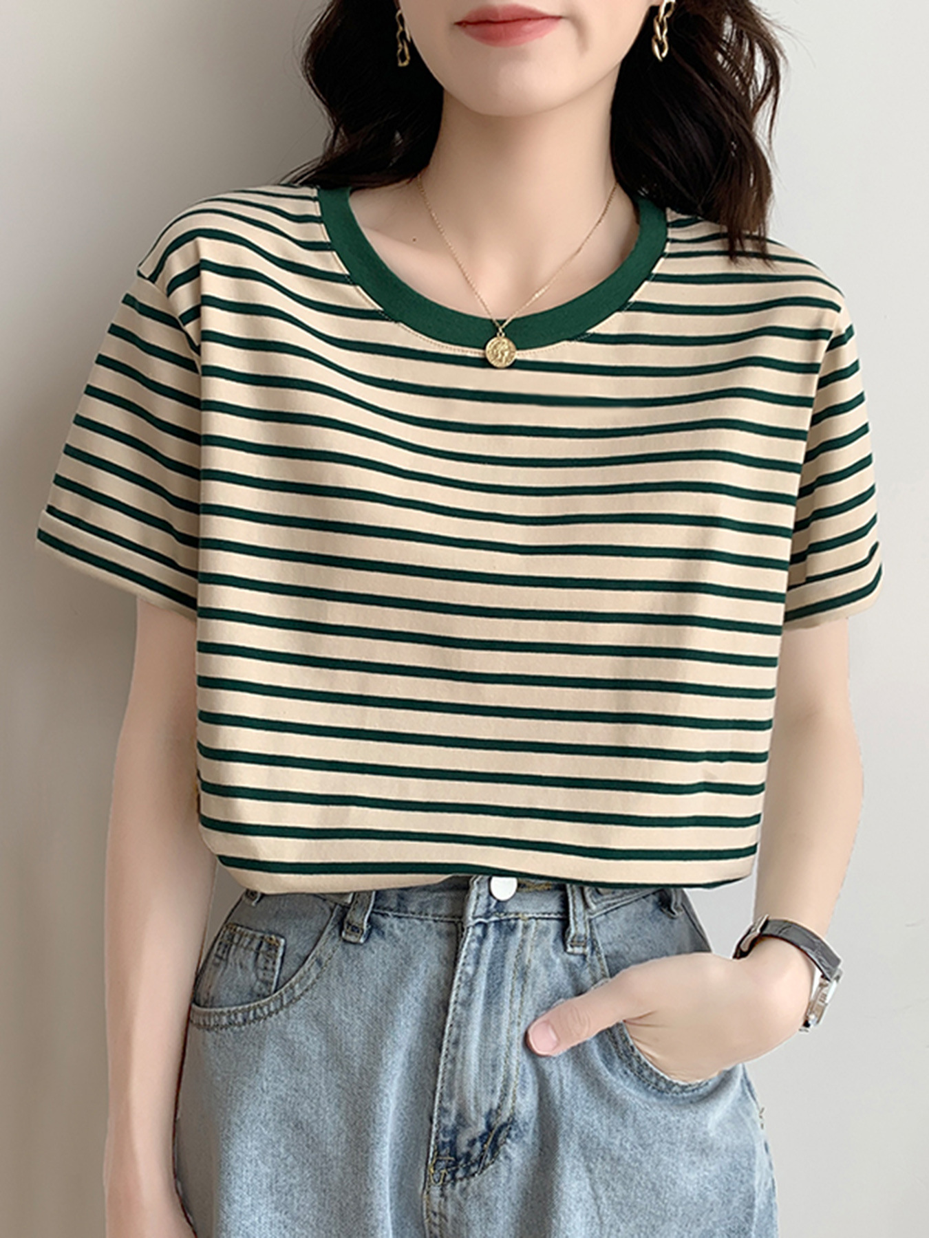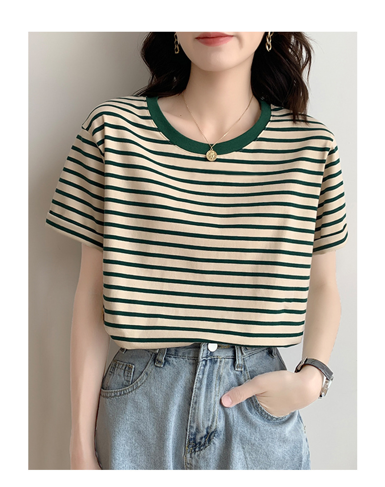 순면 반팔 가로 줄무늬 티셔츠 여성 여름 2026 신상 루즈핏 반팔 티셔츠 캐주얼 베이직 숄더탑